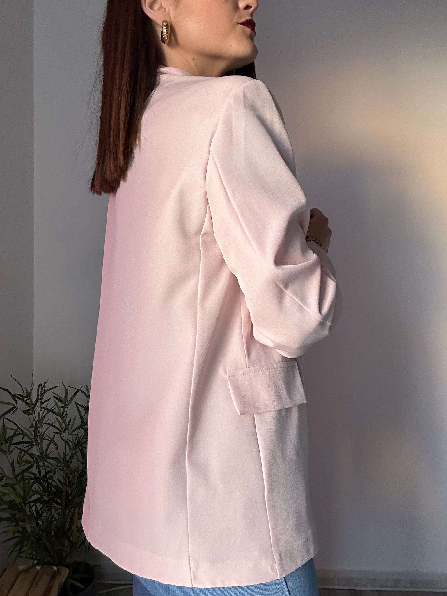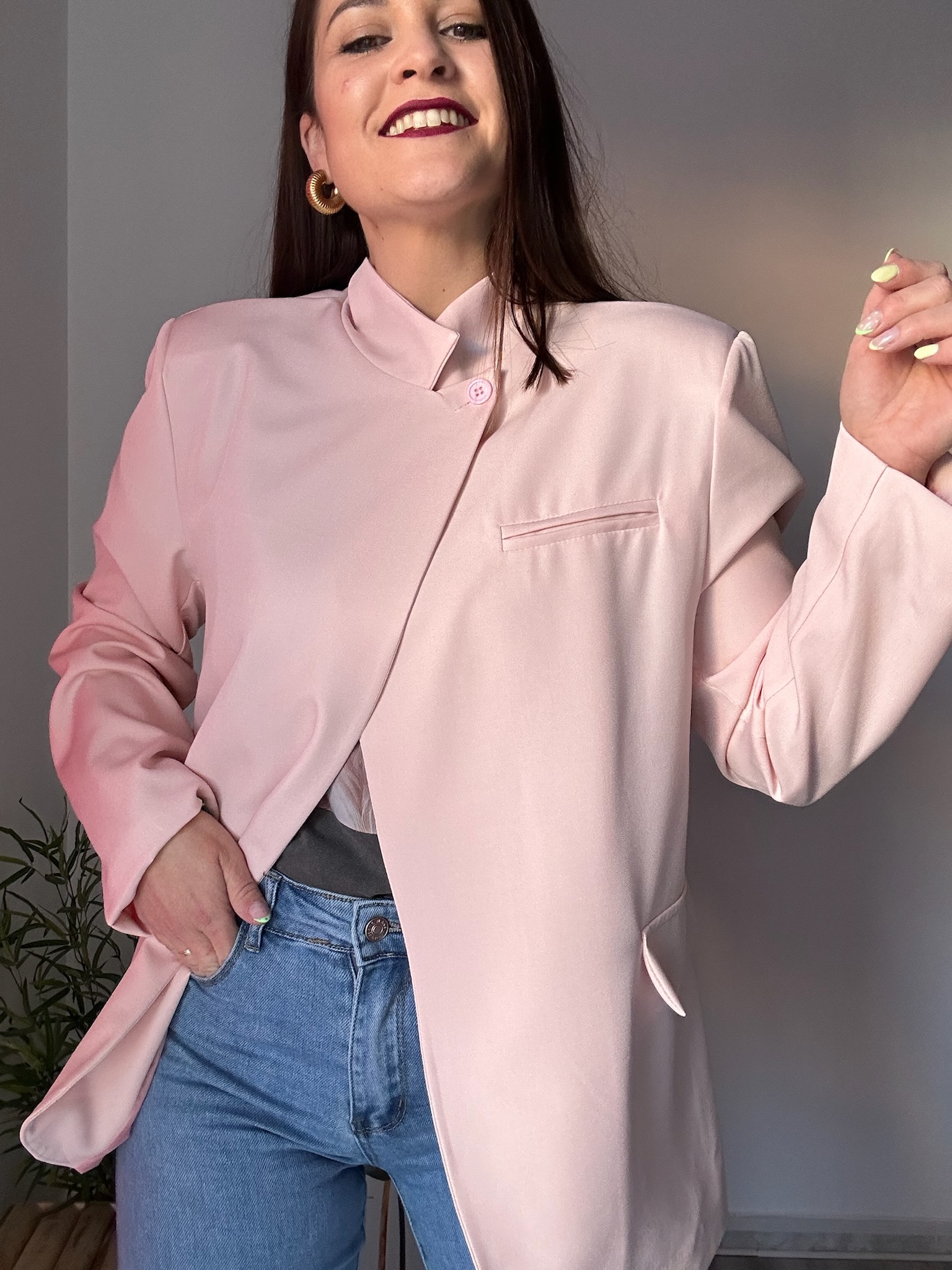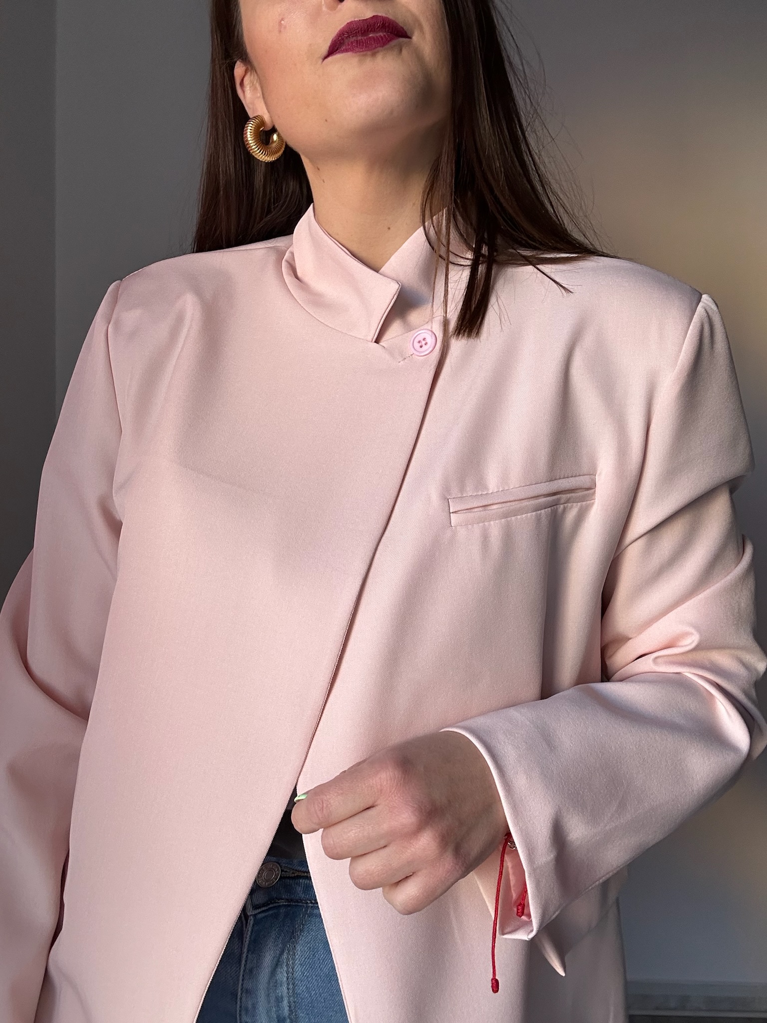 Incorpora hombreras, que estilizan la silueta y aportan un toque elegante y estructurado, ideal tanto para looks formales como para outfits más casuales con un aire sofisticado. Aunque dispone de bolsillos, estos son decorativos, manteniendo así una línea más pulida y cuidada.