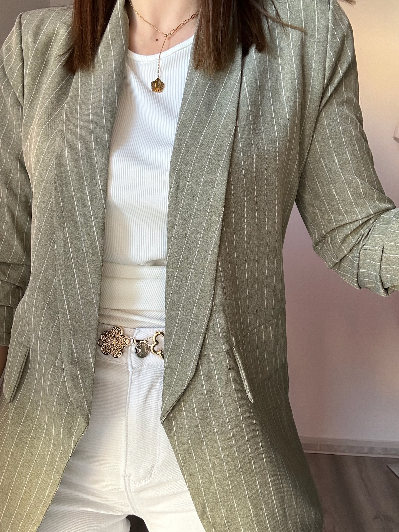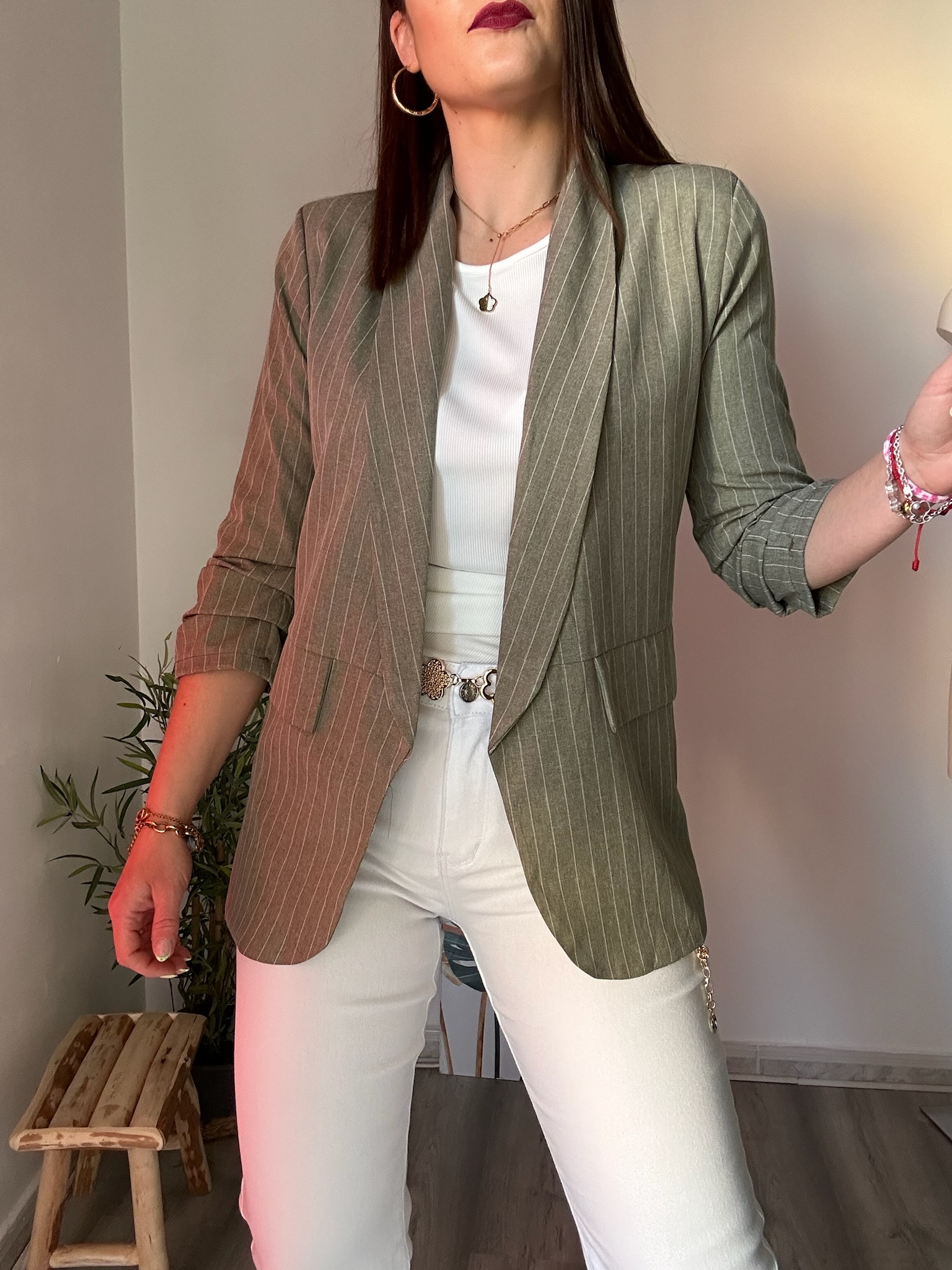 La blazer verde de raya diplomática con hombreras de La Boutique de Virgo es la prenda perfecta para conseguir un look sofisticado y actual. Su diseño atemporal con raya diplomática aporta elegancia y estiliza la silueta, convirtiéndola en una opción ideal tanto para el día a día como para ocasiones especiales.