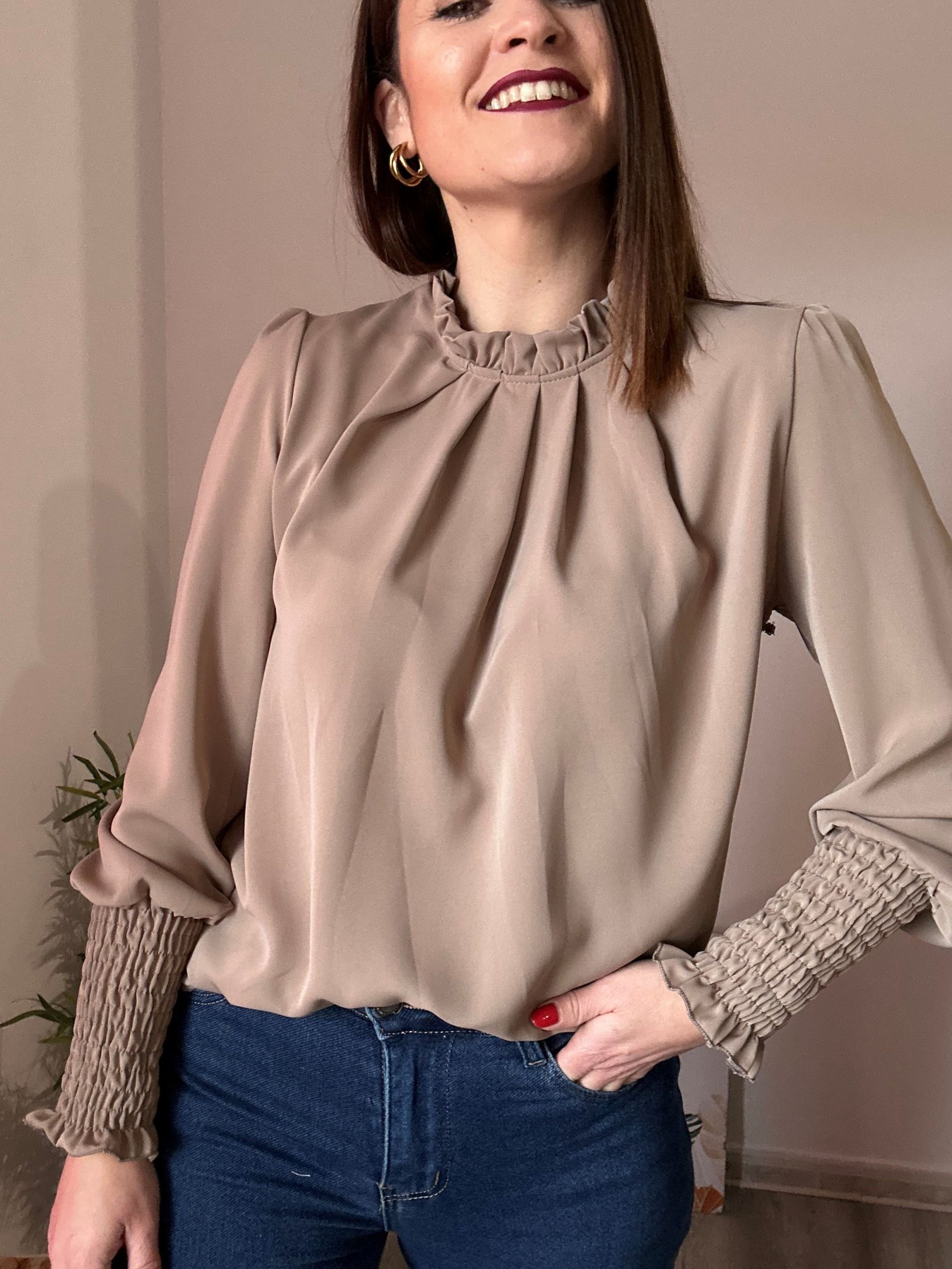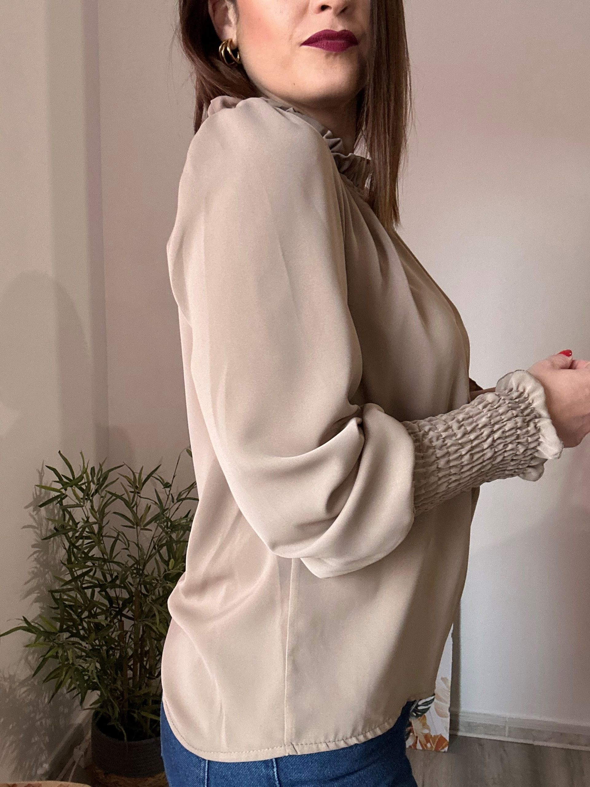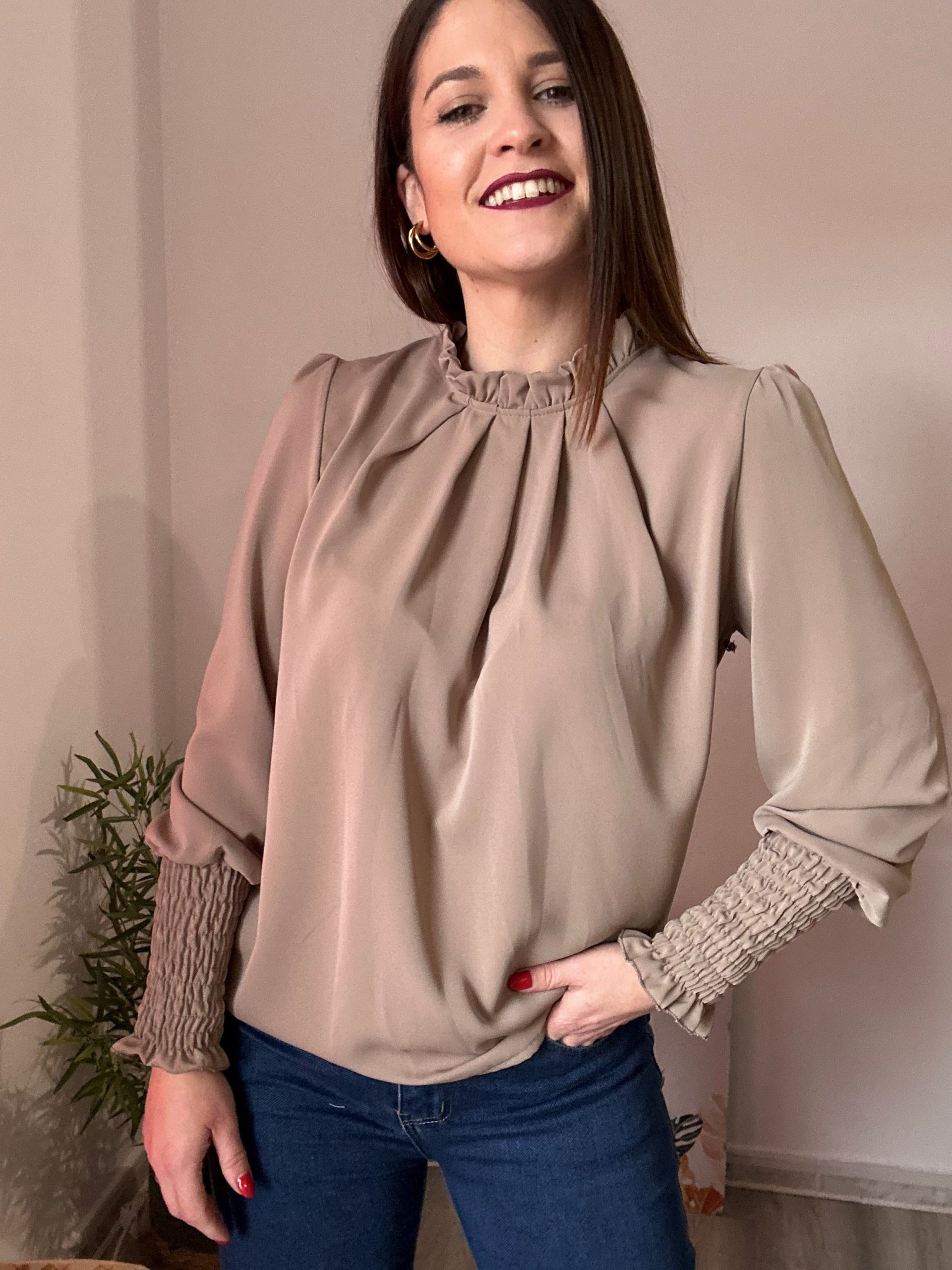 La blusa color arena con cuello rizado y detalle de tableado de La Boutique de Virgo es una prenda elegante, femenina y muy versátil, perfecta para aportar un aire sofisticado y delicado a cualquier look. Su tono arena, suave y luminoso, la convierte en un básico imprescindible que combina fácilmente con múltiples estilos y colores.