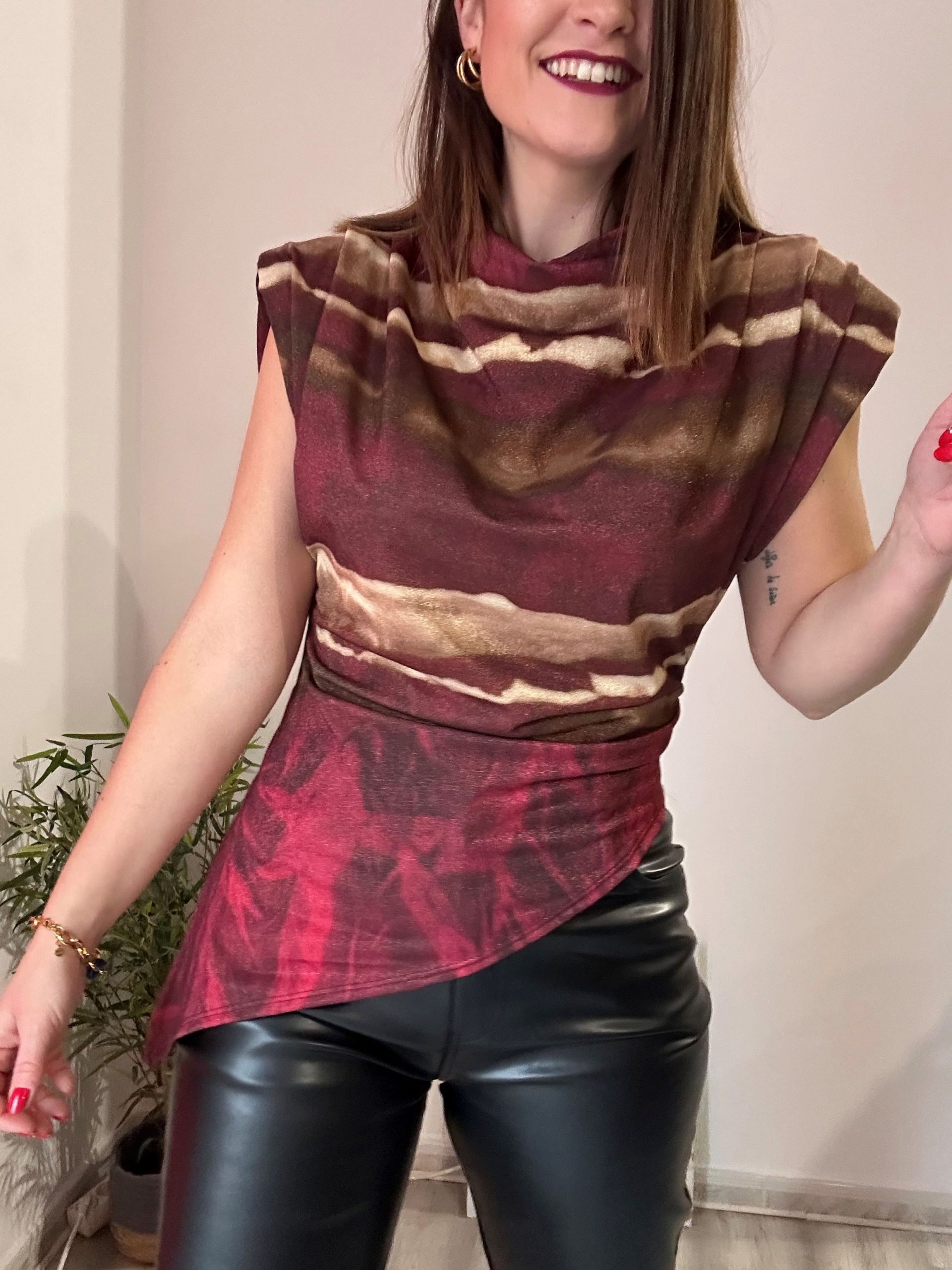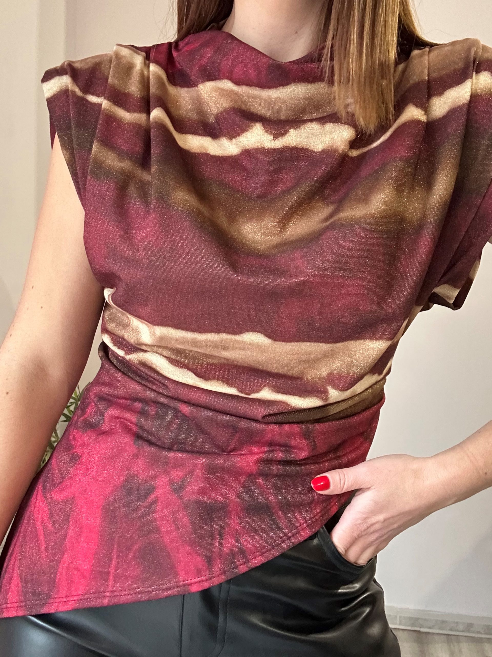 La blusa con brillo en tonos burdeos de La Boutique de Virgo es una prenda sofisticada y con mucha personalidad, ideal para elevar cualquier look con un toque elegante y actual. Su diseño destaca por una combinación de varios tonos, donde predomina el burdeos, un color intenso y favorecedor que aporta profundidad y estilo a cualquier conjunto.