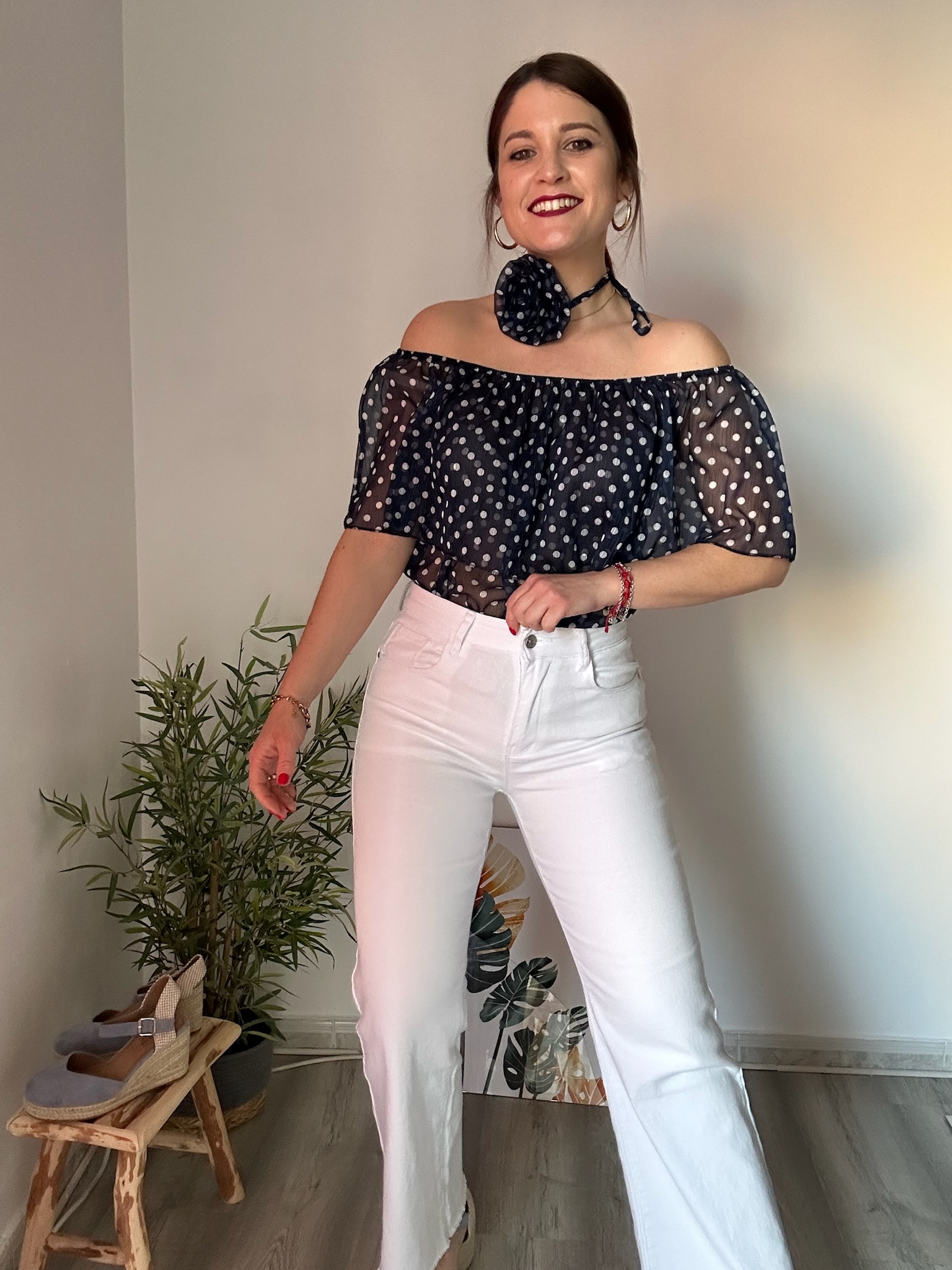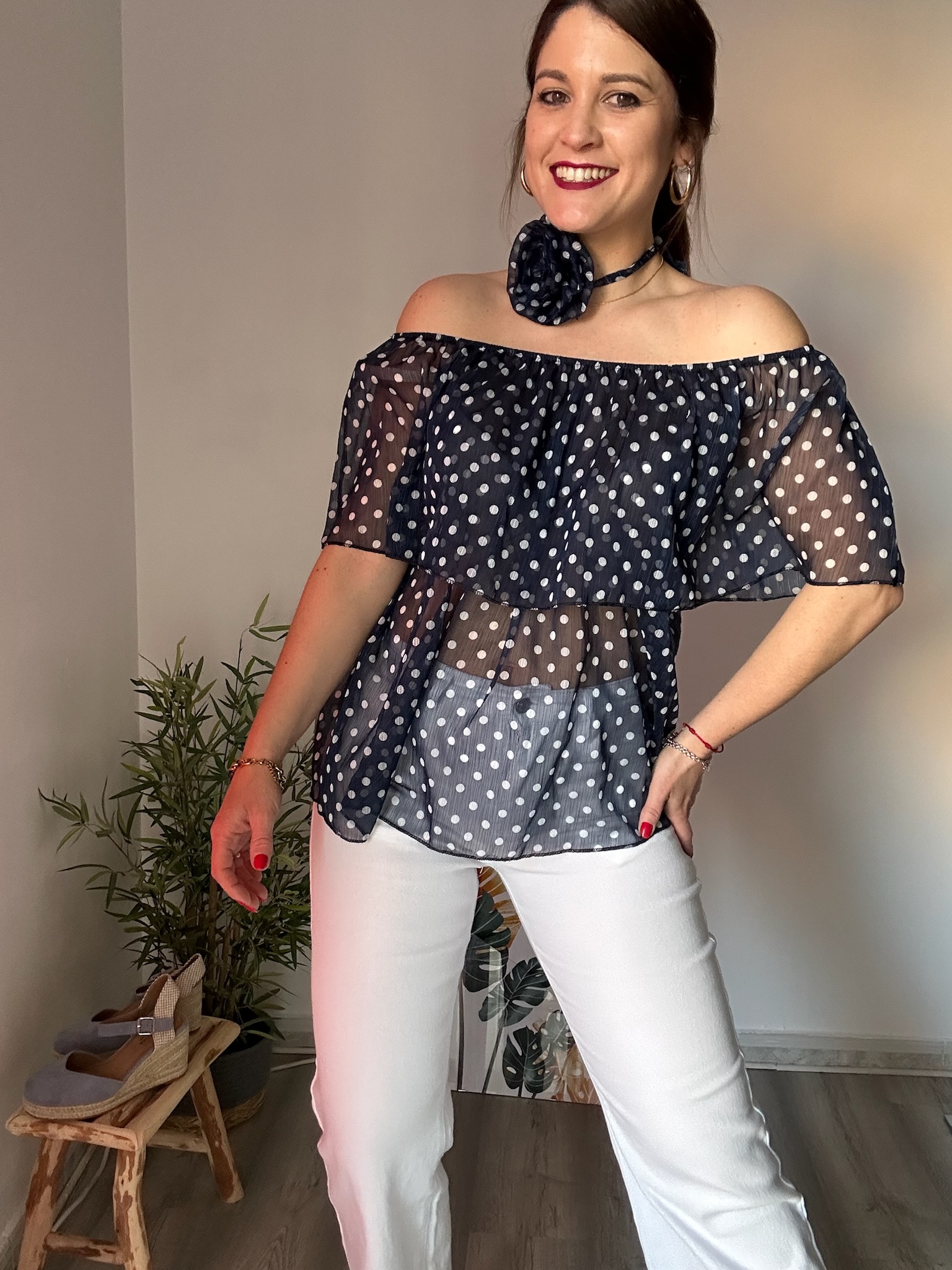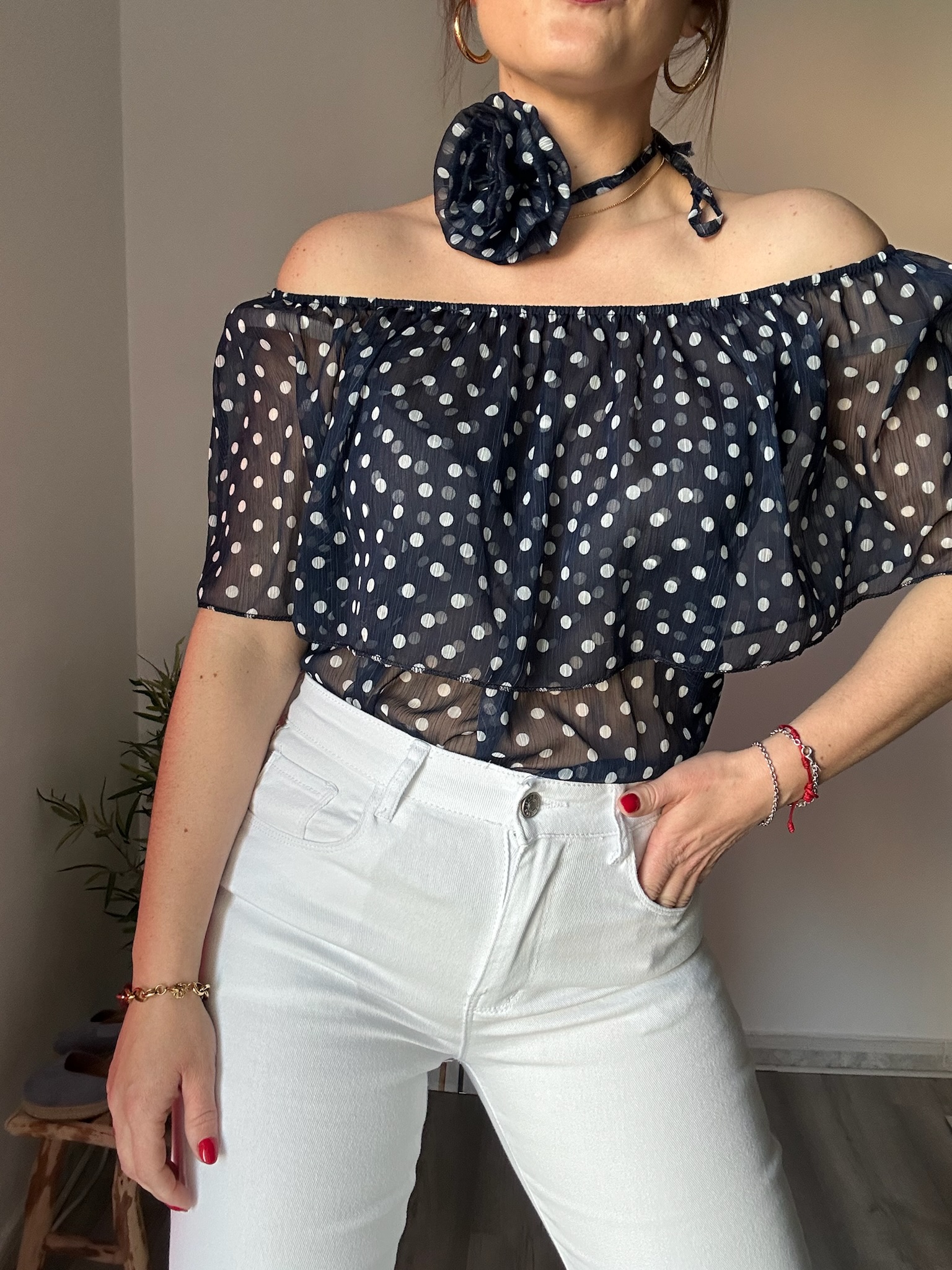 La blusa de gasa con escote bardot en color azul marino de La Boutique de Virgo es una prenda imprescindible para quienes buscan un estilo femenino, elegante y con un toque romántico. Su clásico estampado de lunares blancos aporta frescura y sofisticación, convirtiéndola en una opción perfecta tanto para el día como para ocasiones especiales.