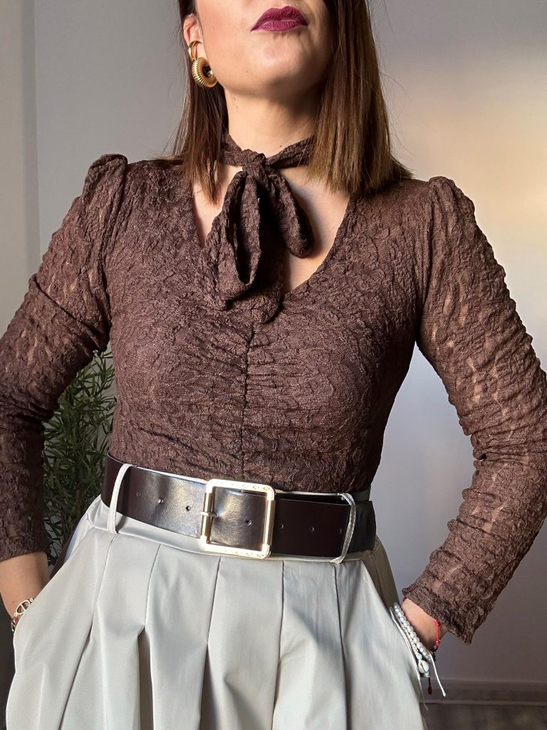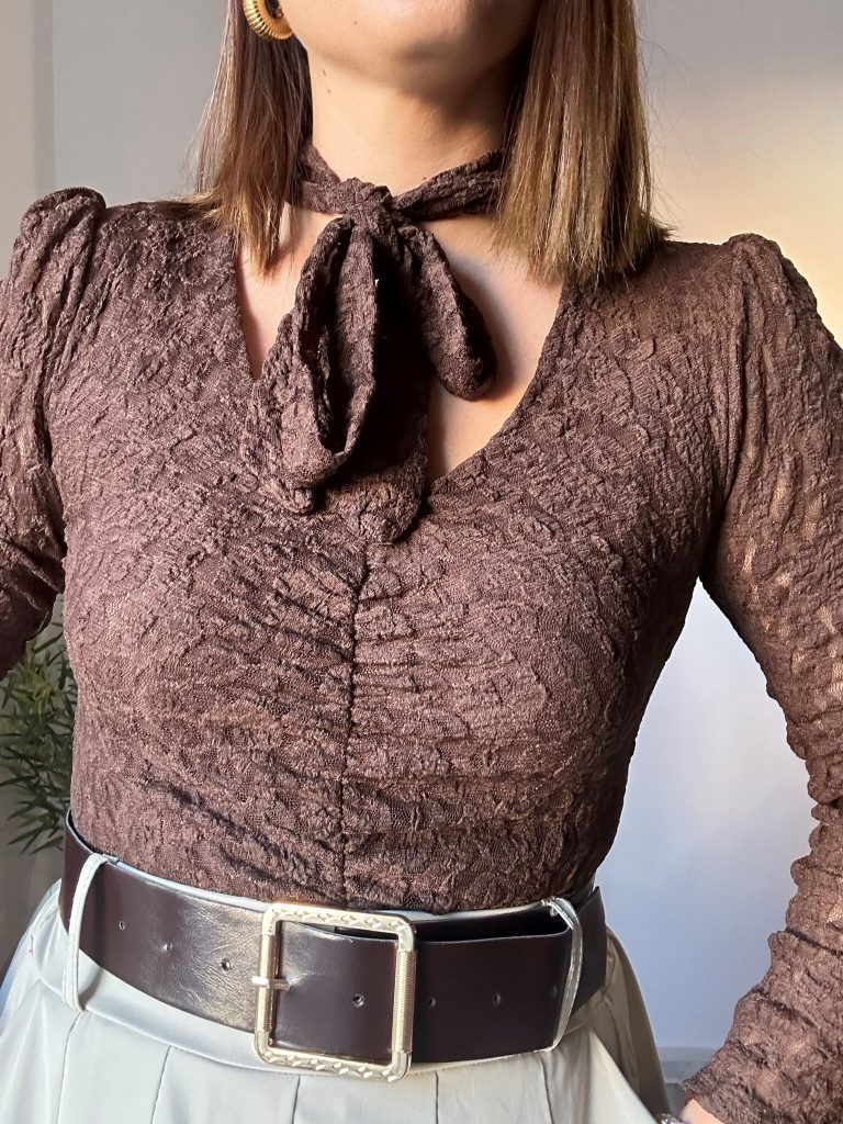 La blusa de encaje marrón con lazada es una apuesta segura para quienes buscan prendas con personalidad, delicadeza y estilo atemporal, ideales para expresar elegancia en cualquier ocasión.