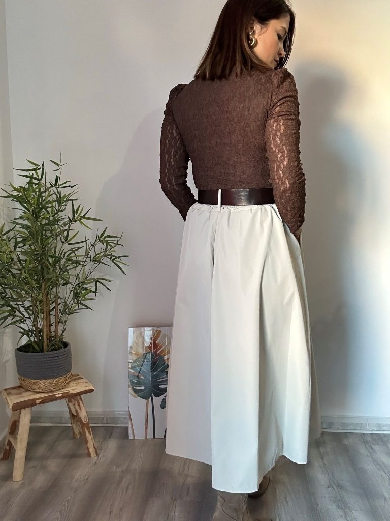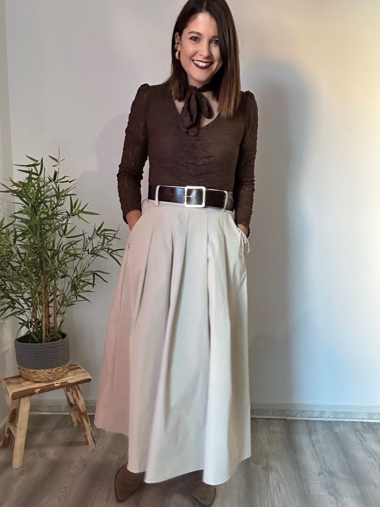 El color marrón la convierte en una prenda neutra pero sofisticada, muy fácil de combinar con tonos beige, negros, camel o incluso colores más vibrantes para darle contraste. Está pensada para ser una pieza especial que eleve cualquier estilismo, tanto de día como de noche.