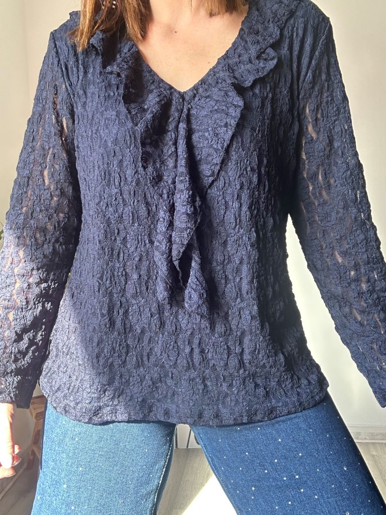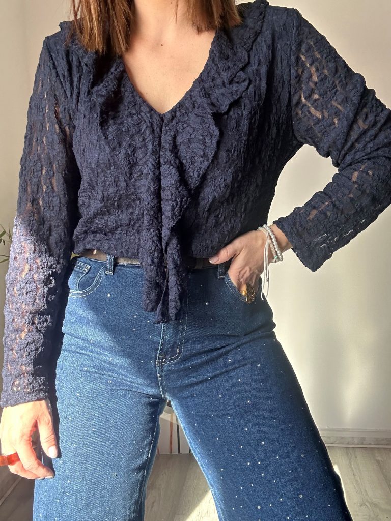 La blusa de encaje azul marino es una prenda que reúne elegancia, romanticismo y sofisticación en un diseño atemporal que se adapta a distintas ocasiones. Su principal atractivo es el escote a pico adornado con dos volantes laterales, que aportan movimiento y un aire delicado y femenino al look.