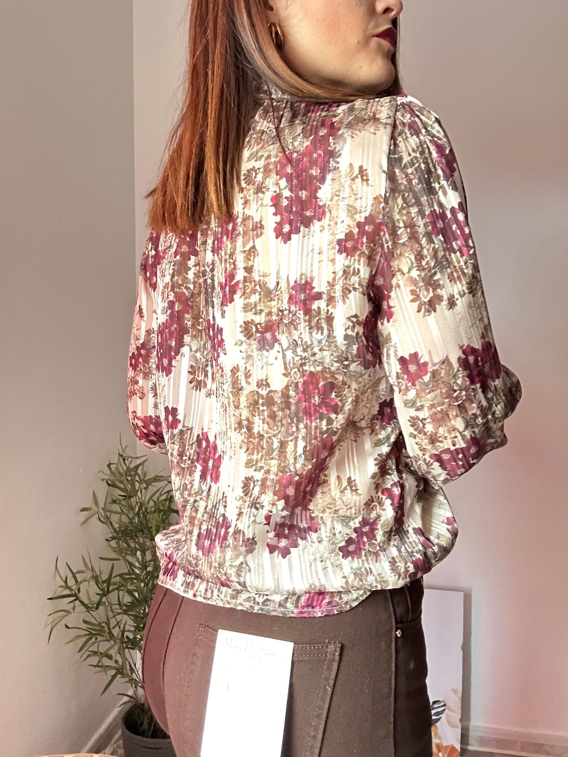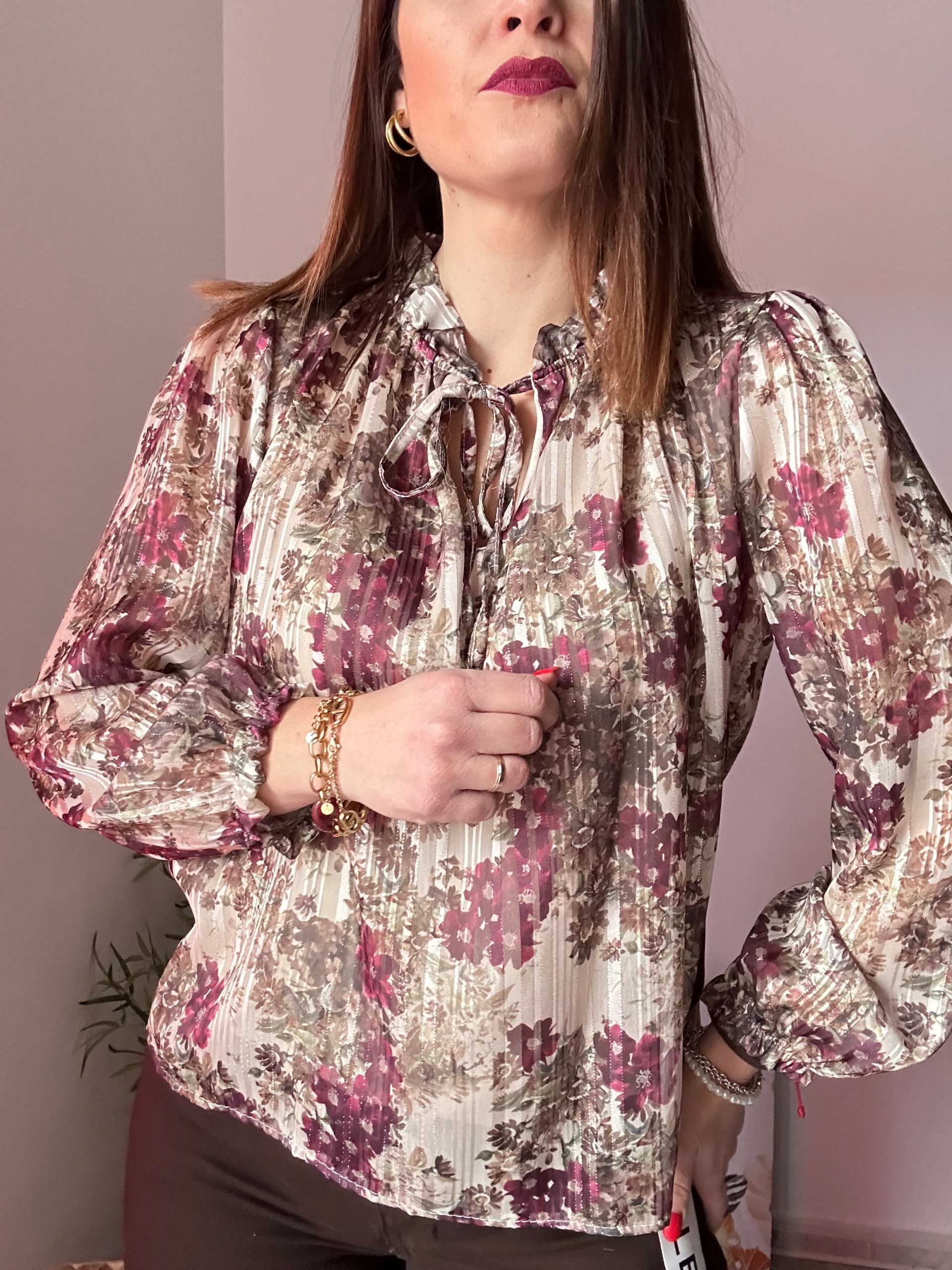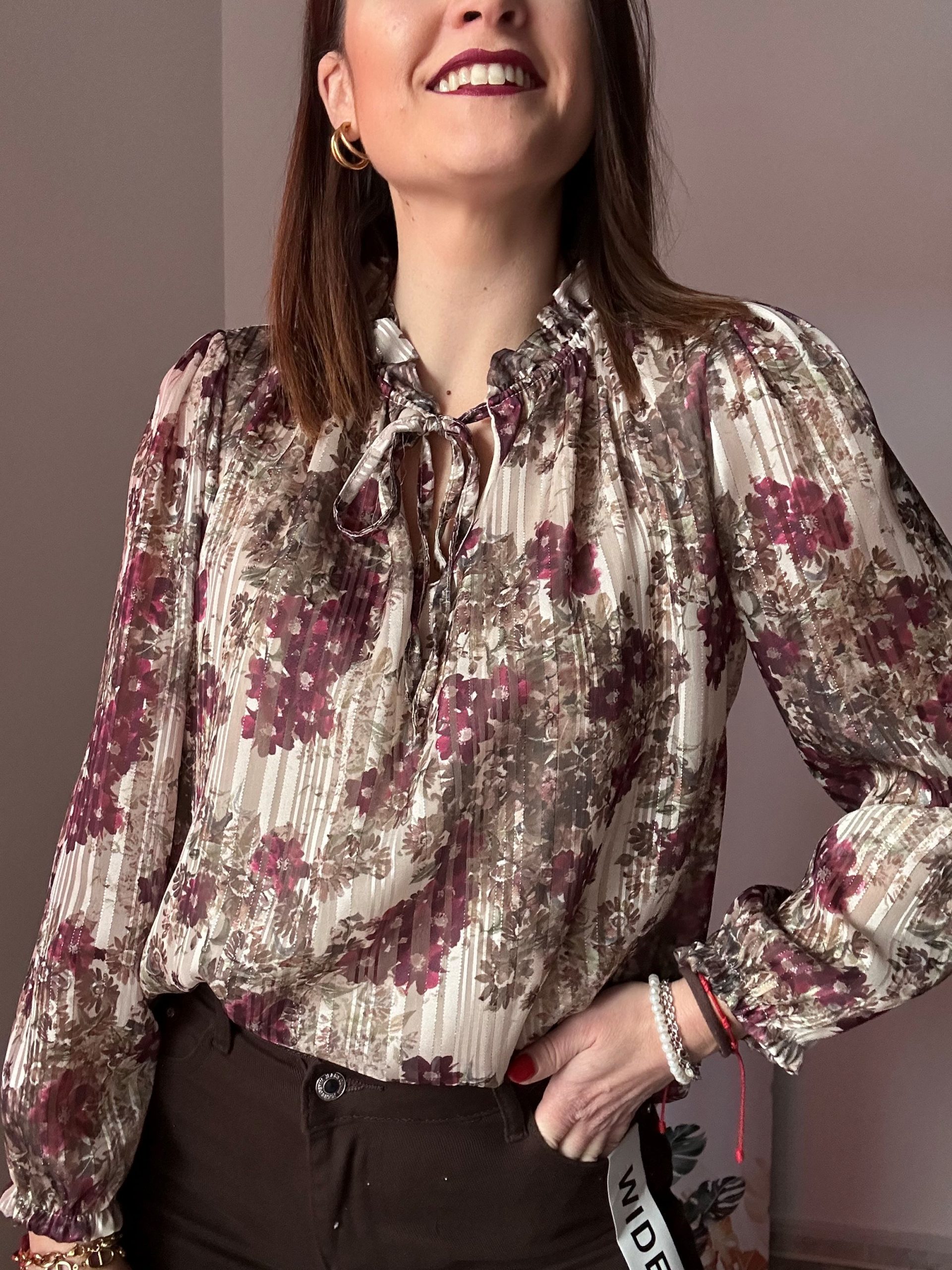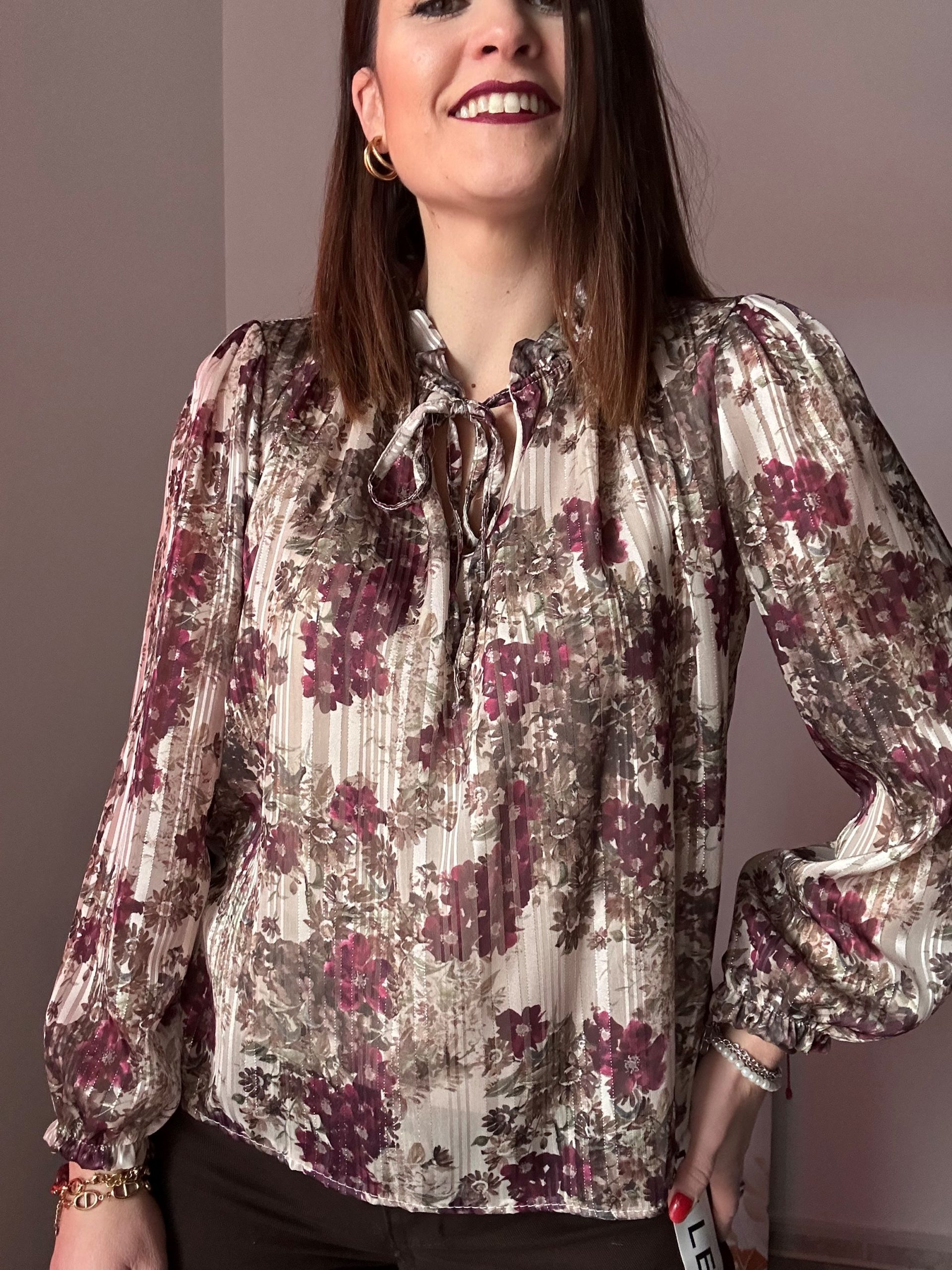 La blusa de flores en tono crudo con detalles burdeos de La Boutique de Virgo es una prenda femenina, elegante y con un toque romántico que eleva cualquier look diario o de ocasión especial. Su fondo en color crudo crea una base suave y favorecedora, mientras que el estampado de flores burdeos aporta contraste, estilo y un aire sofisticado. Además, pequeños destellos de brillo integrados en el tejido le dan un acabado delicado y luminoso, perfecto para destacar sin exagerar.