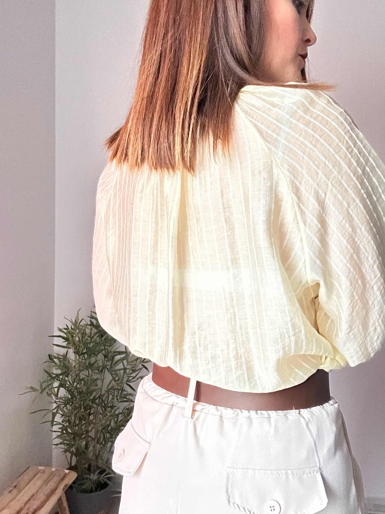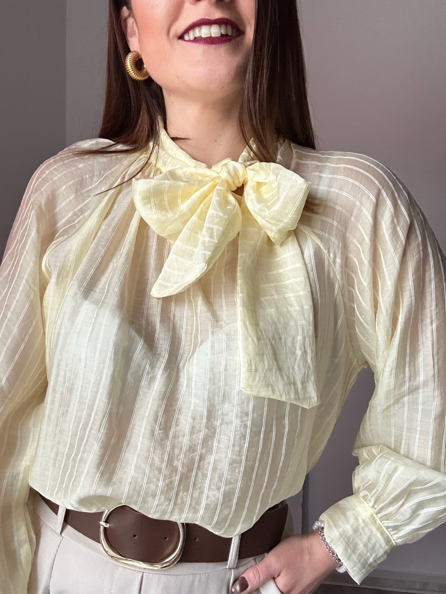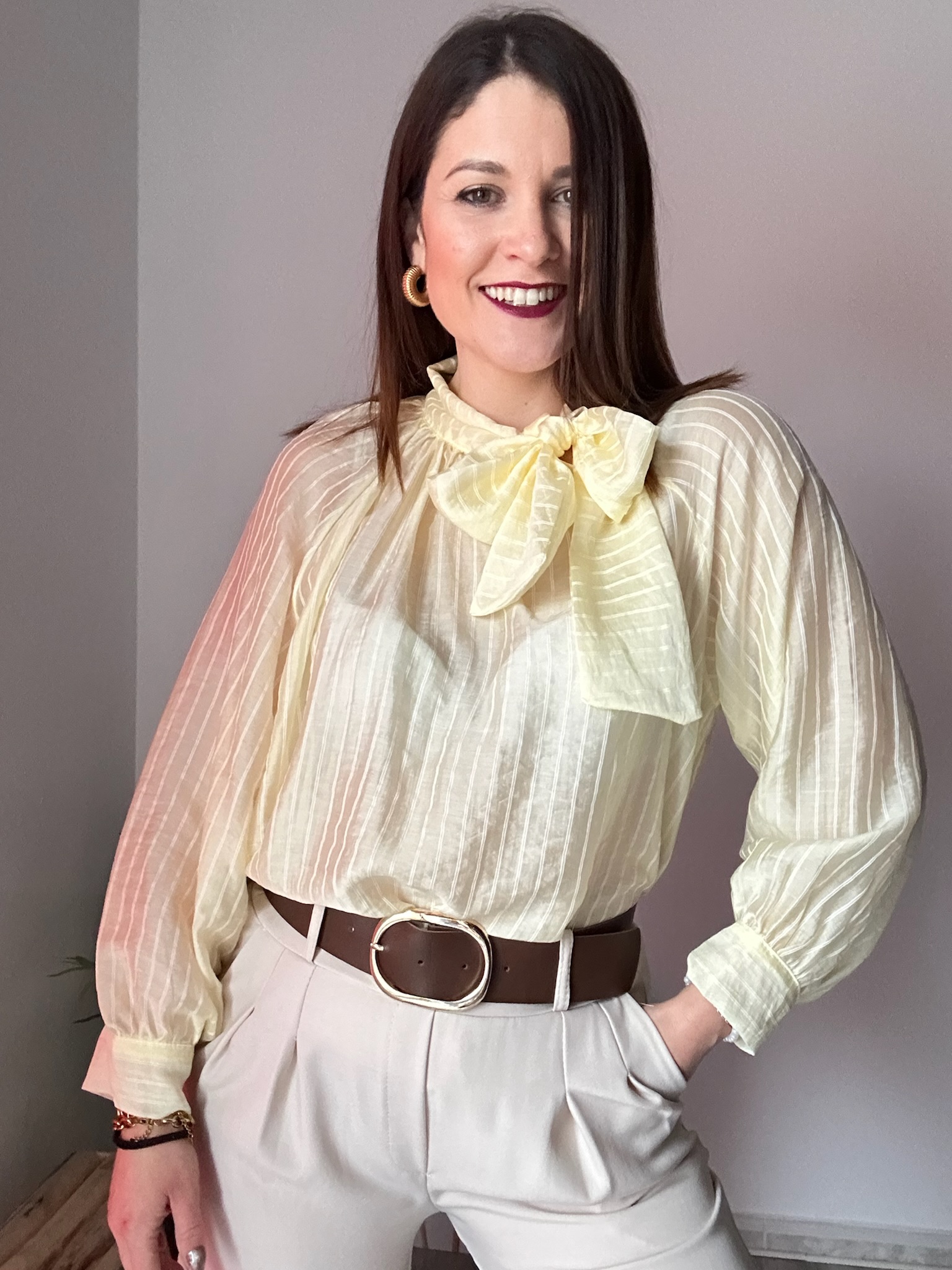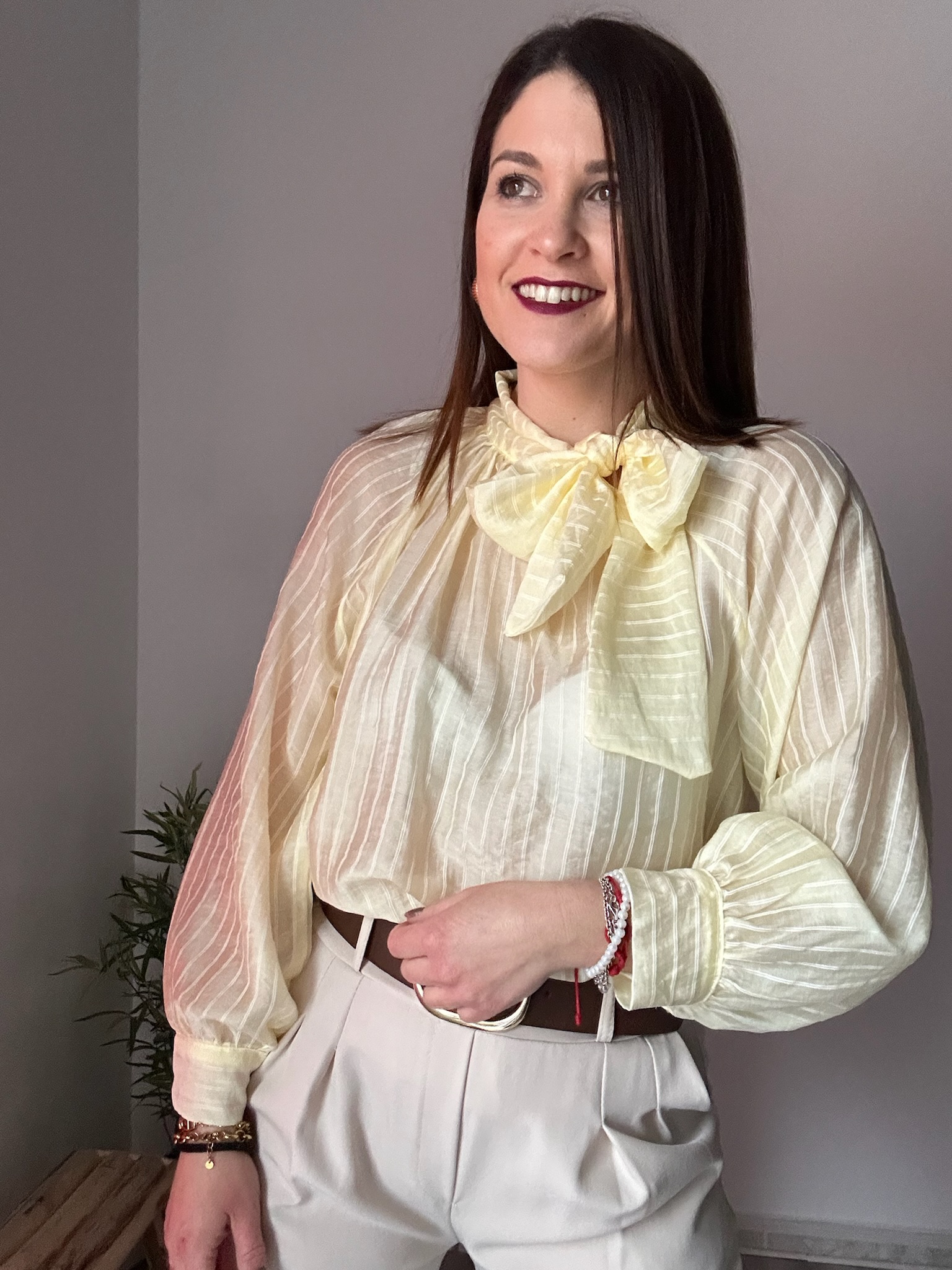 En La Boutique de Virgo, seleccionamos moda femenina pensada para mujeres que valoran calidad, diseño y tendencia. Esta blusa amarillo pastel con rayas blancas y lazo está disponible tanto en nuestra tienda física como en la tienda online, convirtiéndose en una pieza clave para cualquier armario moderno.