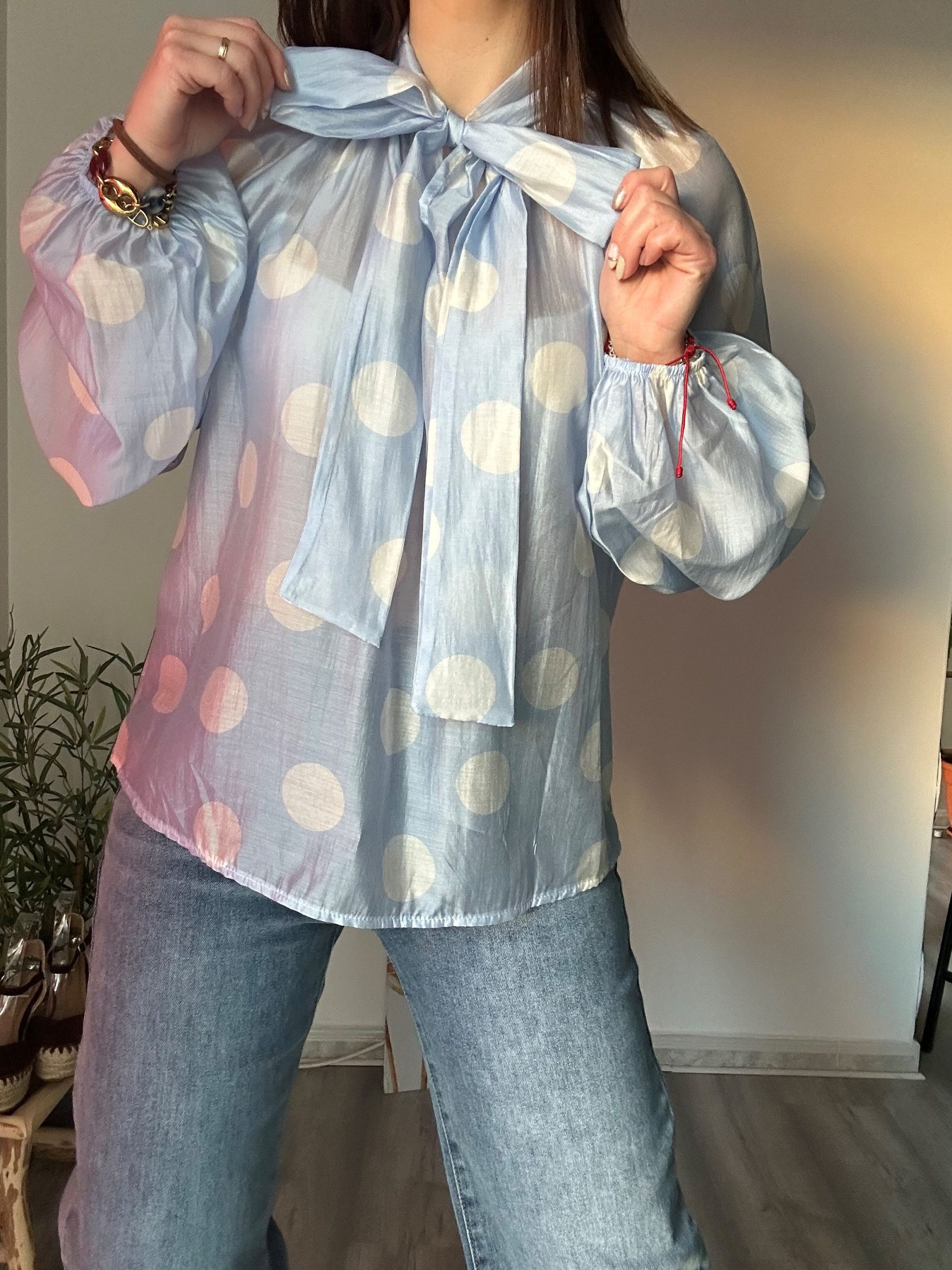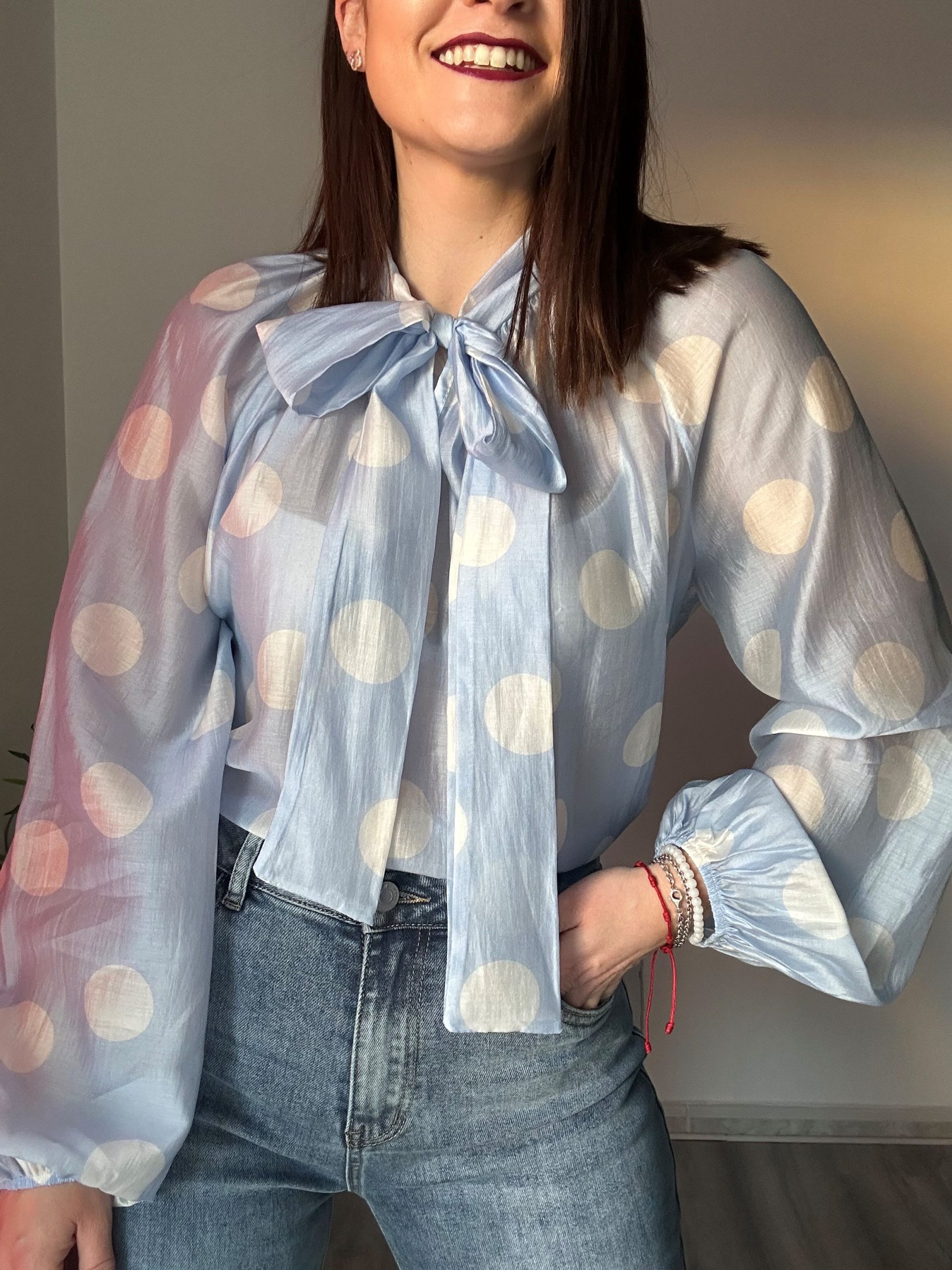 La blusa de lunares blancos para mujer de La Boutique de Virgo es una prenda elegante y delicada que aporta un toque sofisticado a cualquier look. Su diseño combina el clásico estampado de lunares blancos con un favorecedor detalle de lazo en el cuello, creando una silueta femenina y actual.