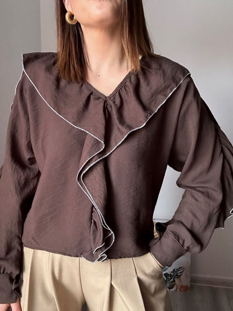 La blusa marrón con detalles de volantes es una prenda que aporta feminidad, elegancia y un toque romántico a cualquier look. Su diseño combina a la perfección la sutileza de los volantes con la versatilidad del color marrón, creando una pieza ideal para todo tipo de ocasiones.