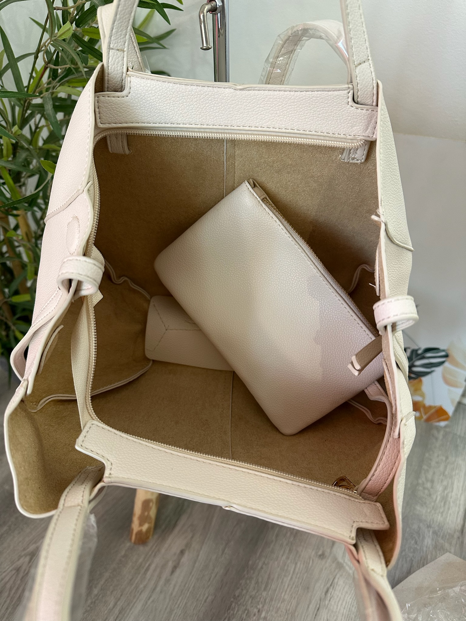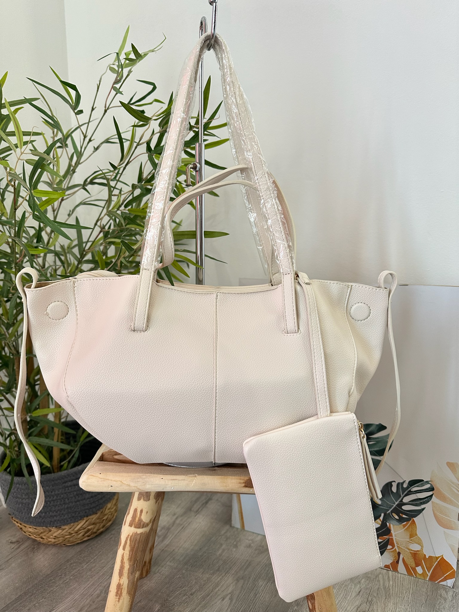 Bolso color crema de estilo minimalista, elegante y versátil. Su diseño permite llevarlo en formato compacto o ampliado gracias a sus imanes laterales. Incluye neceser interior con cremallera y dos asas intercambiables. Un básico atemporal, sofisticado y funcional para cualquier ocasión.