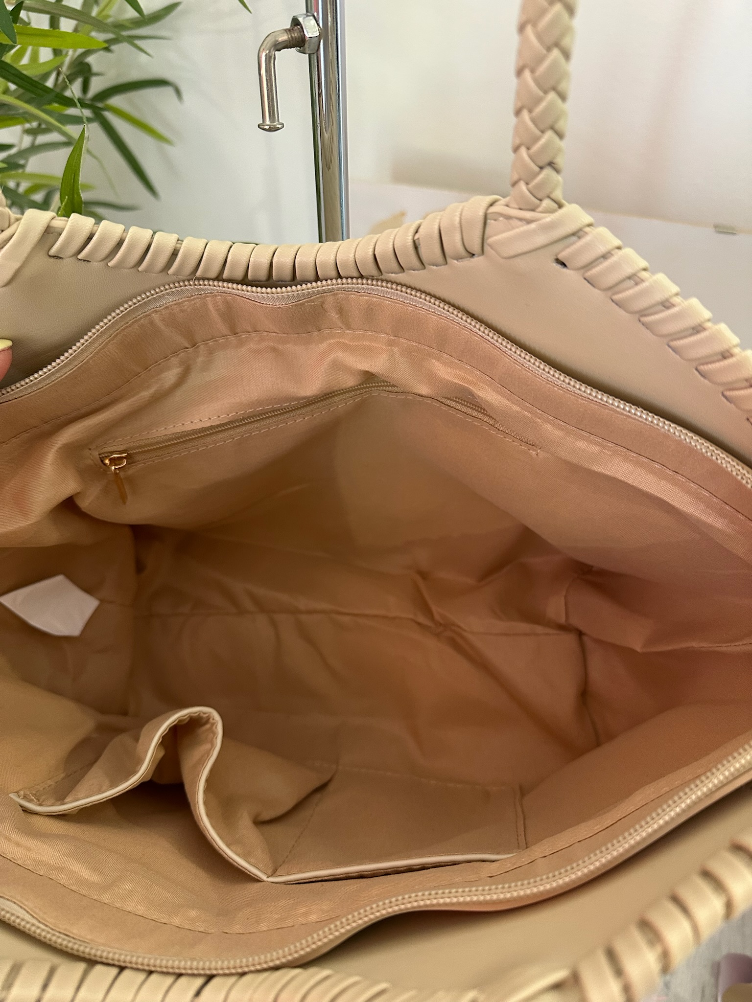 Bolso grande trenzado en color crema, elegante y versátil. Con asa redonda, interior forrado y cierre de cremallera. Confeccionado en materiales de alta calidad, es perfecto para el día a día gracias a su amplitud y estilo sofisticado.
