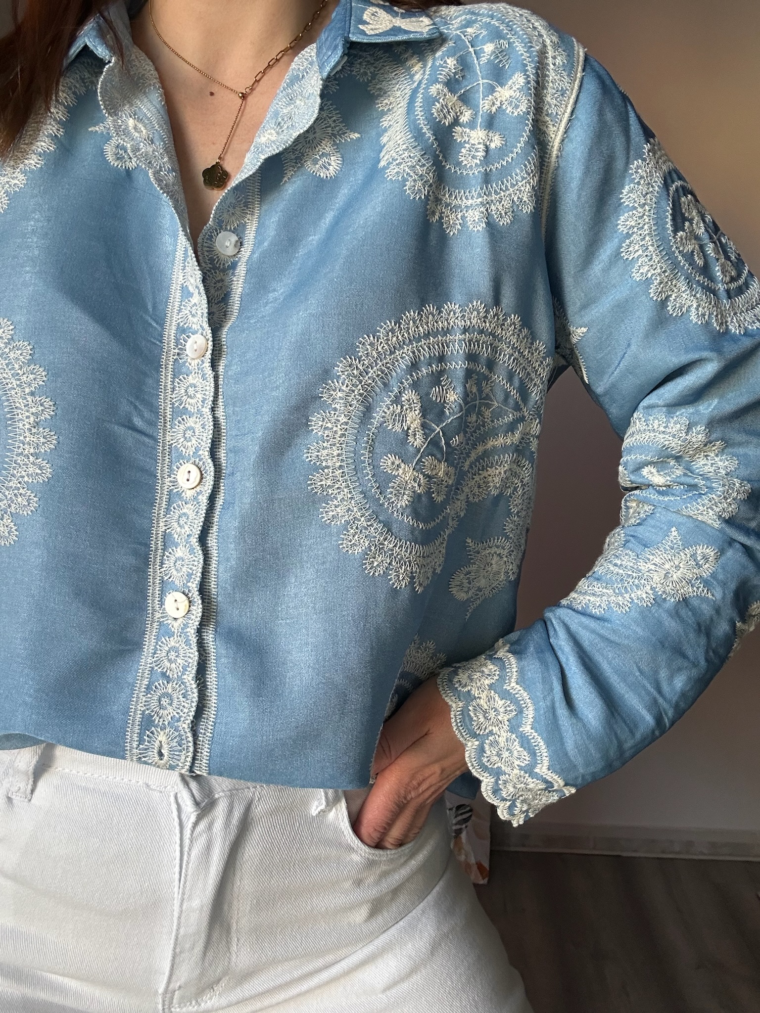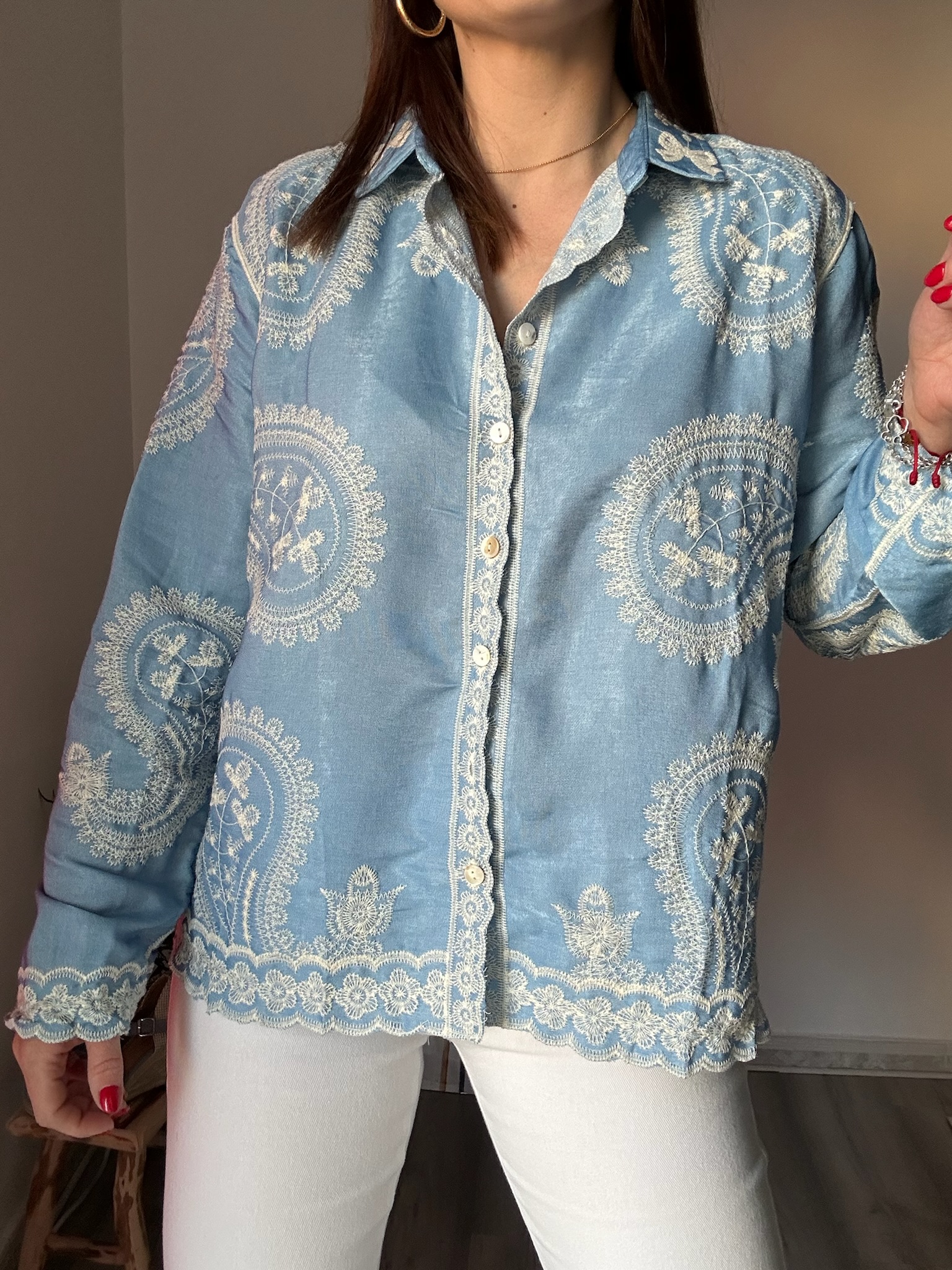 Diseñada con delicados bordados en color crudo, esta camisa destaca por sus detalles cuidados que aportan un toque romántico y sofisticado. El cierre frontal con botones permite llevarla tanto cerrada como abierta, adaptándose a diferentes estilos y ocasiones. Es ideal para combinar con vaqueros, pantalones fluidos o faldas, convirtiéndose en una pieza clave en tu armario.