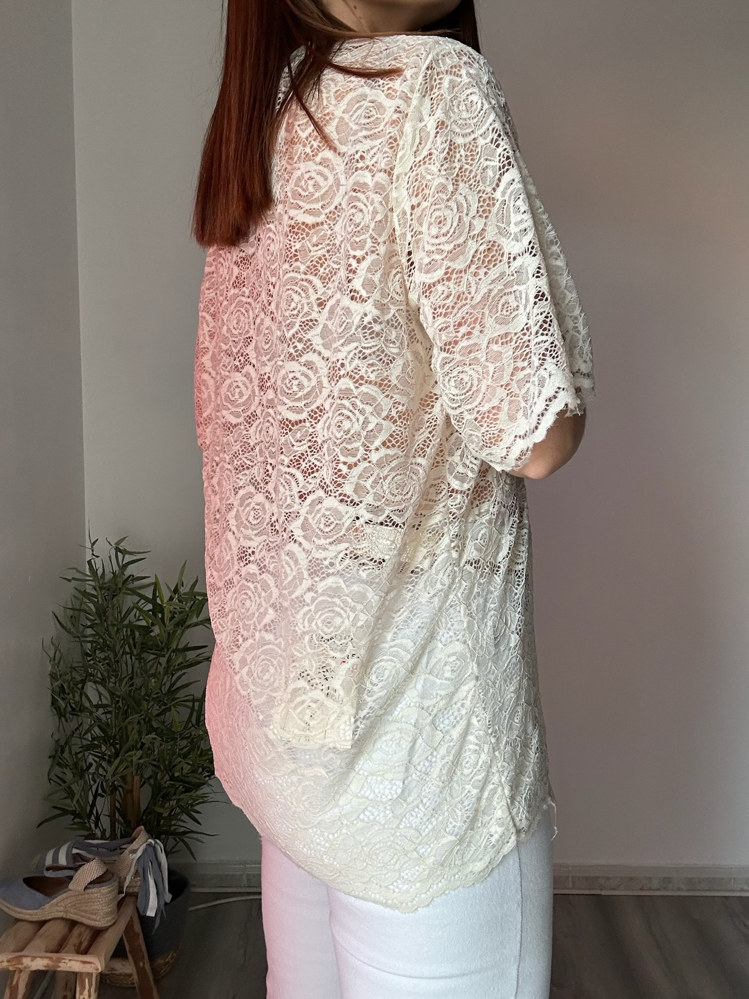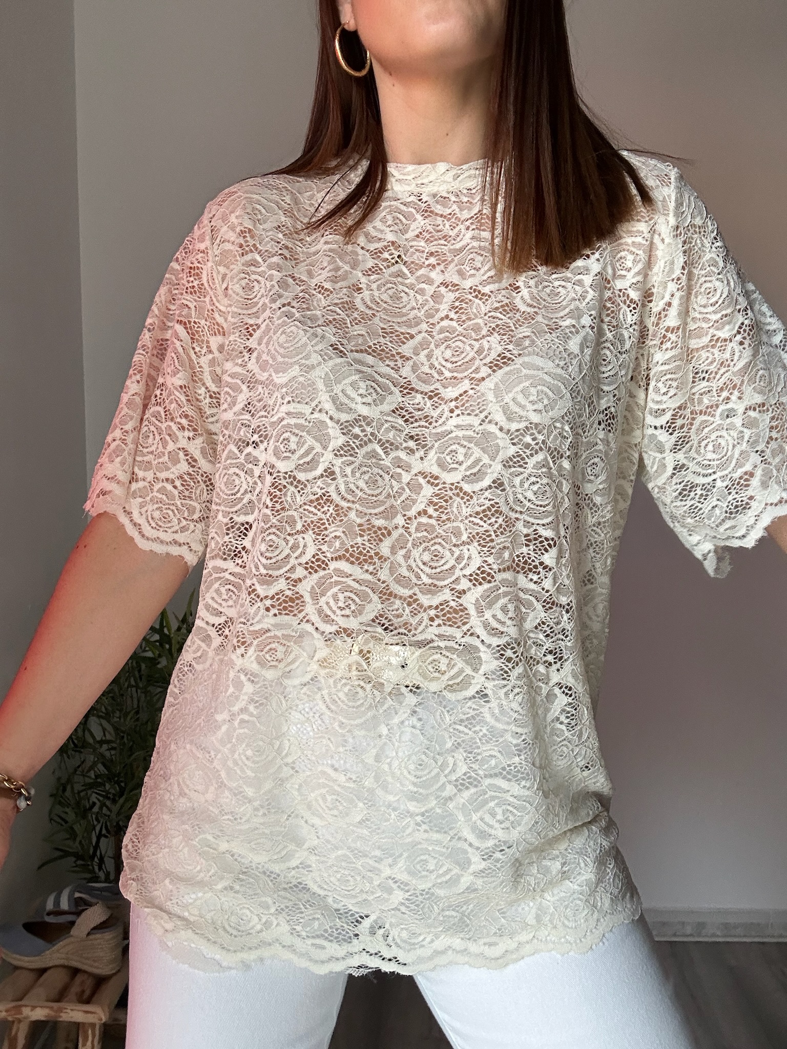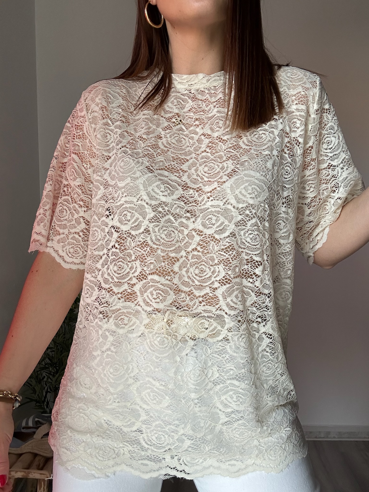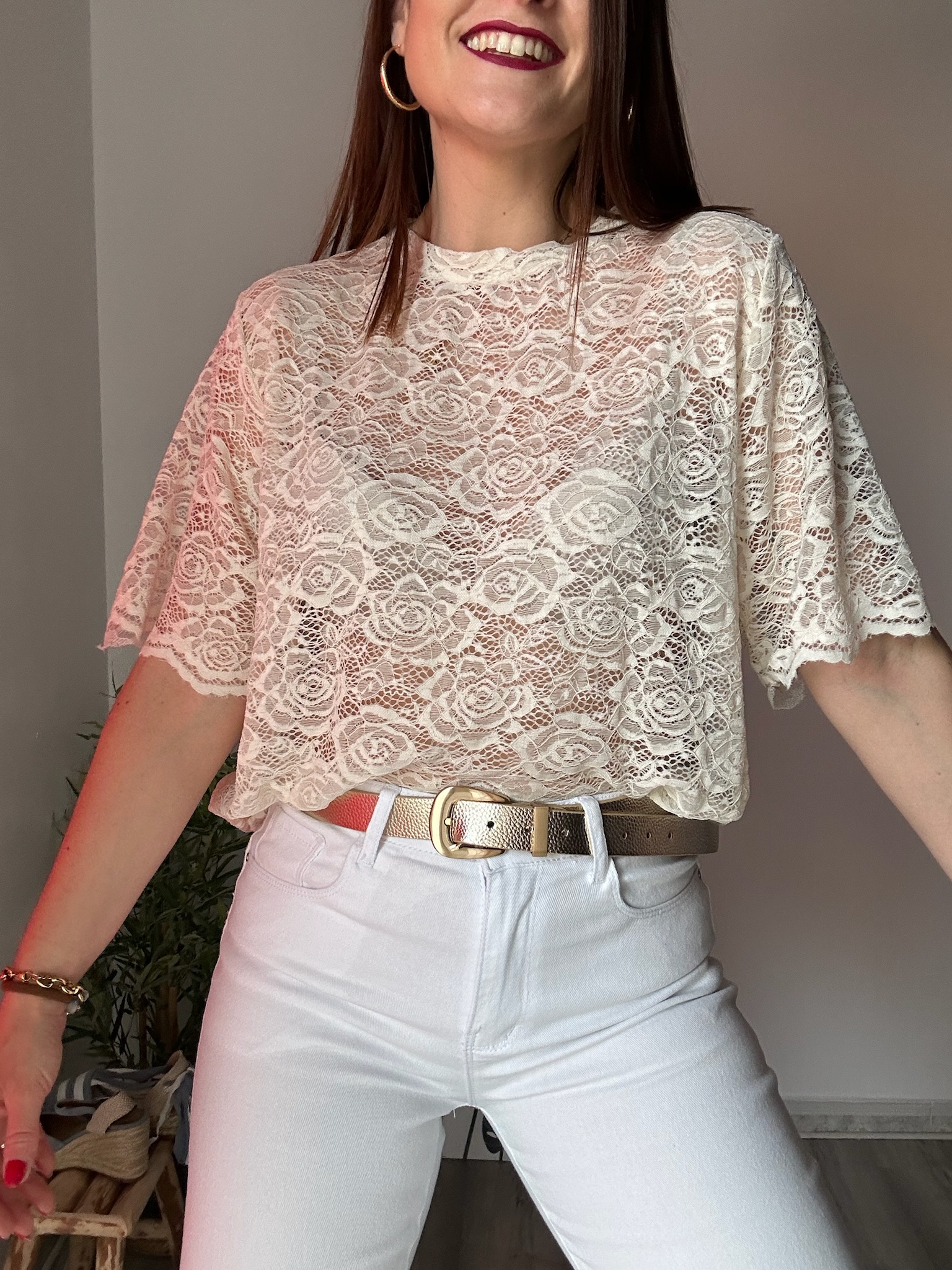El encaje, con un acabado cuidado y detallado, aporta textura y estilo, creando un efecto visual muy atractivo. Su color beige, suave y versátil, facilita su combinación con todo tipo de prendas, desde jeans hasta faldas o pantalones más formales.