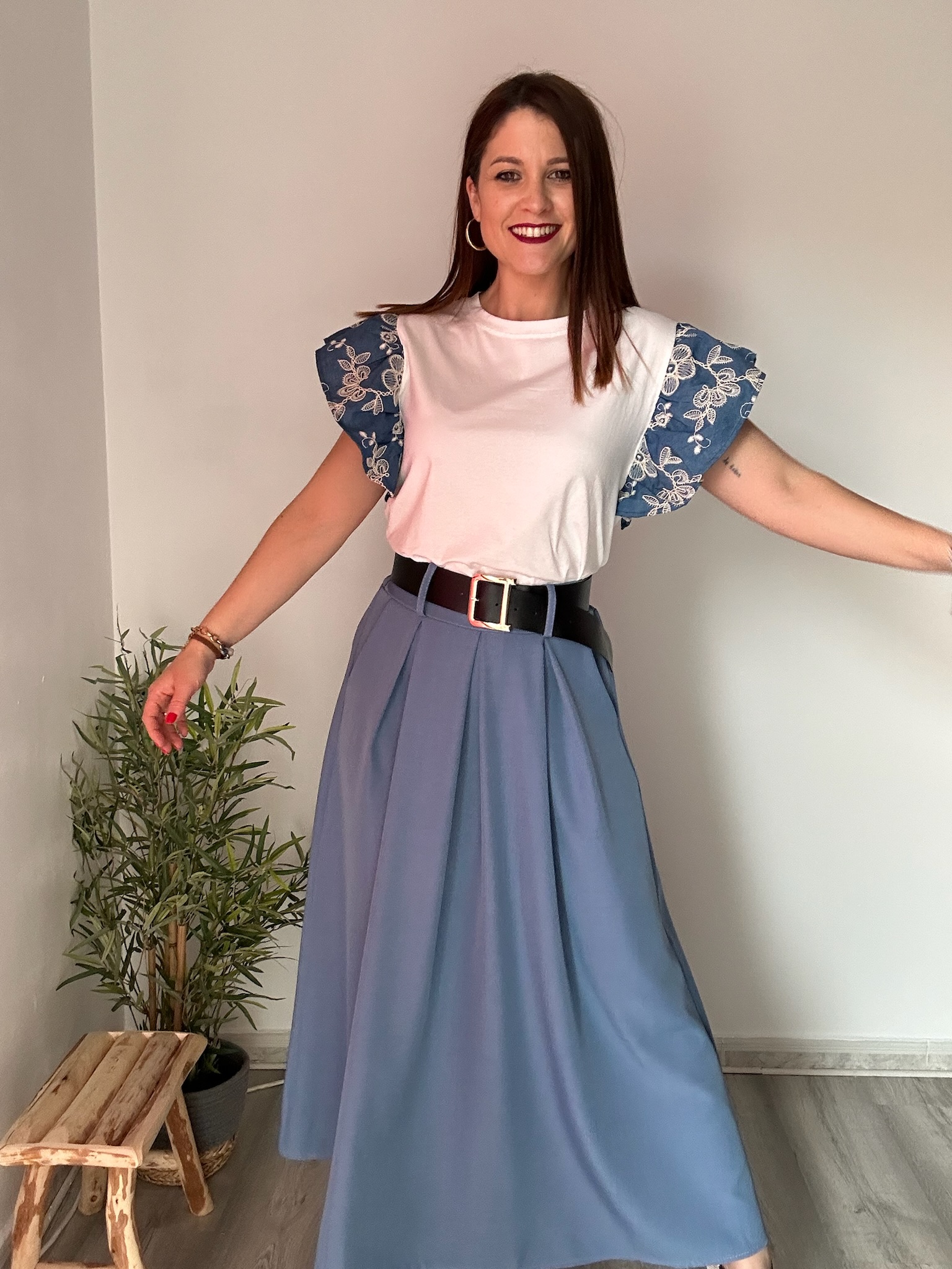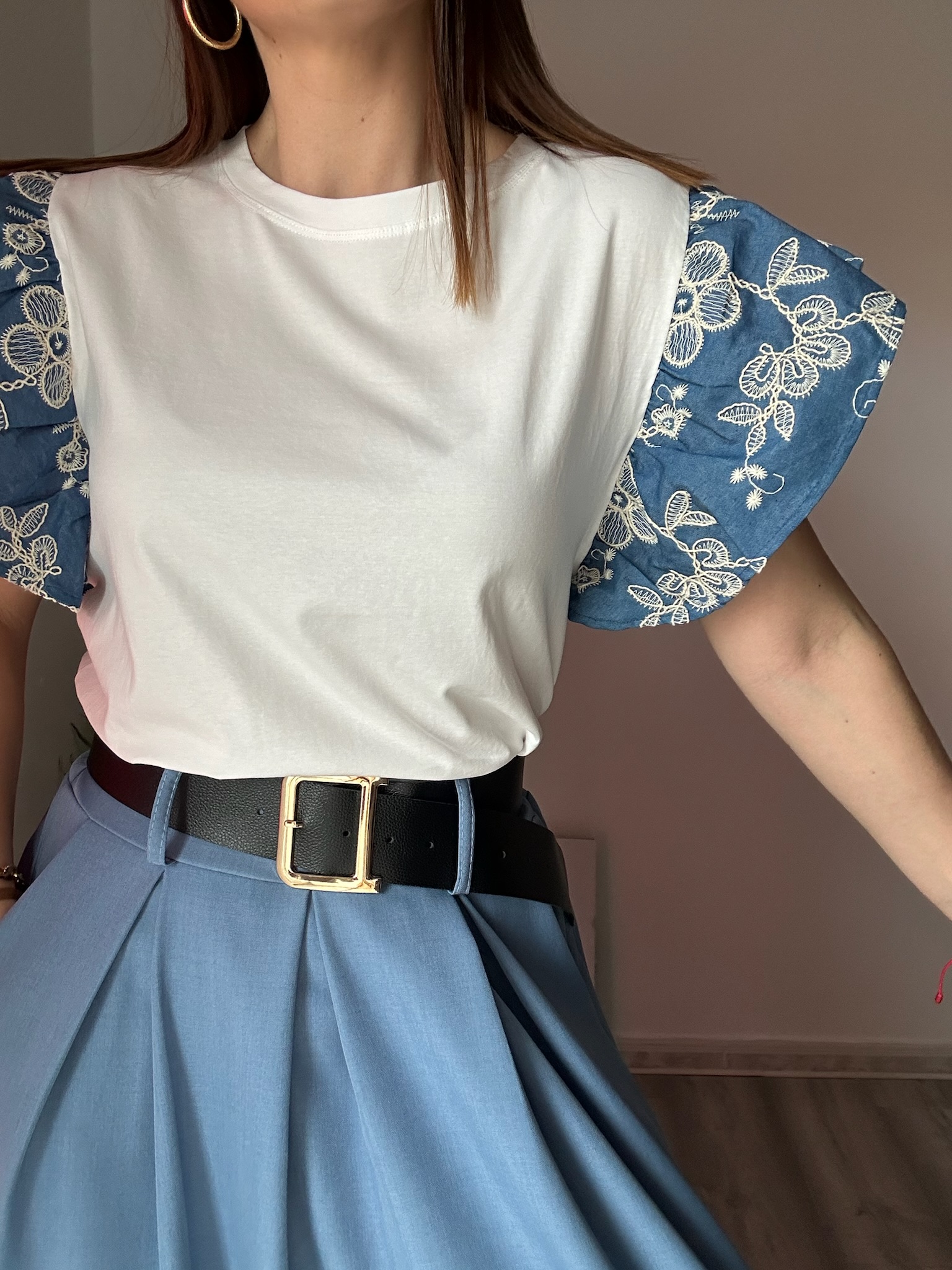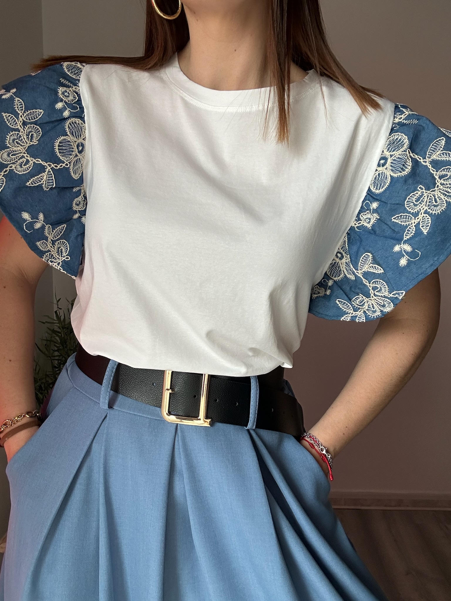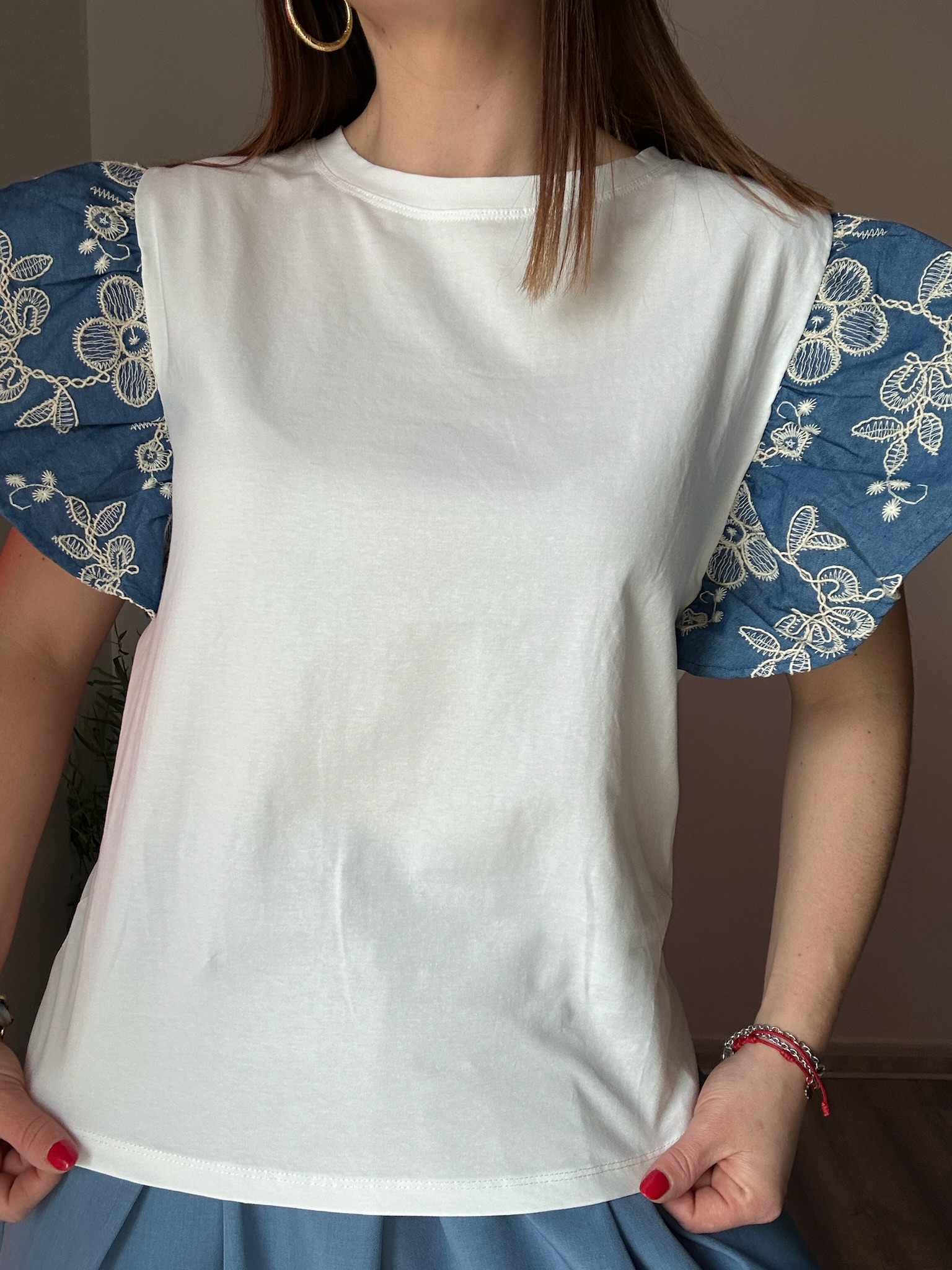 La camiseta blanca con mangas en tejido denim y flores bordadas es una prenda única que combina a la perfección estilo casual y detalles románticos. Su diseño original destaca por el contraste entre el cuerpo en color blanco y las mangas denim, creando un look moderno con un toque especial.