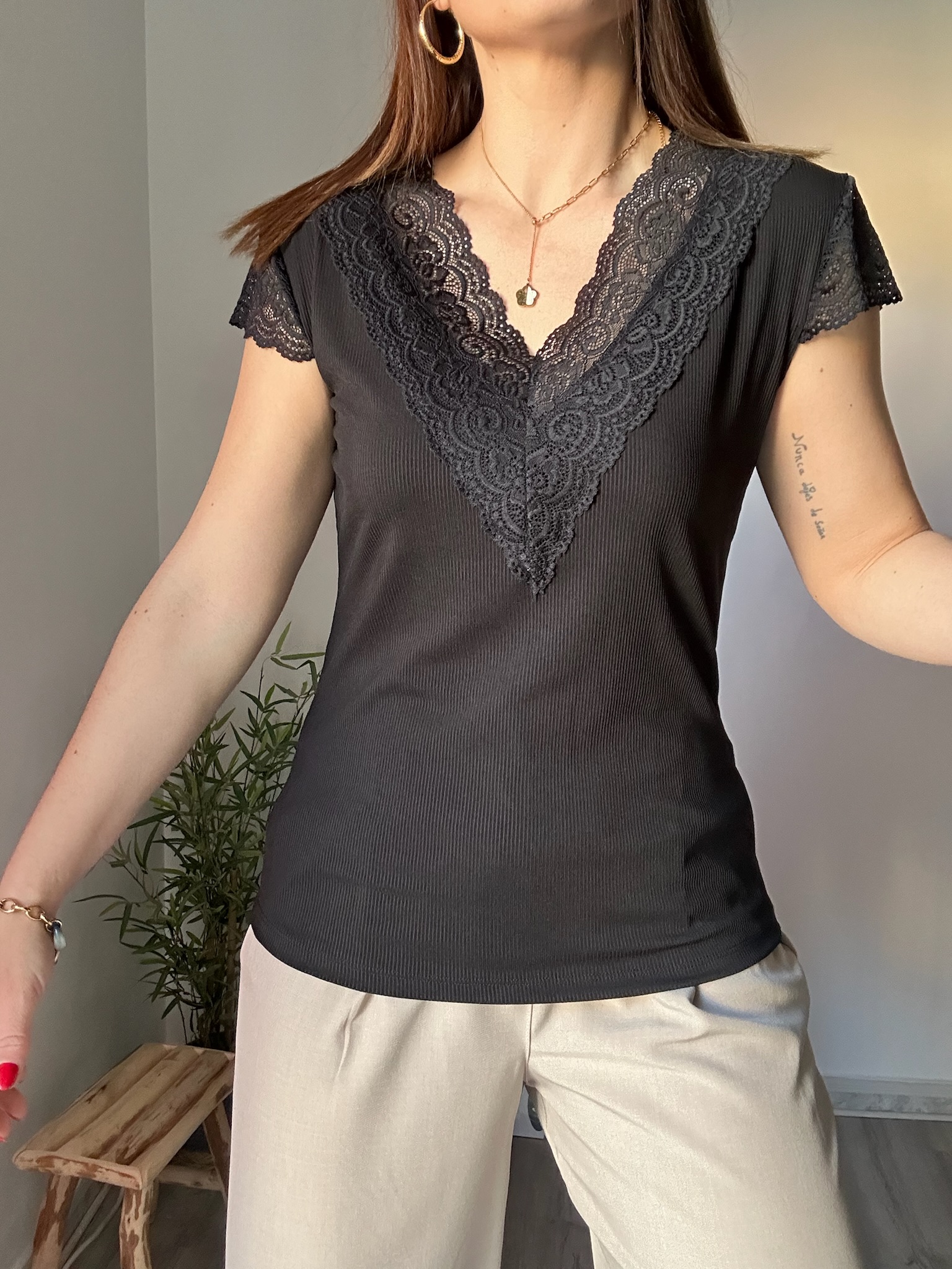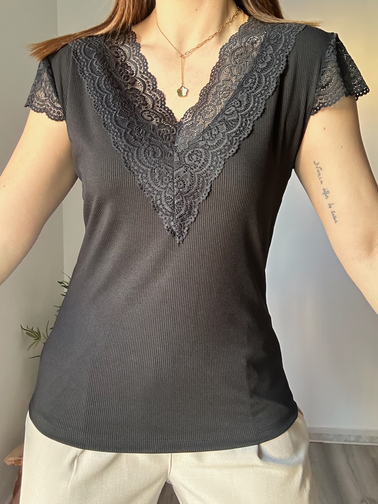 La camiseta de canalé con encaje para mujer es esa prenda imprescindible que combina comodidad, estilo y versatilidad en cualquier temporada. Diseñada para realzar la silueta femenina, su tejido de canalé aporta un ajuste perfecto mientras que el delicado detalle de encaje en el escote y en las mangas añade un toque romántico y sofisticado que eleva cualquier look.