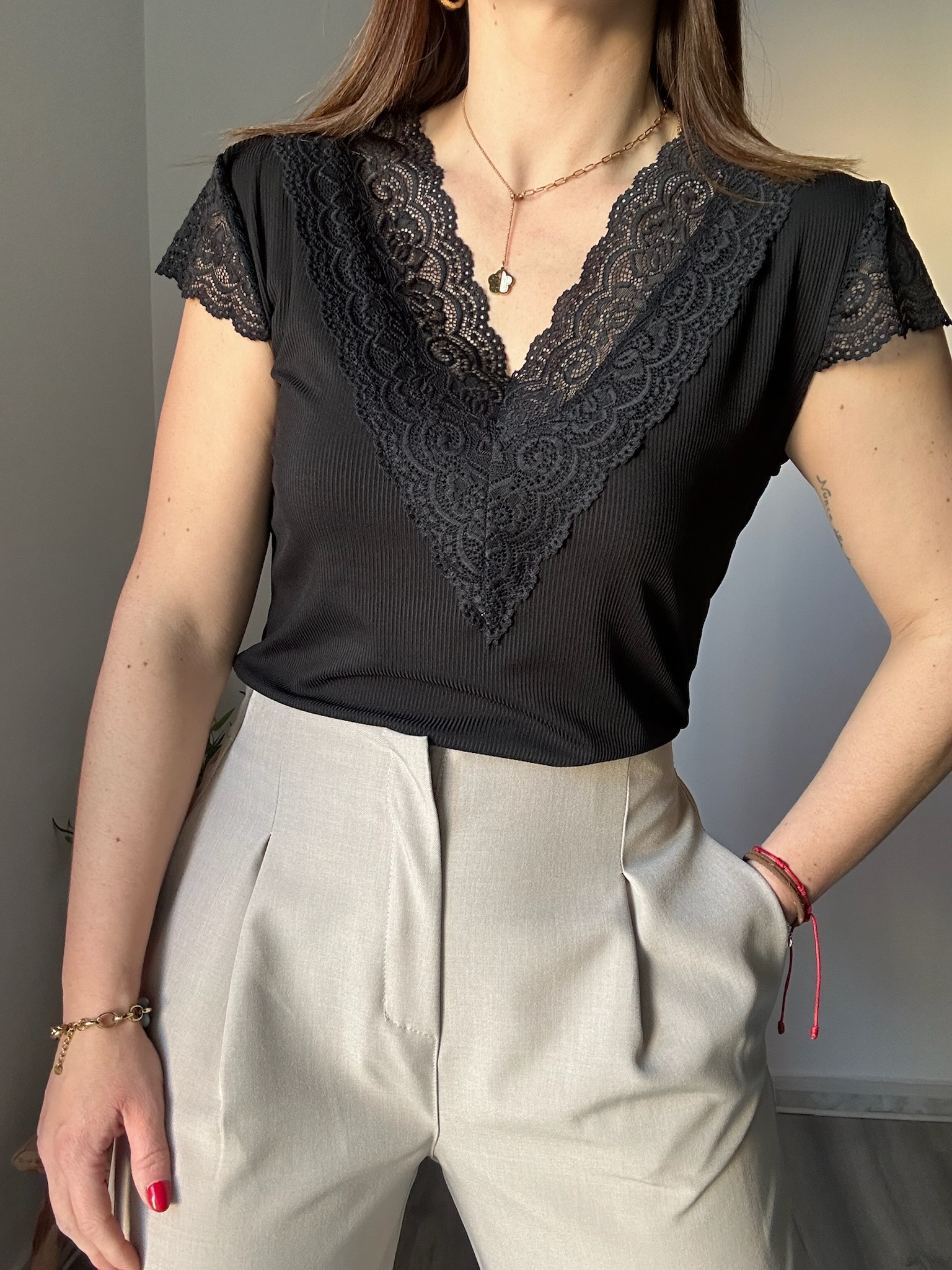 Perfecta para combinar con vaqueros, faldas o pantalones de vestir, esta prenda es ideal tanto para looks casuales como para ocasiones más especiales. Su diseño atemporal con acabado en encaje la convierte en un básico imprescindible en cualquier armario femenino.