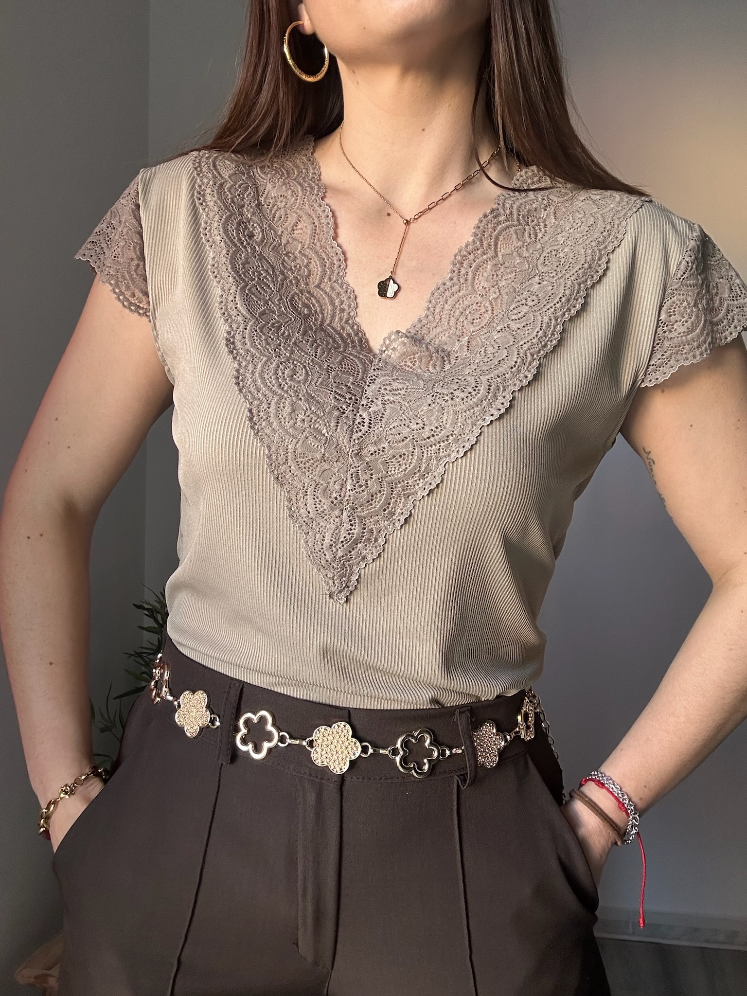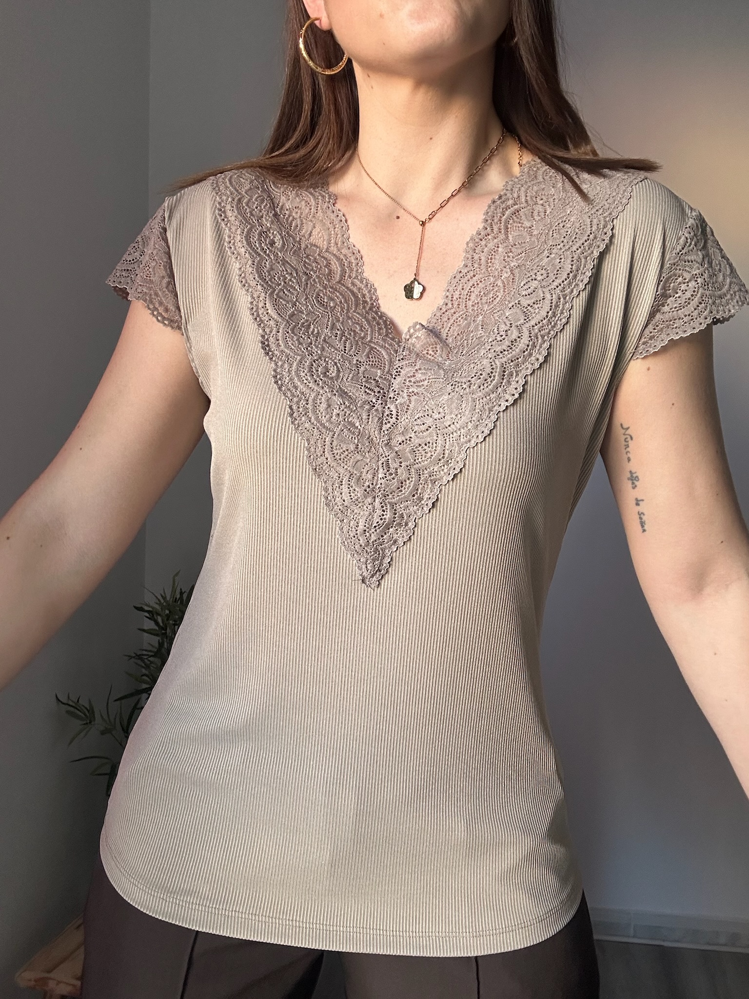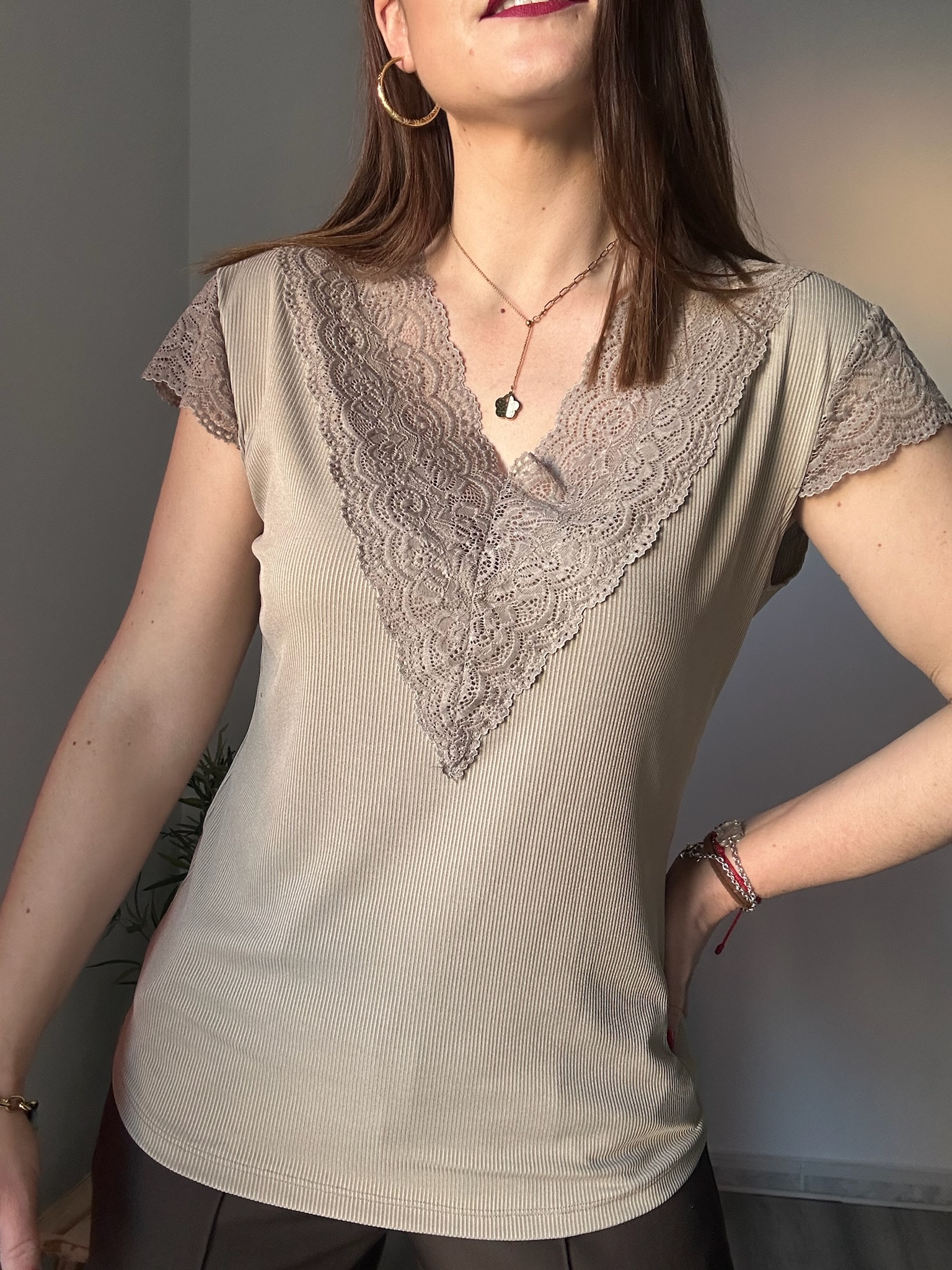 Sé el primero en valorar “Camiseta canalé encaje taupe”