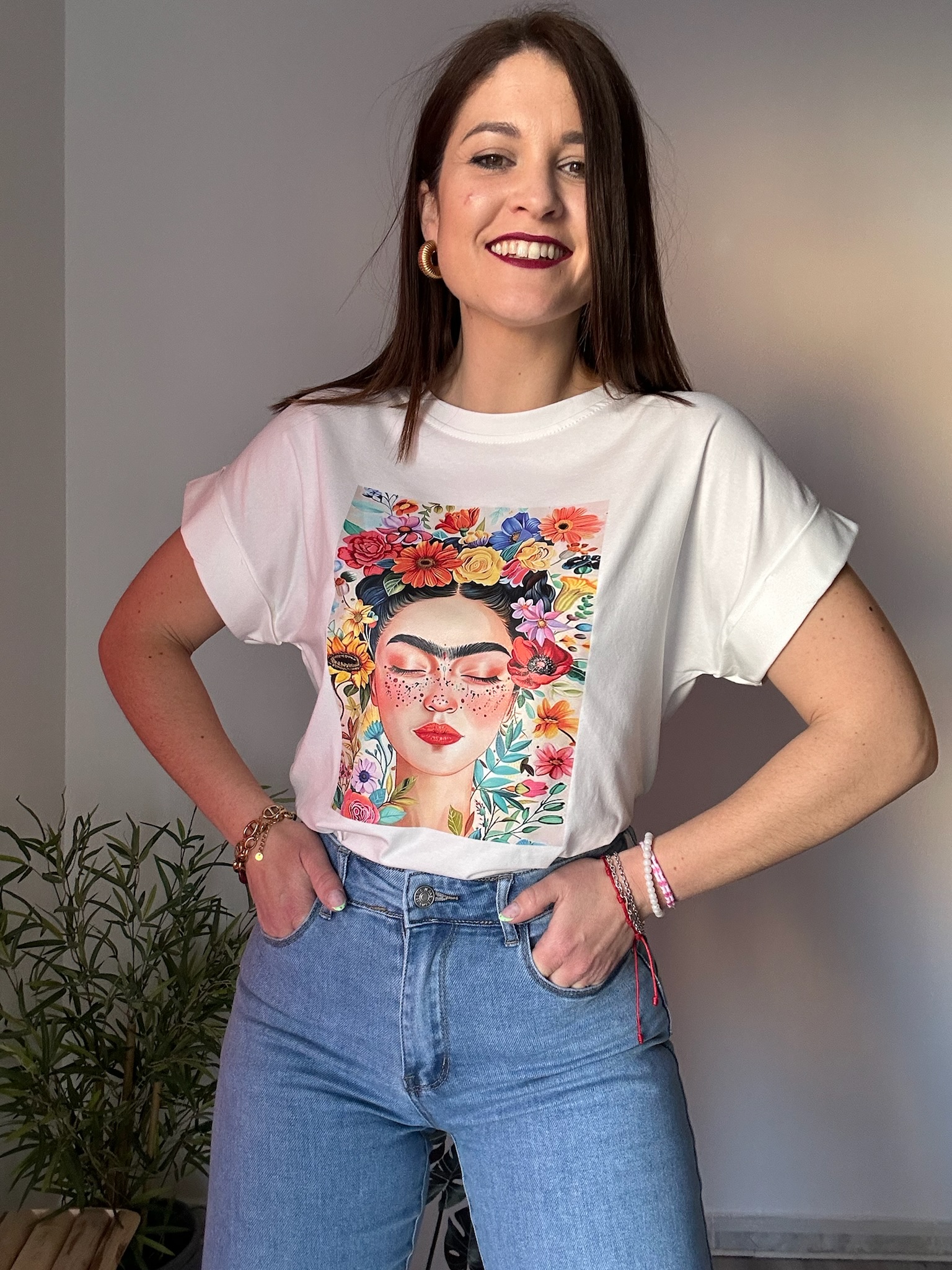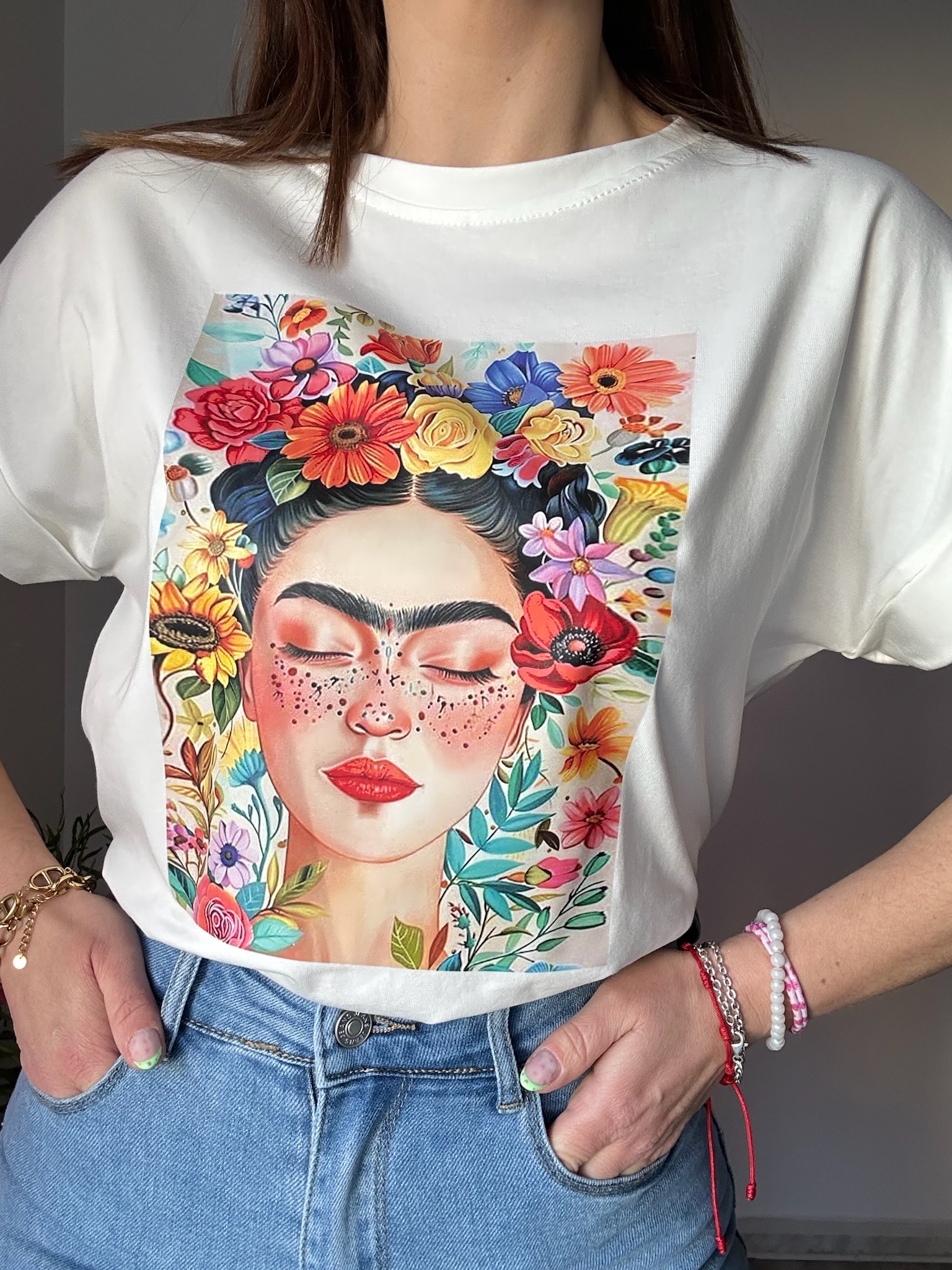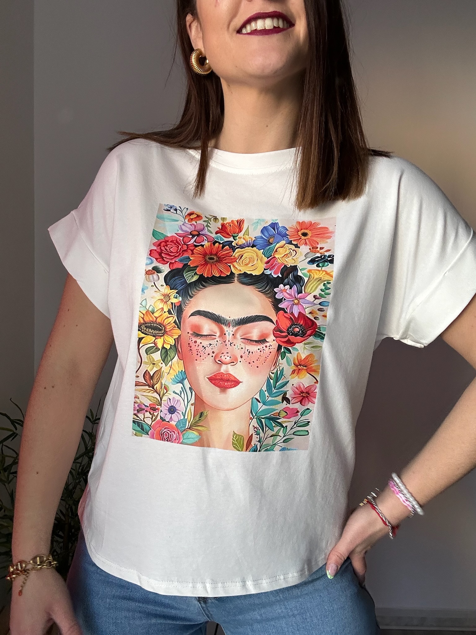 La camiseta blanca con dibujo de Frida Kahlo de La Boutique de Virgo es una prenda icónica que combina arte, estilo y comodidad. Su diseño destaca por un estampado inspirado en Frida Kahlo, aportando un toque cultural y sofisticado a cualquier look diario.