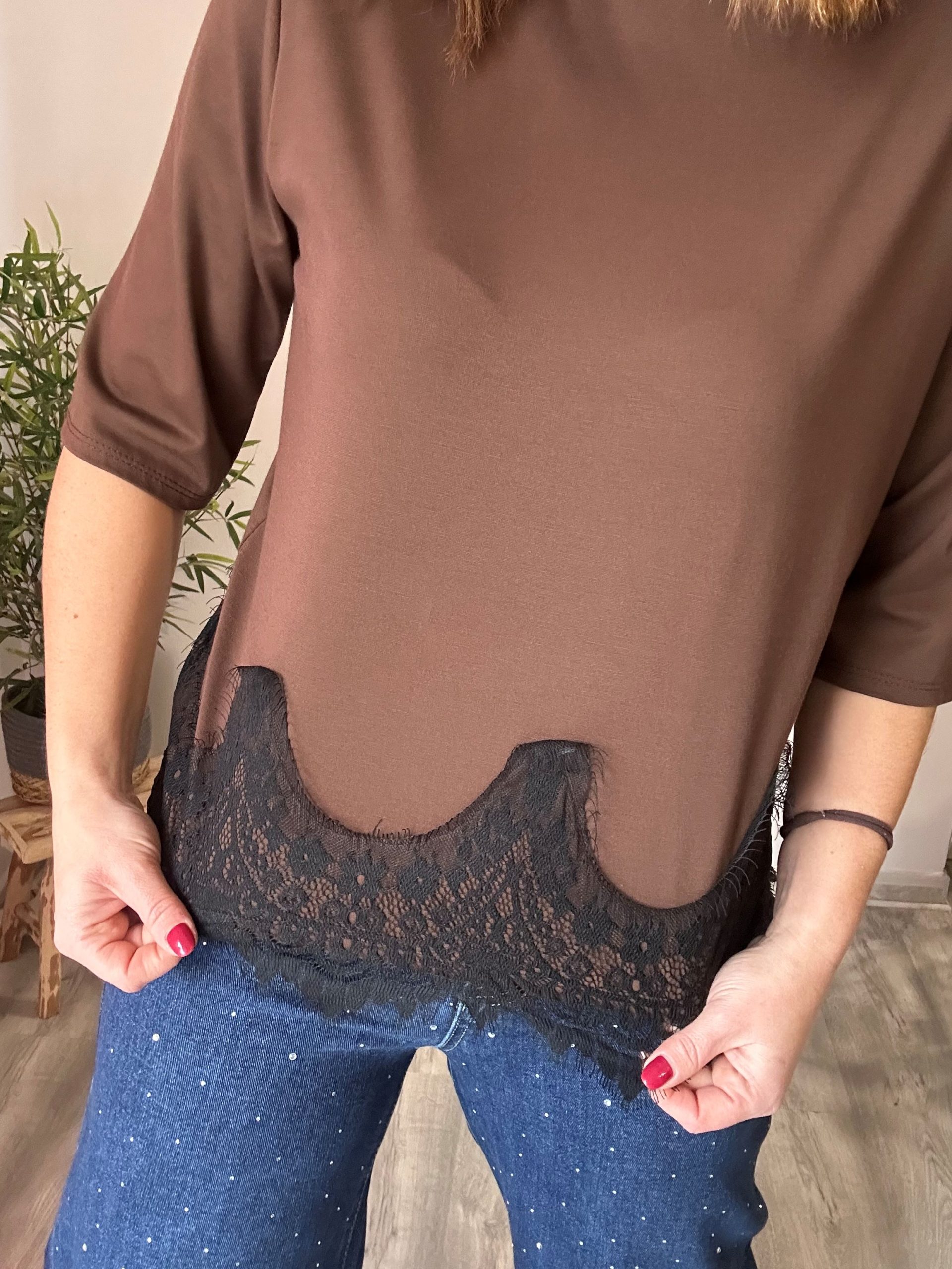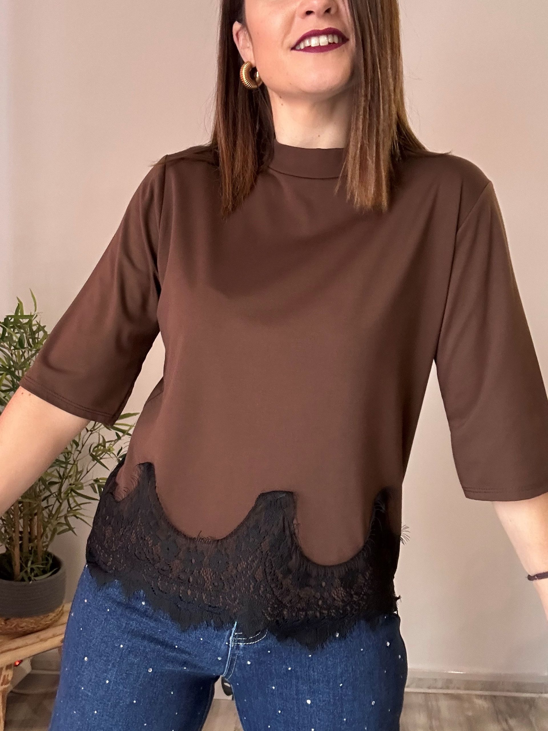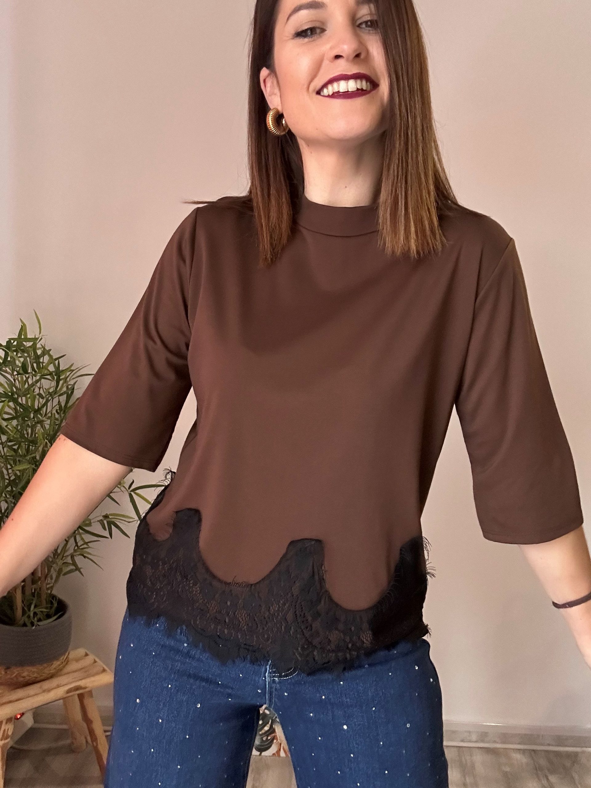 Camiseta marrón encaje