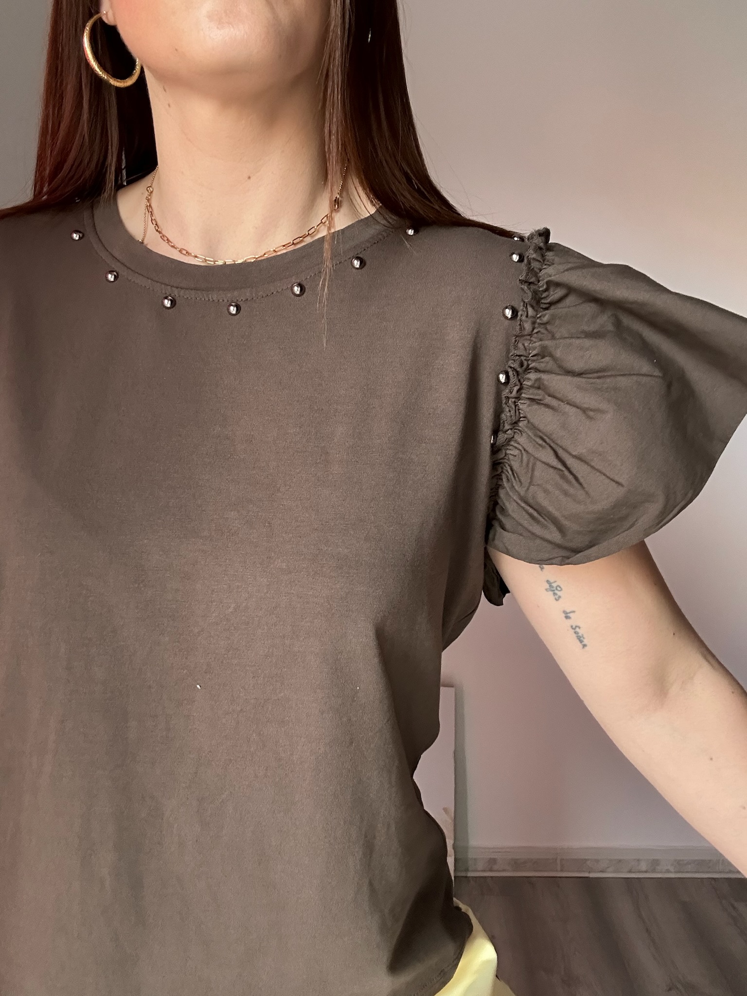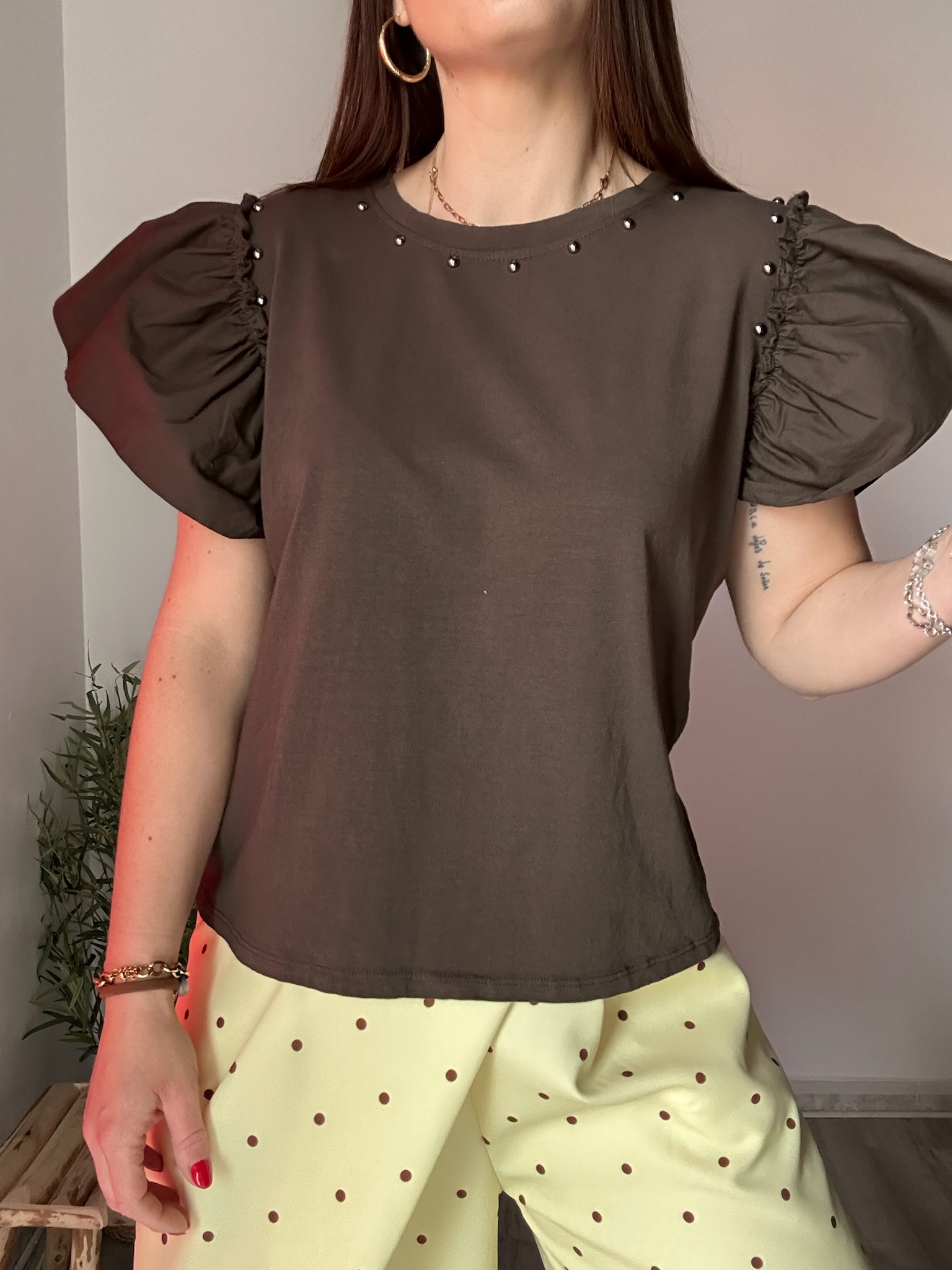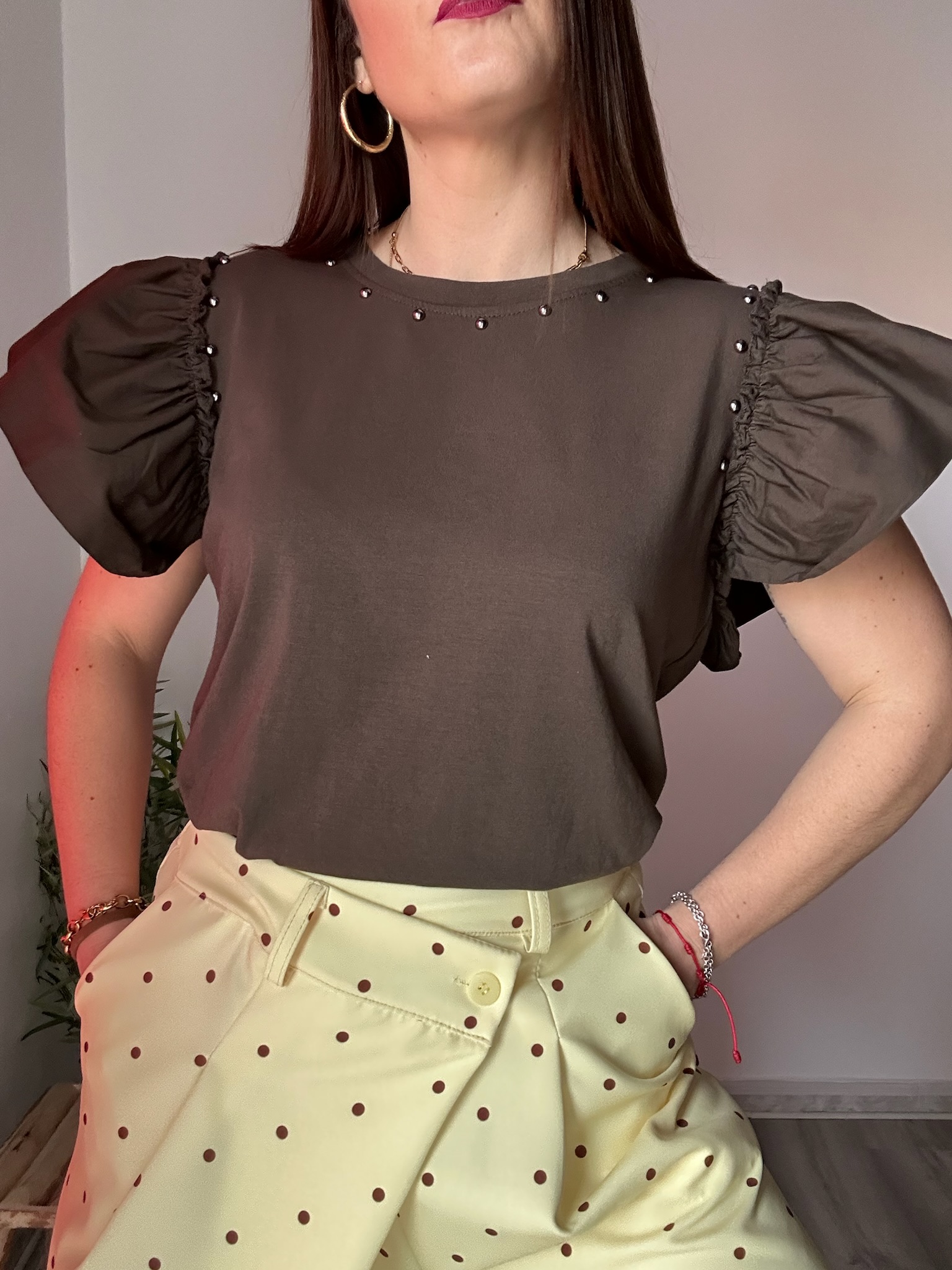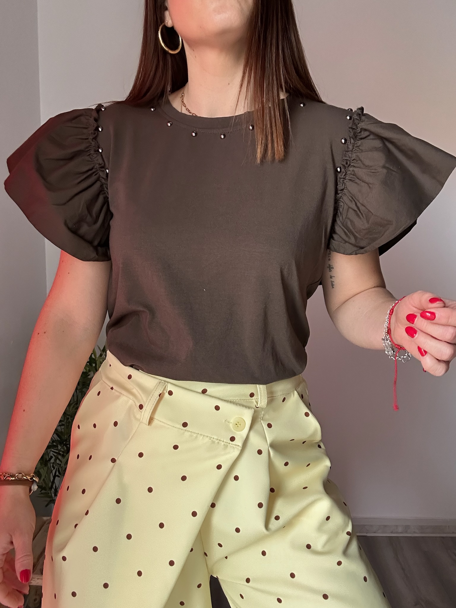 La camiseta marrón con volantes y tachuelas es una prenda imprescindible para quienes buscan un equilibrio perfecto entre estilo y comodidad. Su diseño combina detalles femeninos como los volantes en las mangas con un toque más atrevido gracias a las tachuelas, creando una pieza única que eleva cualquier look.