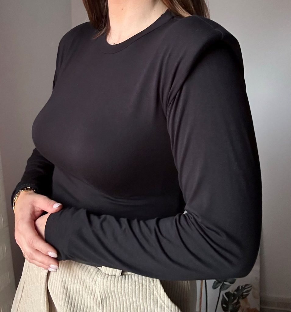 Camiseta de manga larga con hombreras confeccionada en tejido elástico que se adapta perfectamente al cuerpo. Su diseño estructurado estiliza la figura y aporta elegancia.