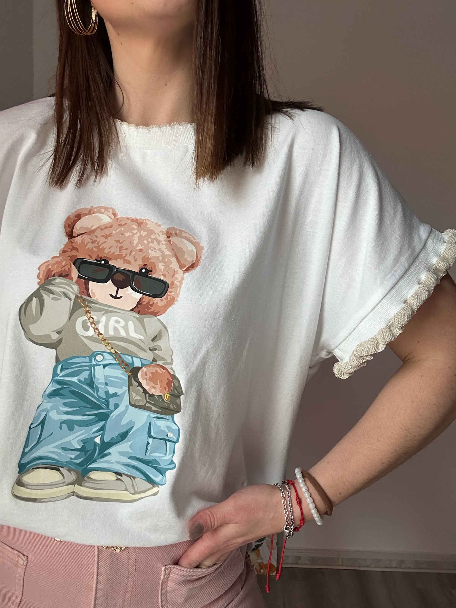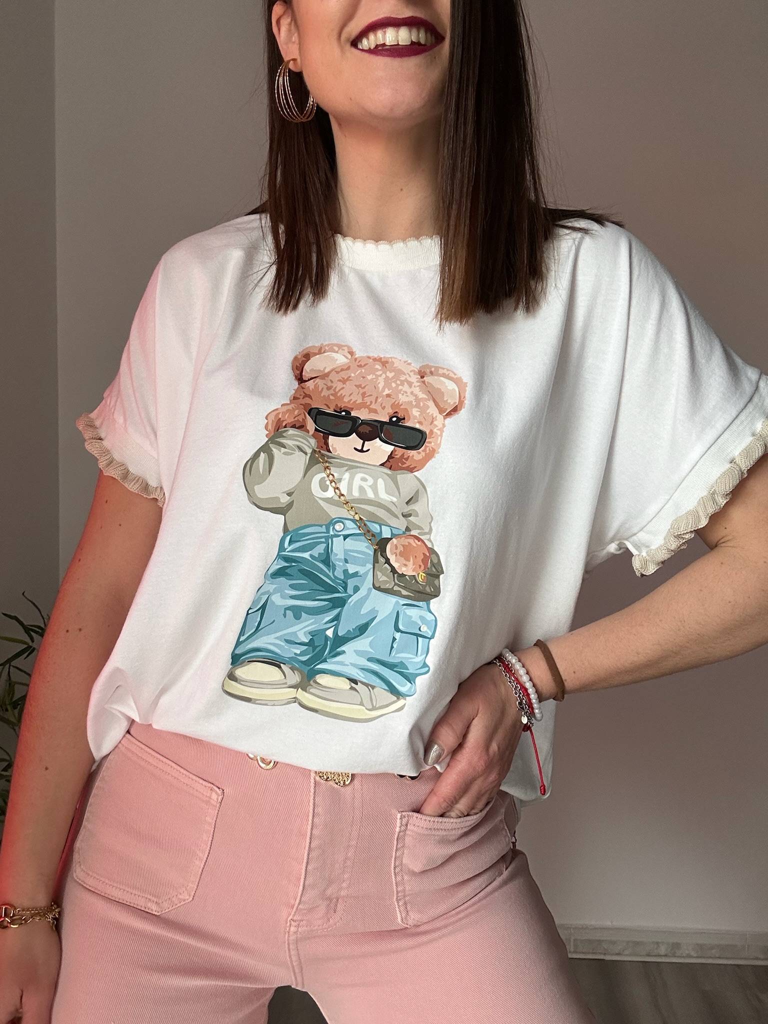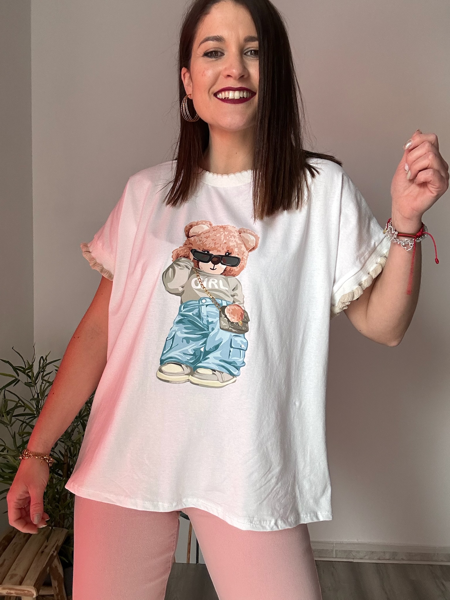 Si buscas una camiseta oversize cómoda, original y fácil de combinar, este modelo con osito y detalle rizado será una opción ideal para tu armario.
