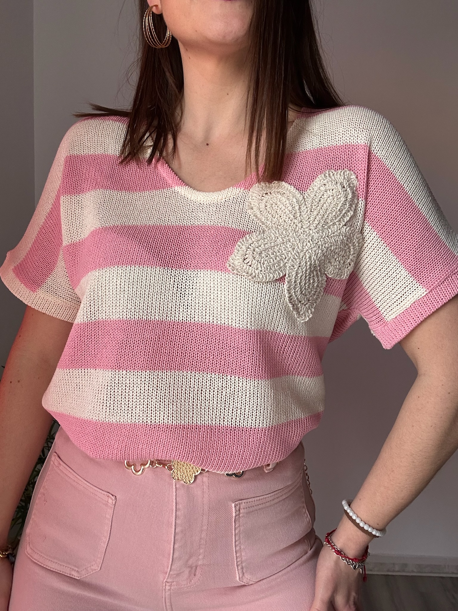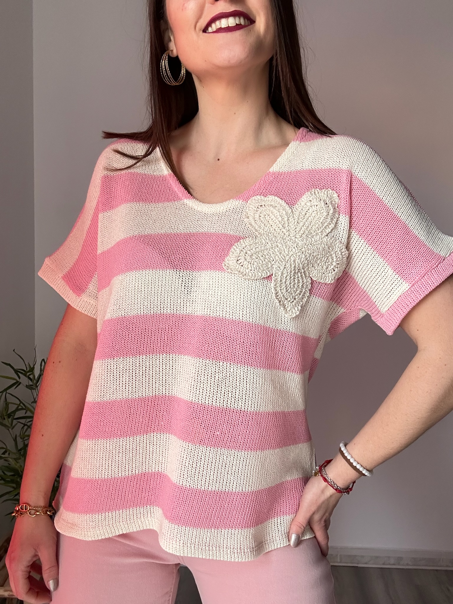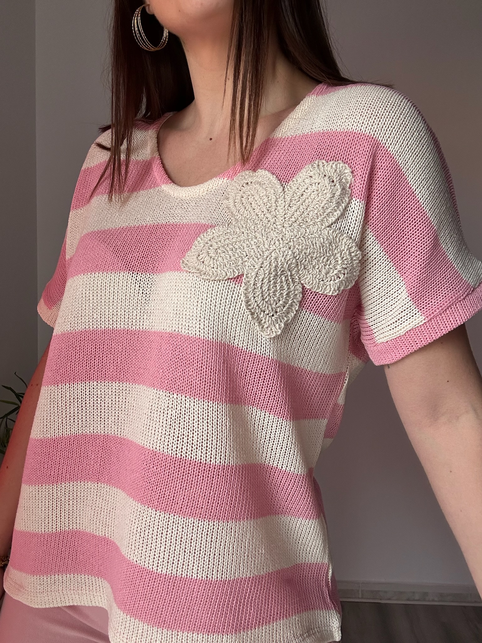 El diseño de rayas en tonos suaves crea un efecto visual muy favorecedor, mientras que la flor bordada añade un detalle delicado que transforma esta camiseta en una pieza original y diferente. Es una opción ideal para quienes buscan una prenda básica pero con un pequeño detalle que marque la diferencia.