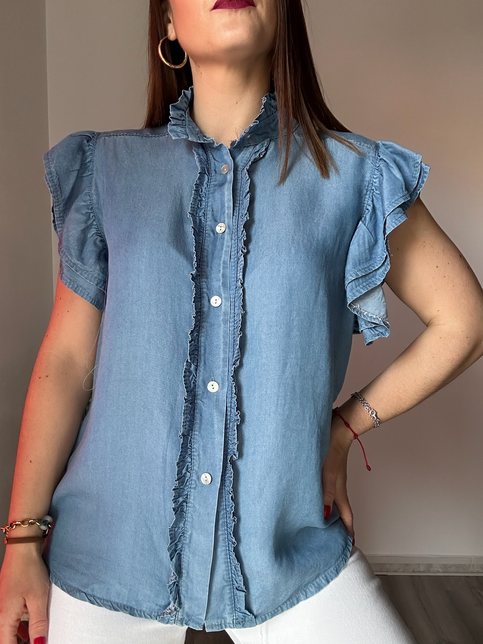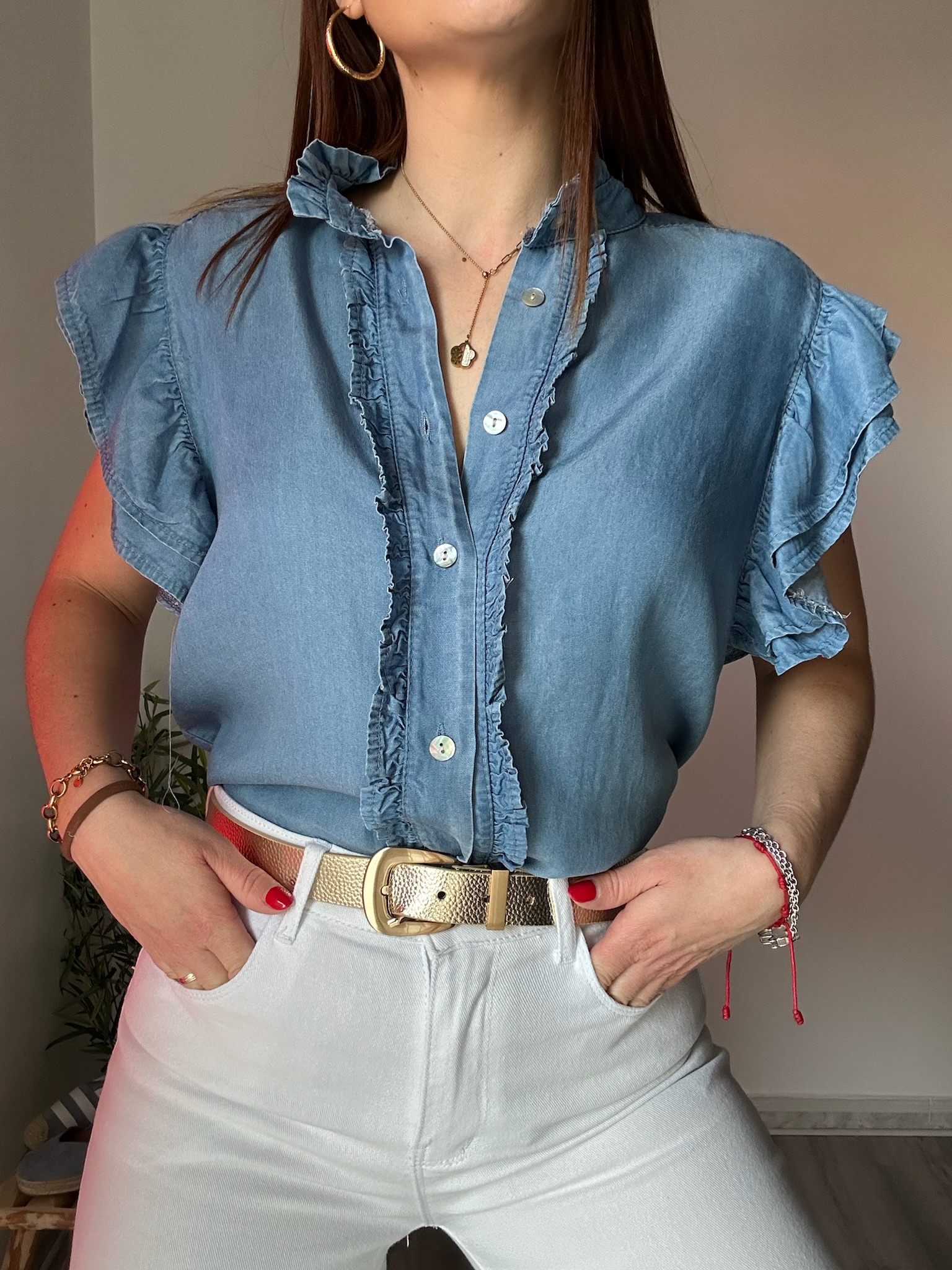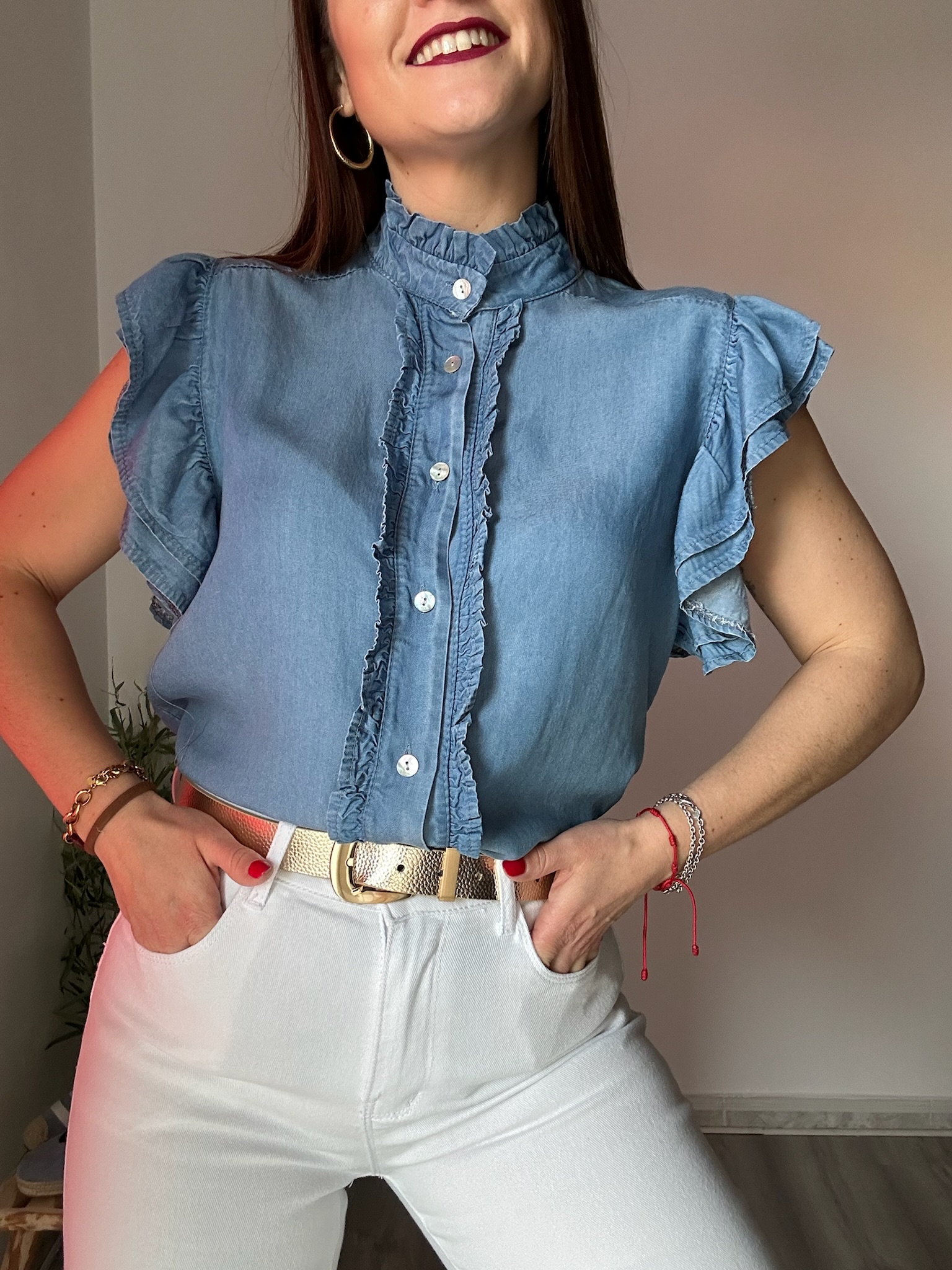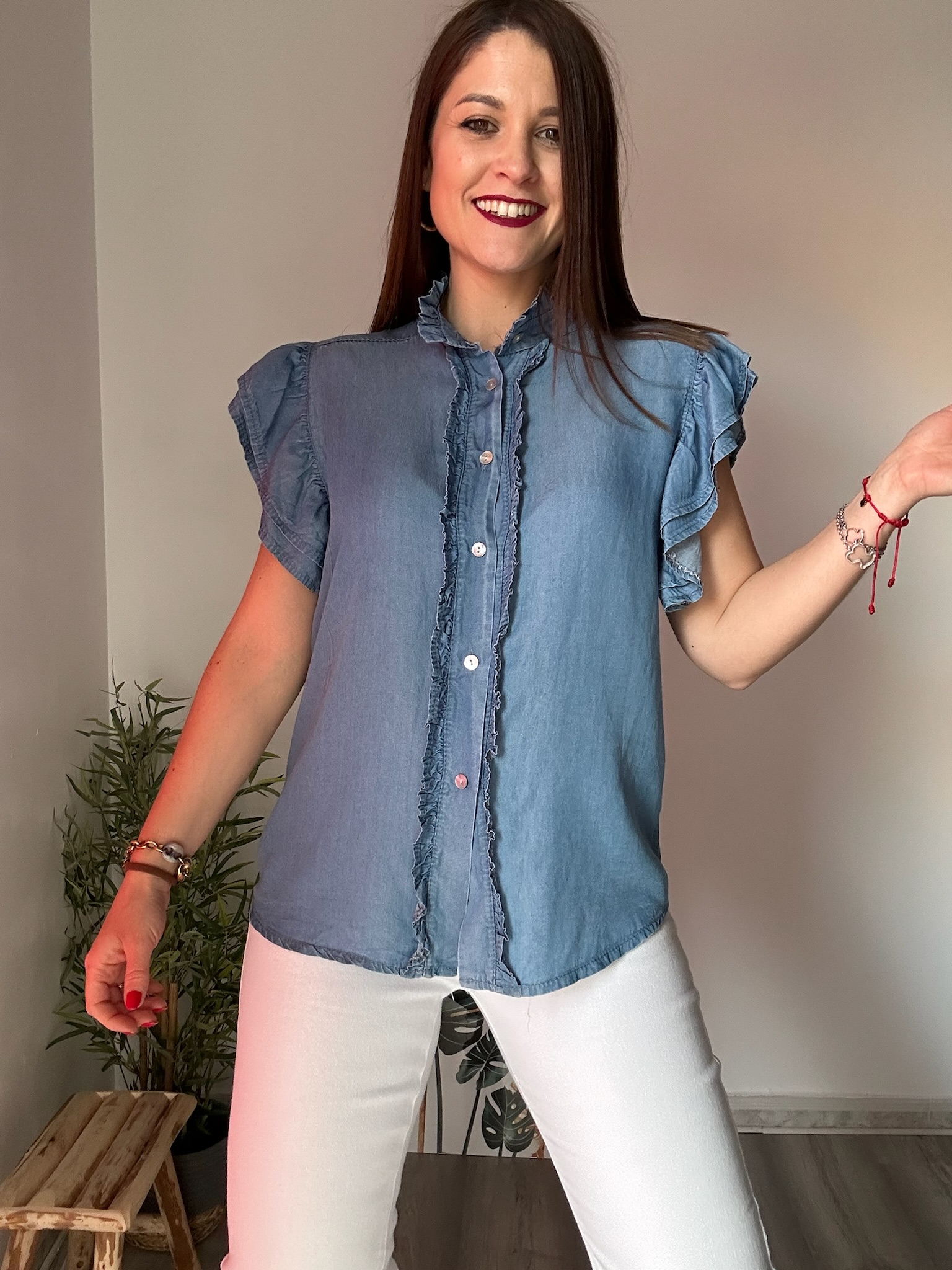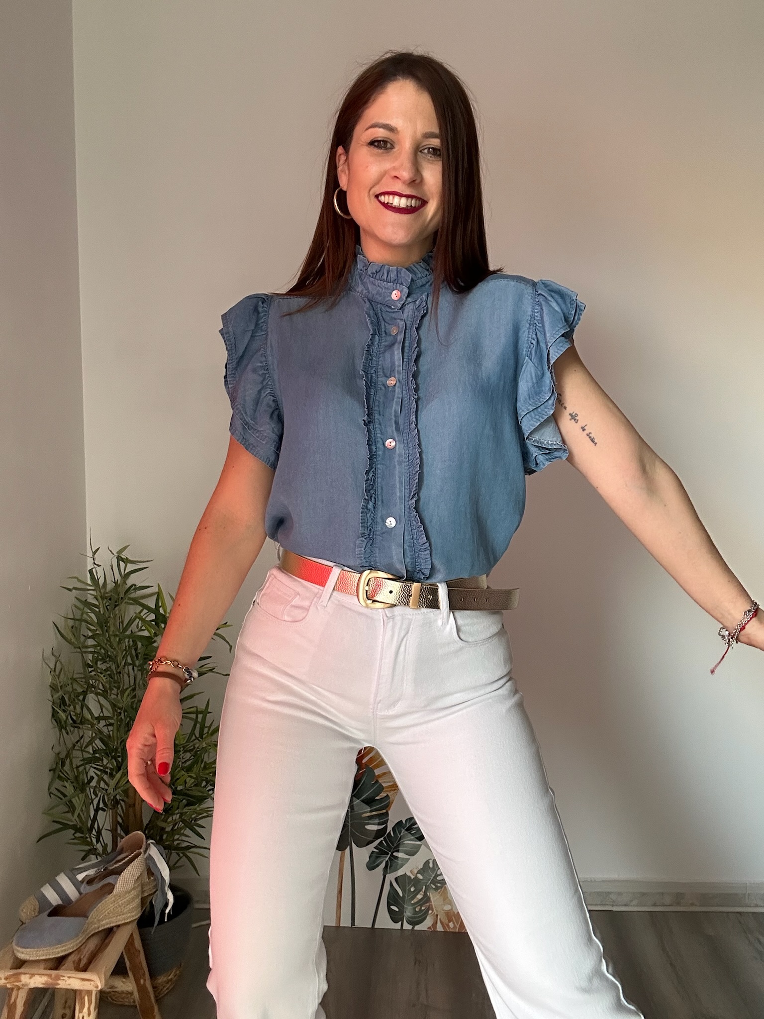 La camisa en tejido denim fino es una prenda imprescindible que combina estilo, comodidad y detalles femeninos para crear un look único esta temporada. Su diseño destaca por los delicados fruncidos en la zona del cuello y la parte delantera, aportando un aire elegante y sofisticado sin perder su esencia casual.
