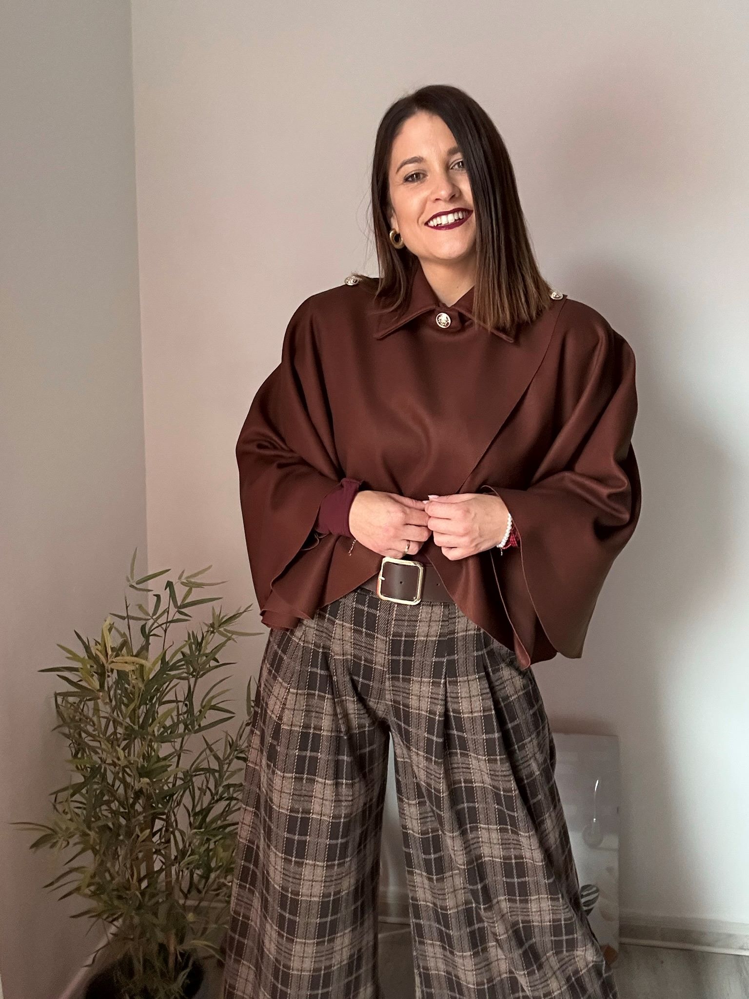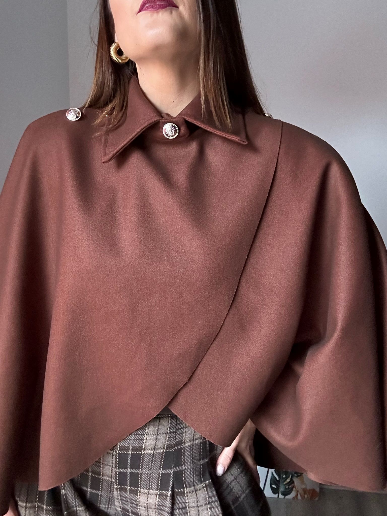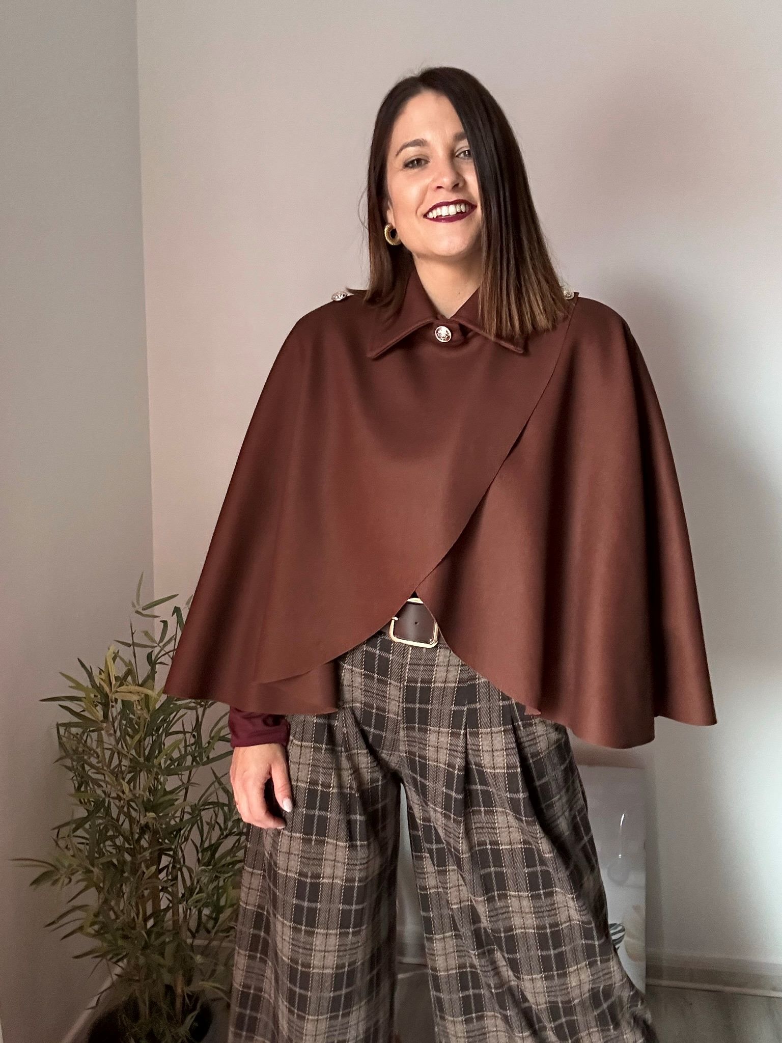 Capa estilo poncho en color marrón con botones dorados. De corte amplio y favorecedor, es apta para todas las tallas.