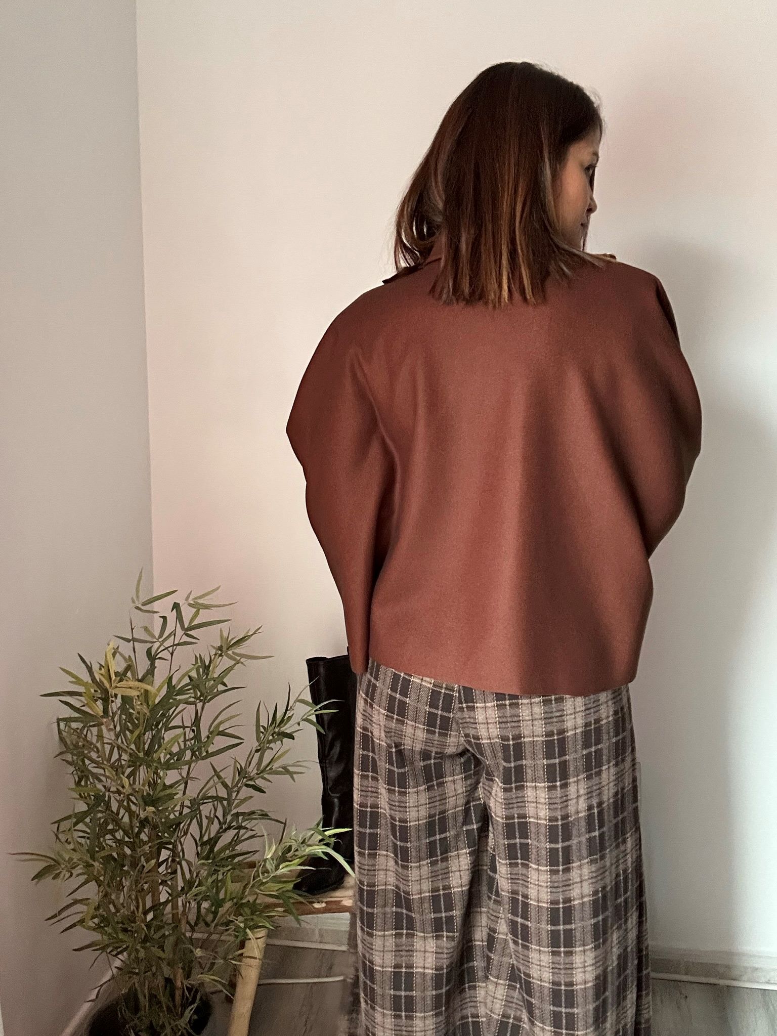 Confeccionada en un tejido suave y de excelente calidad, esta capa marrón destaca por su detalle de botones dorados, que aportan un aire refinado y chic. El contraste entre el tono cálido del marrón y el brillo sutil del dorado crea un equilibrio perfecto entre elegancia y estilo moderno.