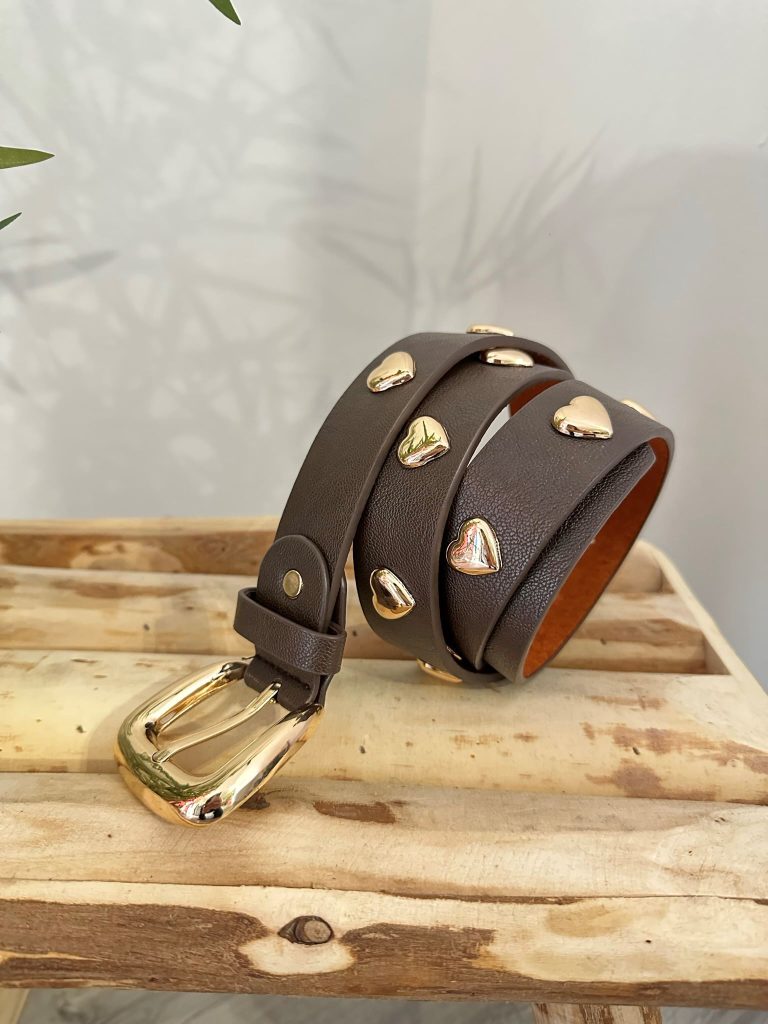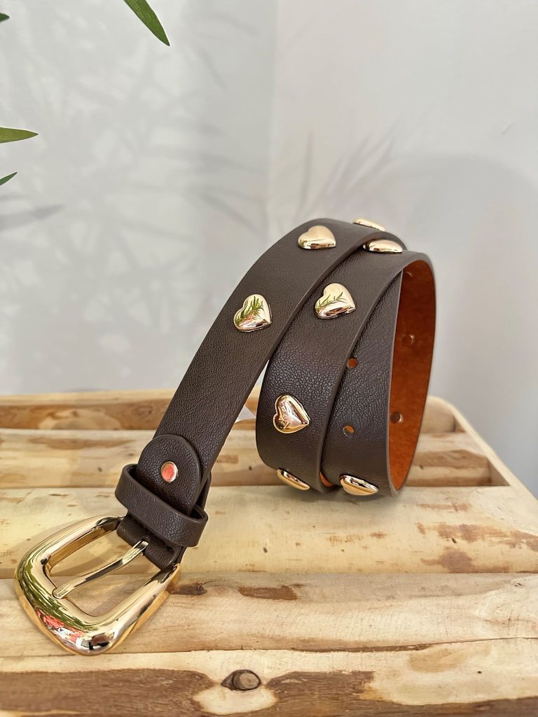 Cinturón marrón con corazones dorados y hebilla dorada, elegante y versátil. Perfecto para aportar un toque romántico y chic a cualquier look. Ideal para combinar con vestidos, faldas, jeans o pantalones de vestir. Un accesorio imprescindible en tu armario para elevar cualquier outfit con estilo.
