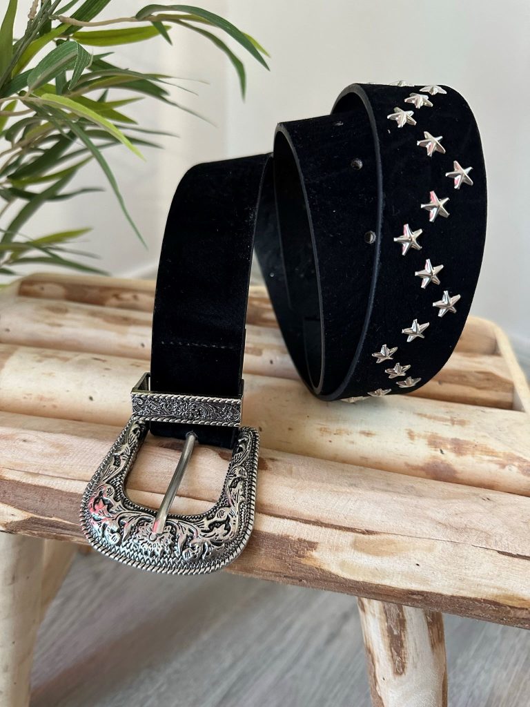 Con una longitud de 110 cm, este cinturón ofrece un ajuste perfecto y cómodo, ideal para llevar con vaqueros, faldas o vestidos. Su hebilla plateada aporta un aire elegante y atemporal, mientras que los detalles de estrellas en color plata que recorren la correa le dan un toque original y lleno de personalidad, ideal para mujeres que buscan destacar sin renunciar a la elegancia.