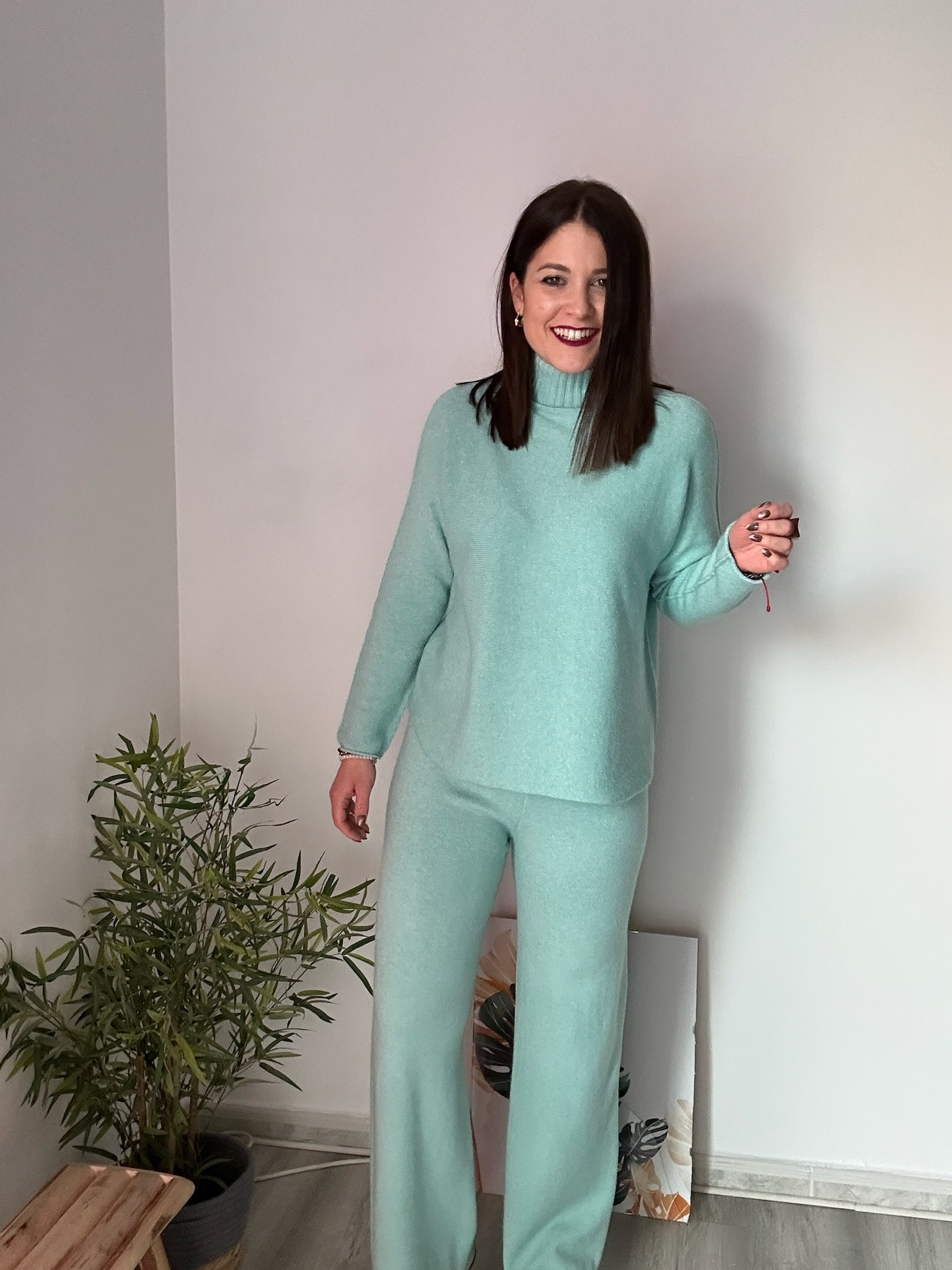 Estos conjuntos están confeccionados en un tejido de punto suave y muy gustoso, perfecto para los meses más frescos. Su tacto calentito aporta confort desde el primer momento, convirtiéndolos en una opción imprescindible para tu fondo de armario. El jersey con cuello chimenea añade un toque moderno y elegante, además de proteger del frío sin necesidad de complementos extra.