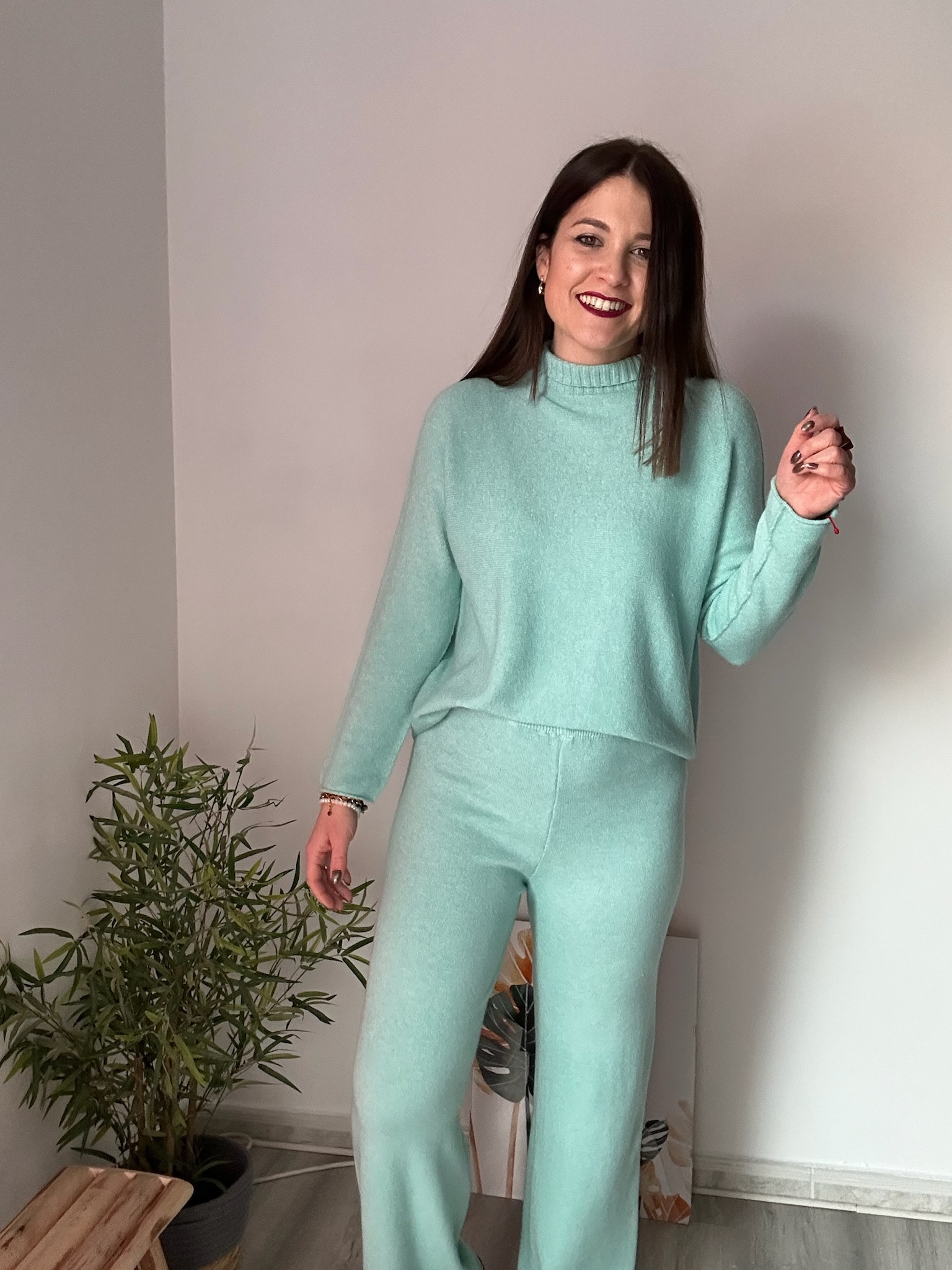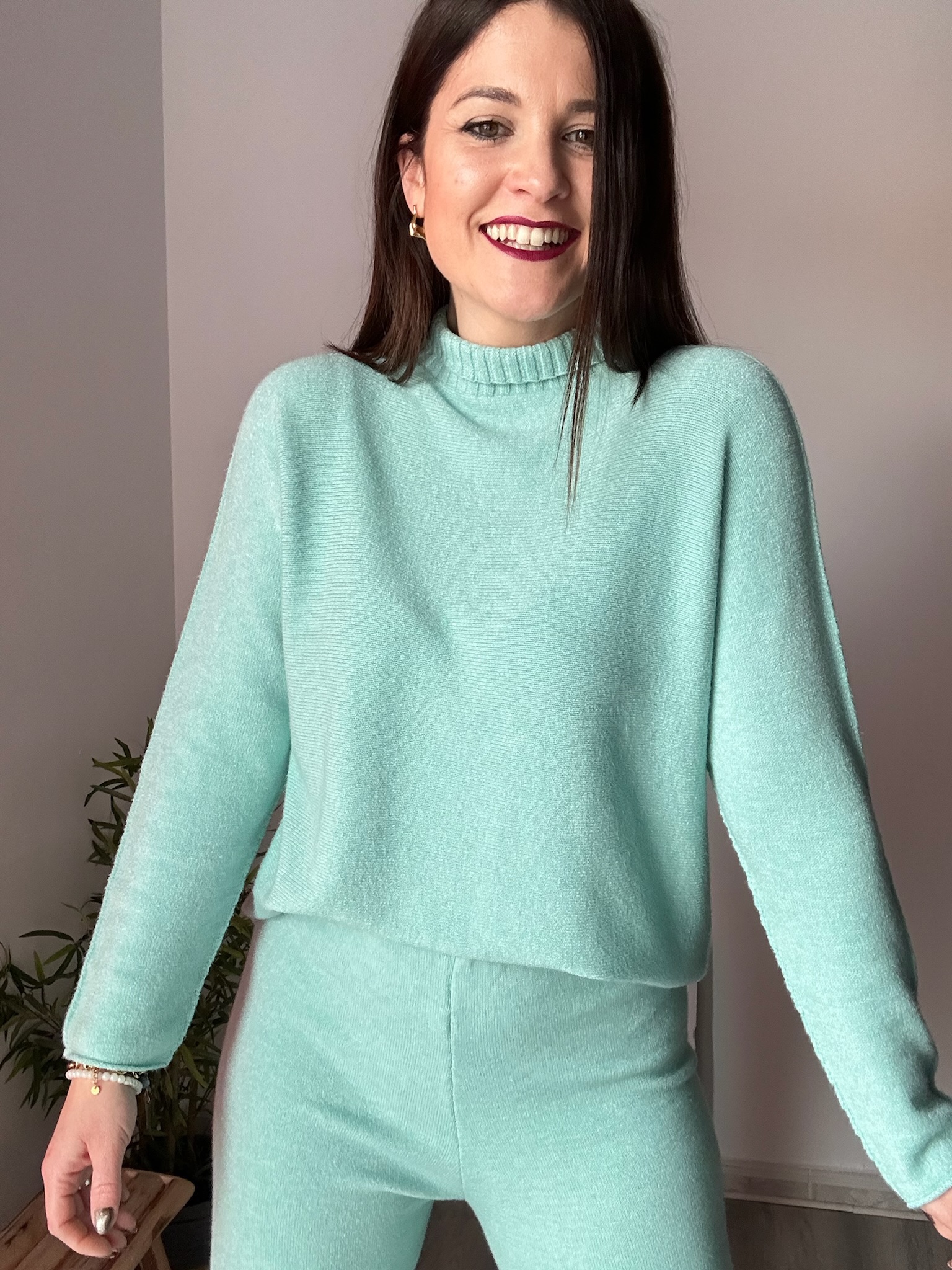 Colección de conjuntos de punto suaves y calentitos, ideales para el día a día. Jersey con cuello chimenea y pantalón con cintura elástica. Tejido cómodo y adaptable. La camisa de rayas que aparece en las imágenes, está disponible en la sección de camisas.