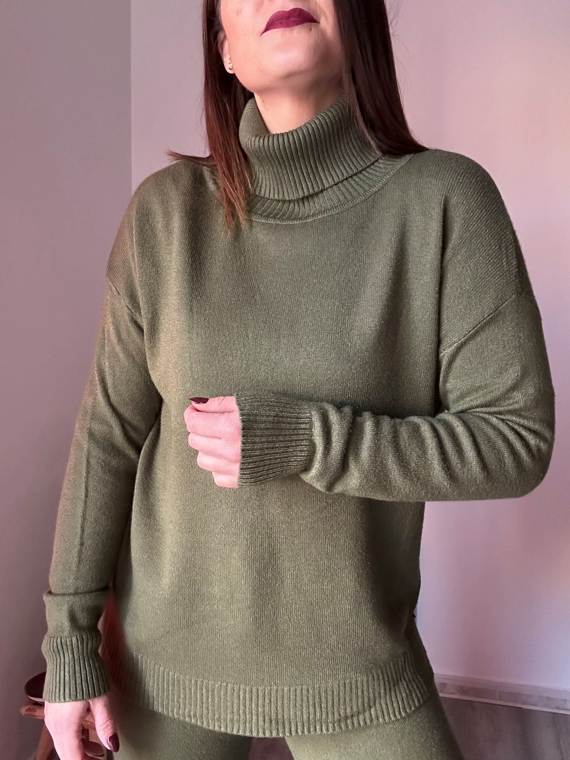 El jersey de corte amplio cuenta con un elegante cuello vuelto, que no solo protege del frío, sino que también añade un toque moderno y sofisticado al conjunto. Su diseño holgado favorece distintas siluetas, proporcionando libertad de movimiento y un ajuste cómodo durante todo el día.