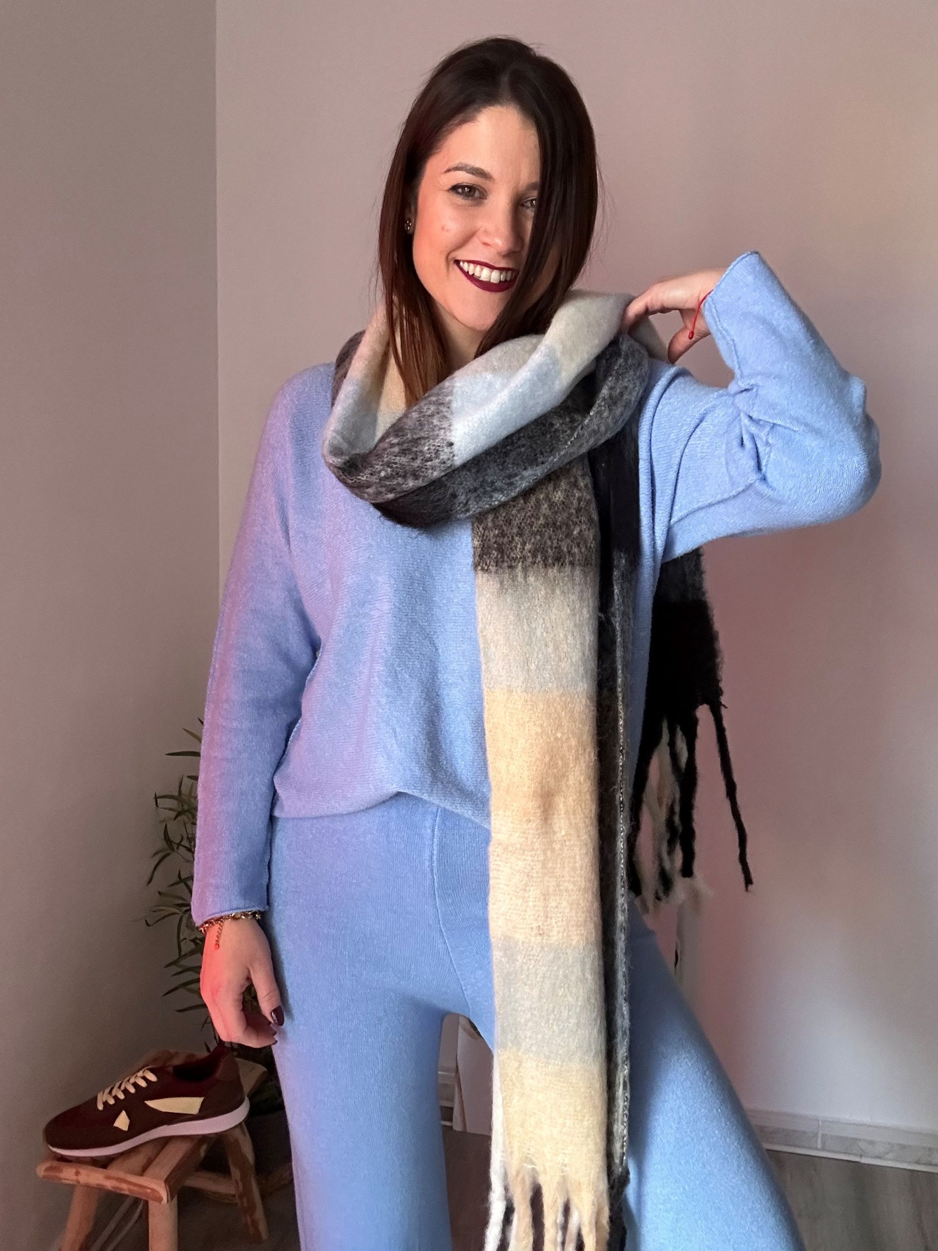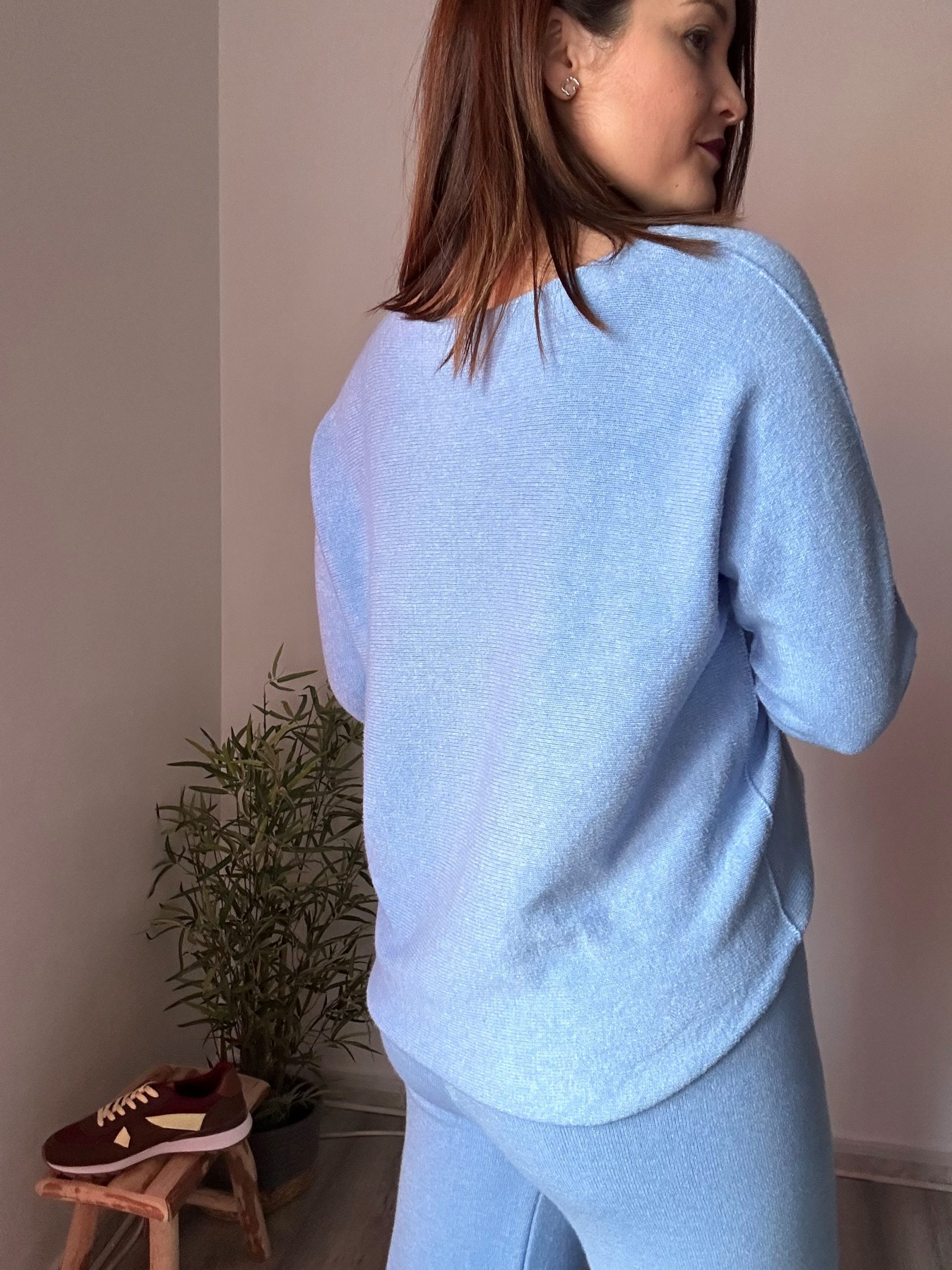 El conjunto está formado por un jersey amplio de cuello redondo, un básico imprescindible que aporta confort y un aire relajado a cualquier look. Su corte holgado favorece distintas siluetas y permite llevarlo tanto por dentro como por fuera del pantalón, adaptándose a diferentes estilos y ocasiones.