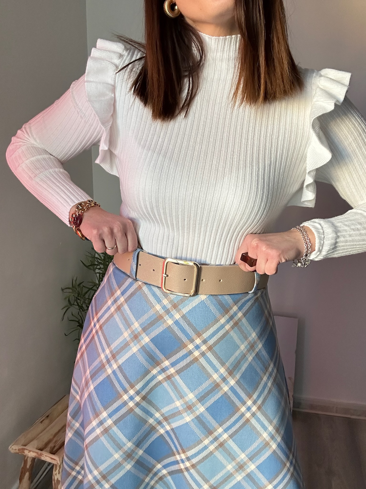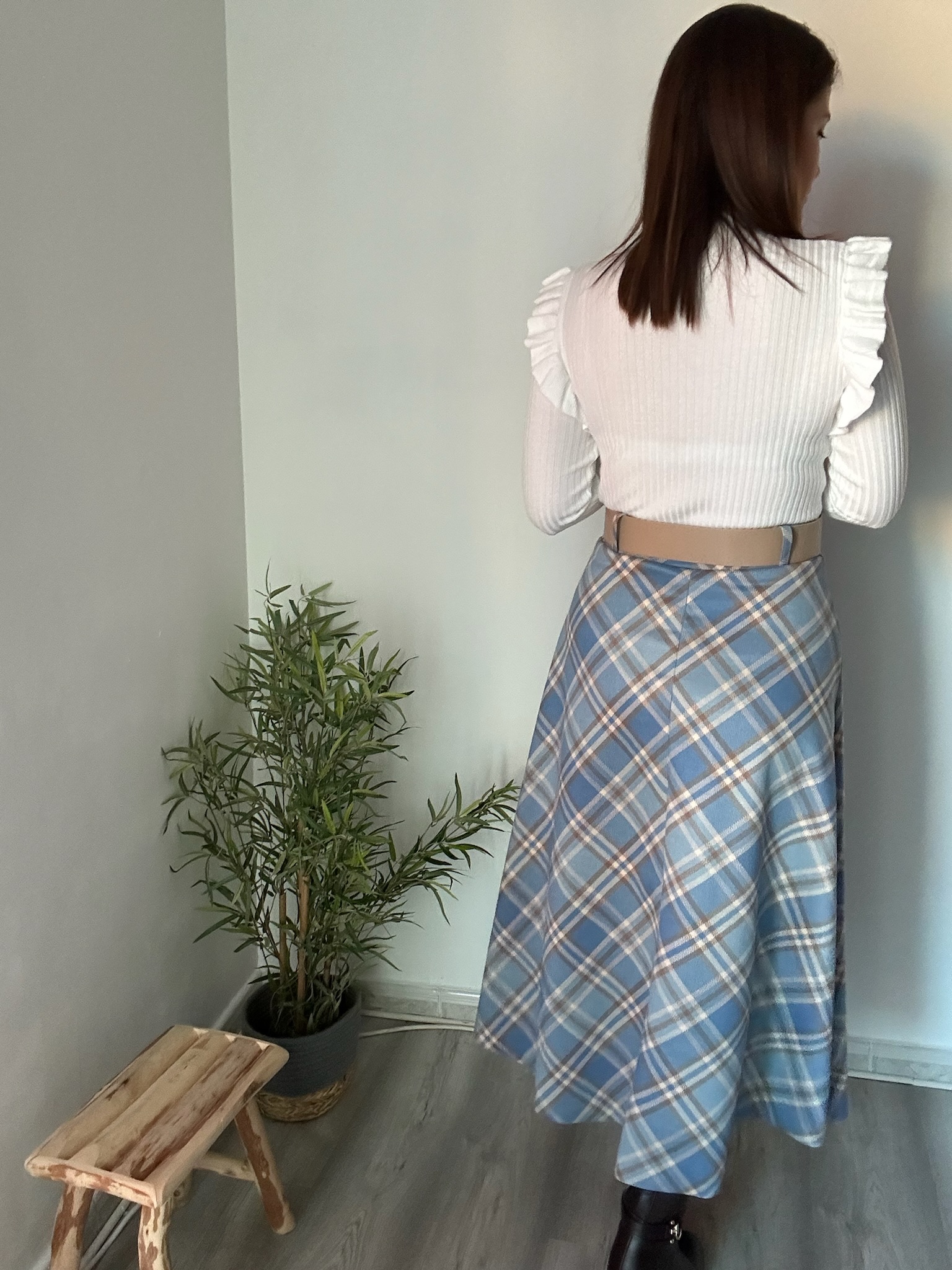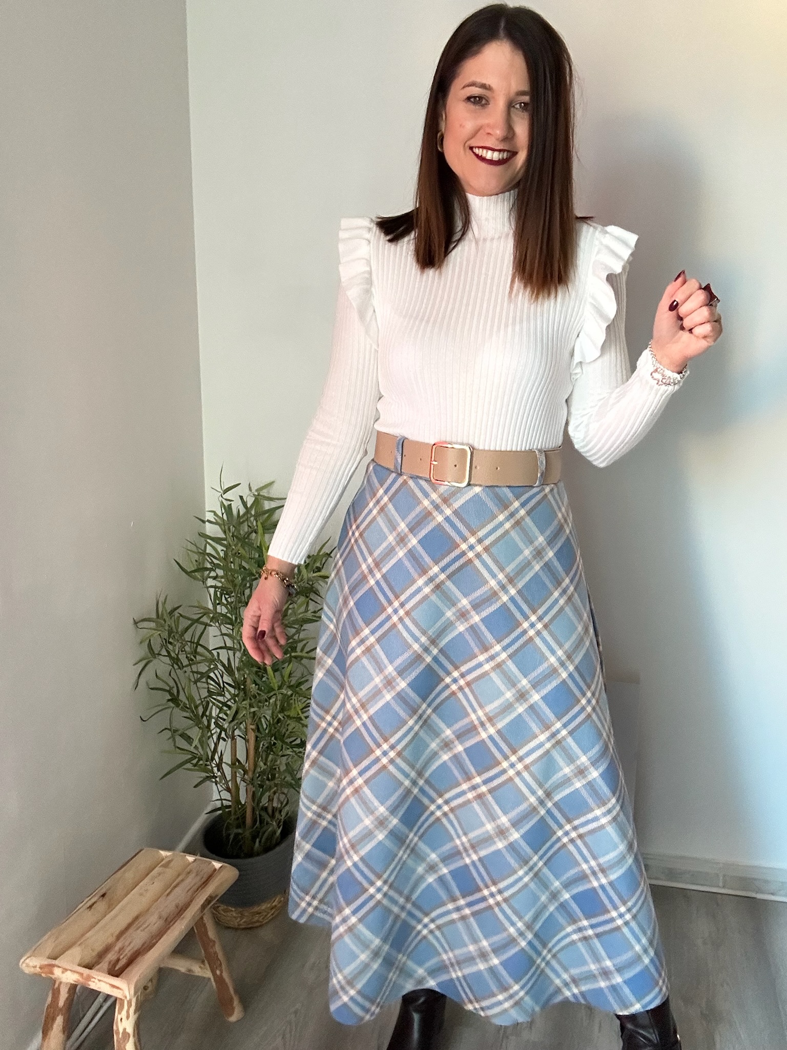 Falda de ante con cuadros en tonos azules, beige y camel. Corte midi de vuelo y cinturón beige con hebilla dorada incluido. Talla única, adaptable de la 34 a la 42. Cómoda, elástica y muy favorecedora.