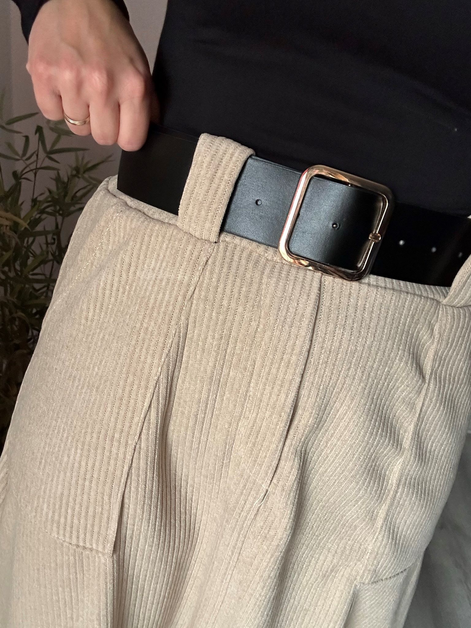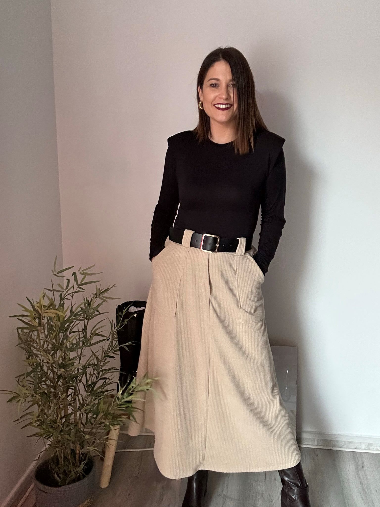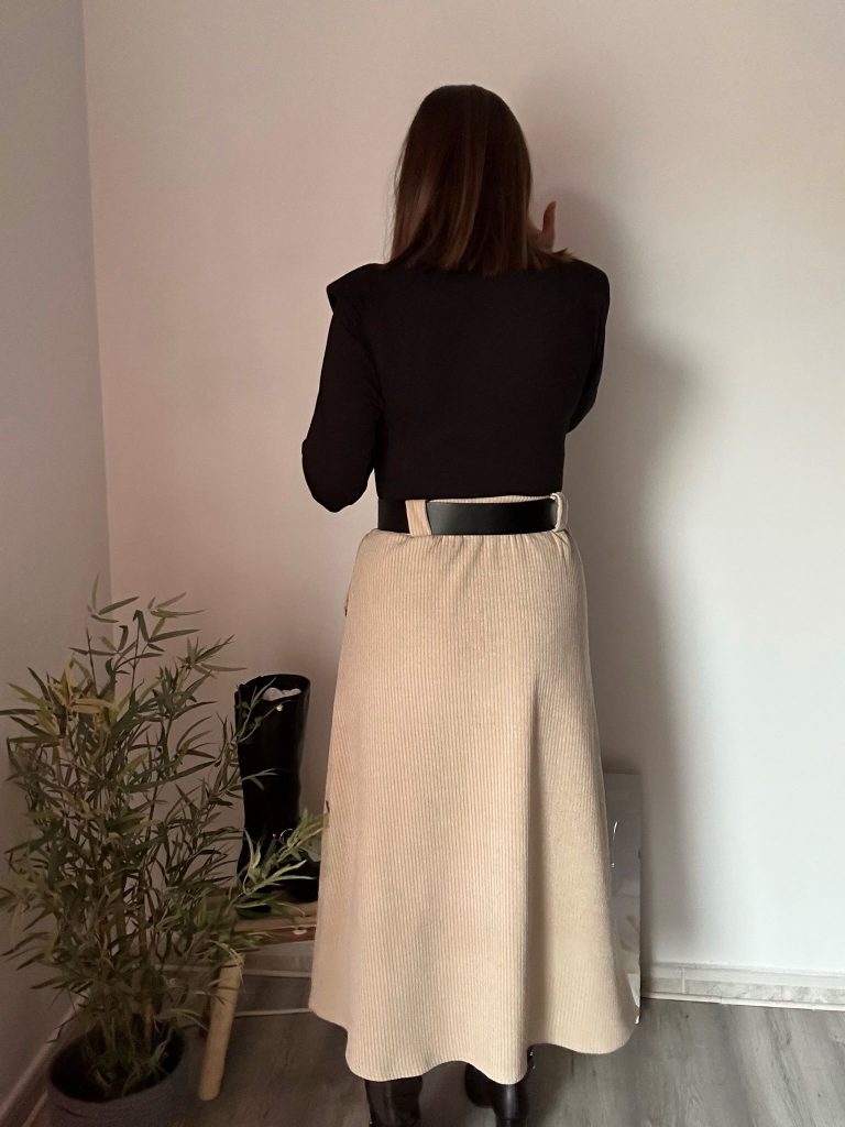 Falda de pana beige con bolsillos laterales, corte midi y cinturón negro con hebilla dorada. Su cintura elástica la hace muy cómoda y favorecedora.