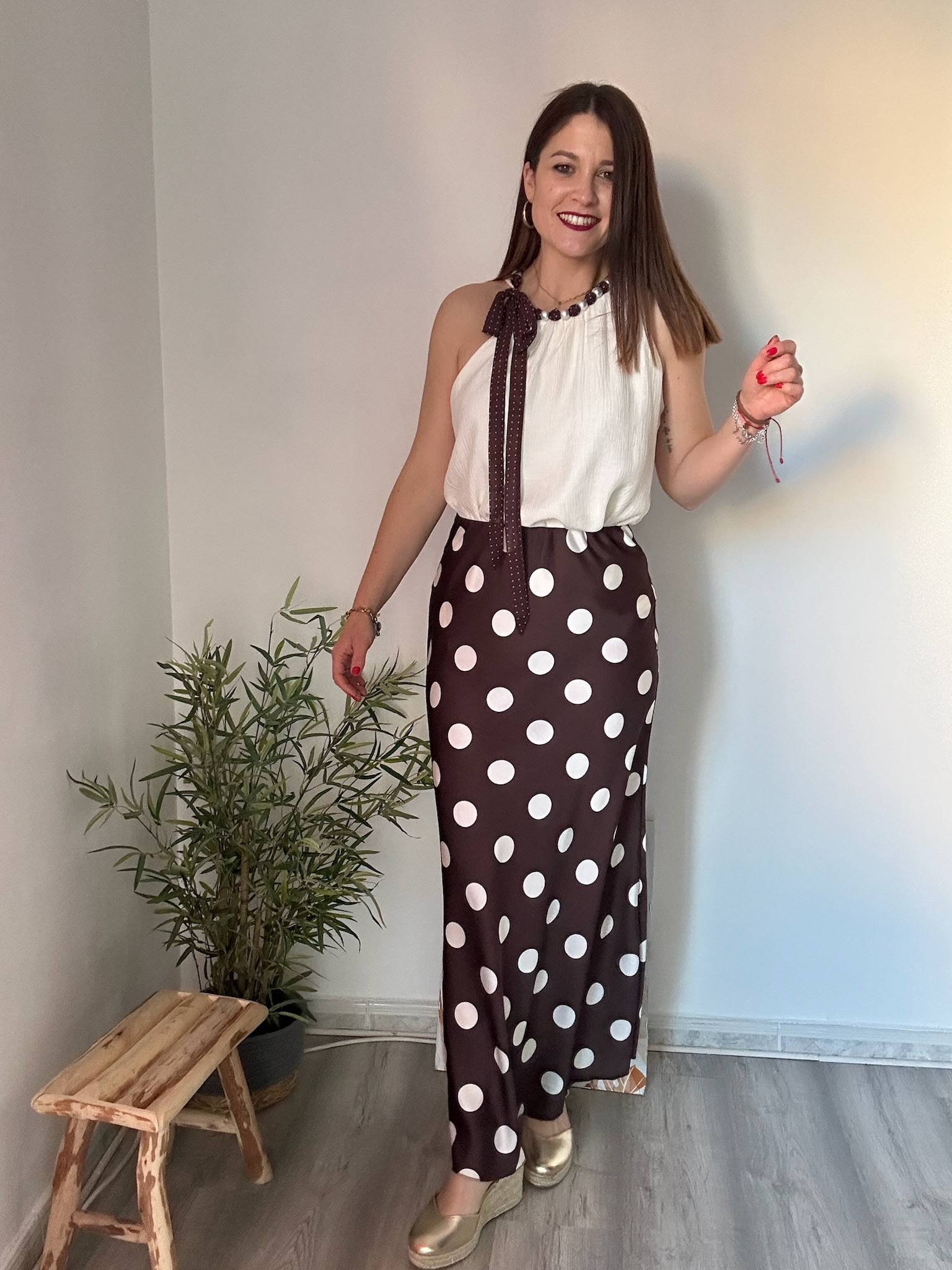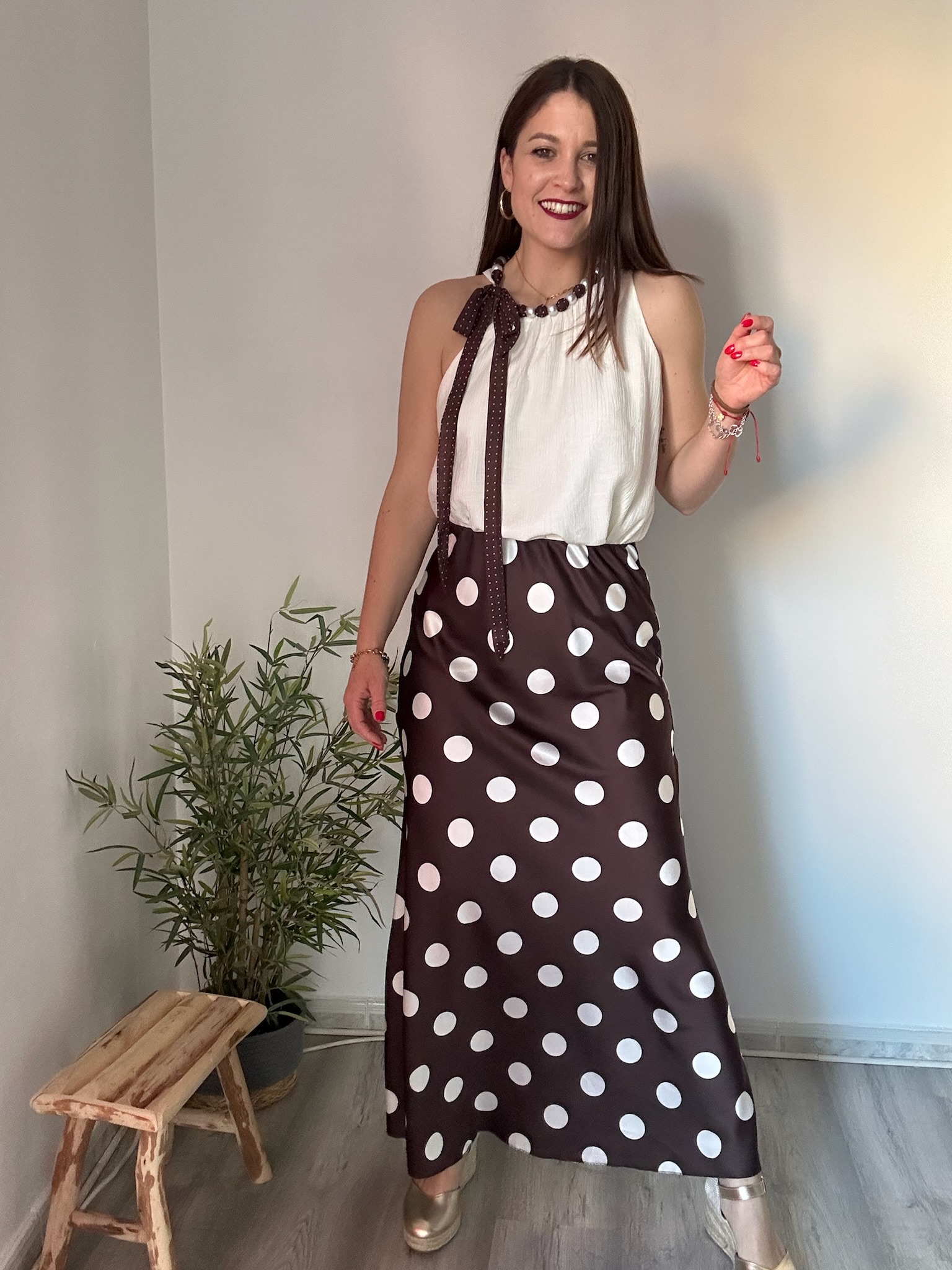 El estampado de lunares grandes en color blanco sobre fondo marrón crea un contraste moderno y llamativo que nunca pasa de moda. Su caída ligera estiliza la silueta, aportando movimiento y un acabado muy favorecedor.
