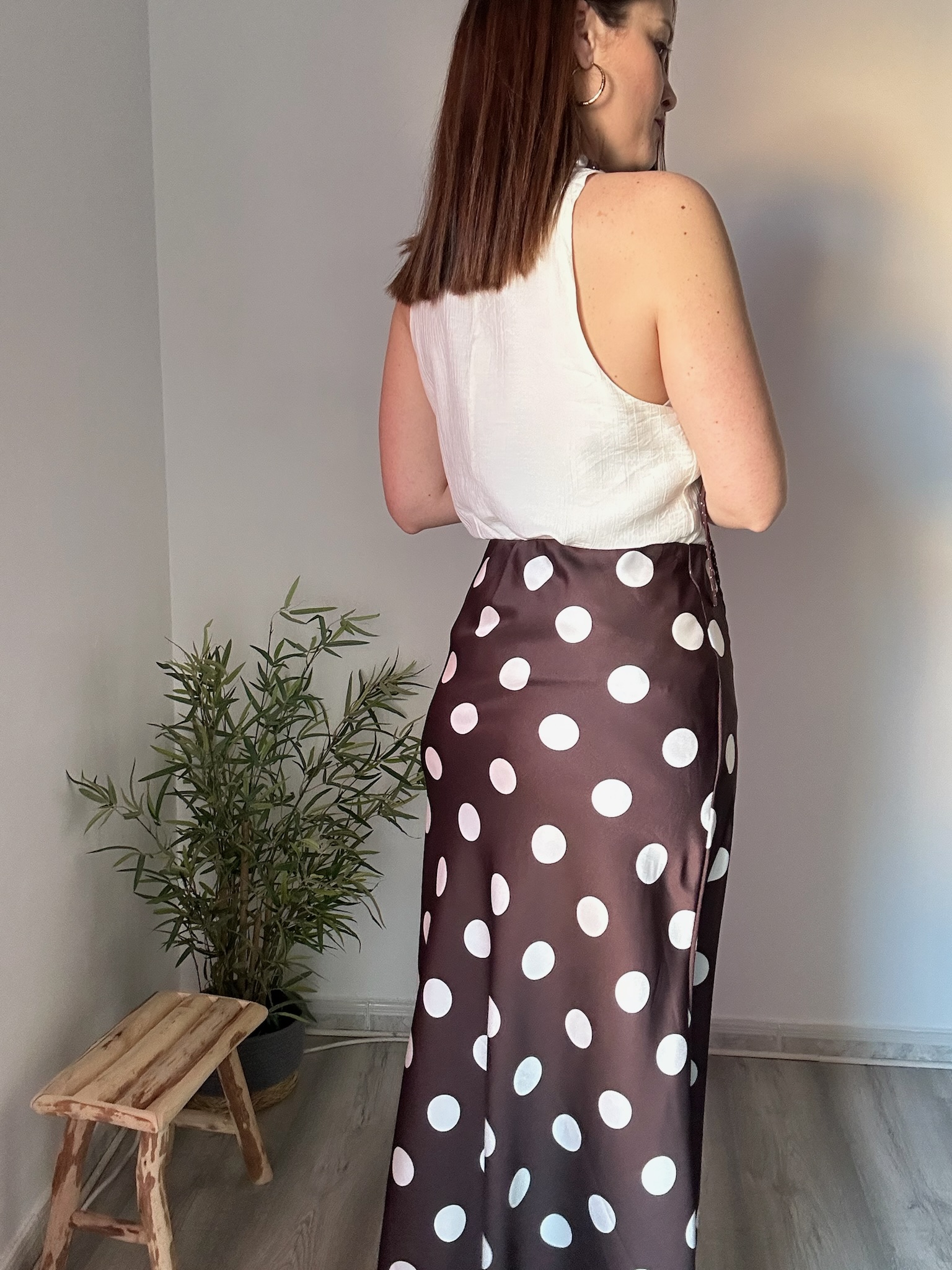 La falda larga de raso marrón con lunares blancos para mujer es una prenda elegante, versátil y perfecta para cualquier temporada. Su diseño fluido y femenino, junto con el acabado satinado del raso, aporta un toque sofisticado ideal tanto para looks diarios como para ocasiones especiales.
