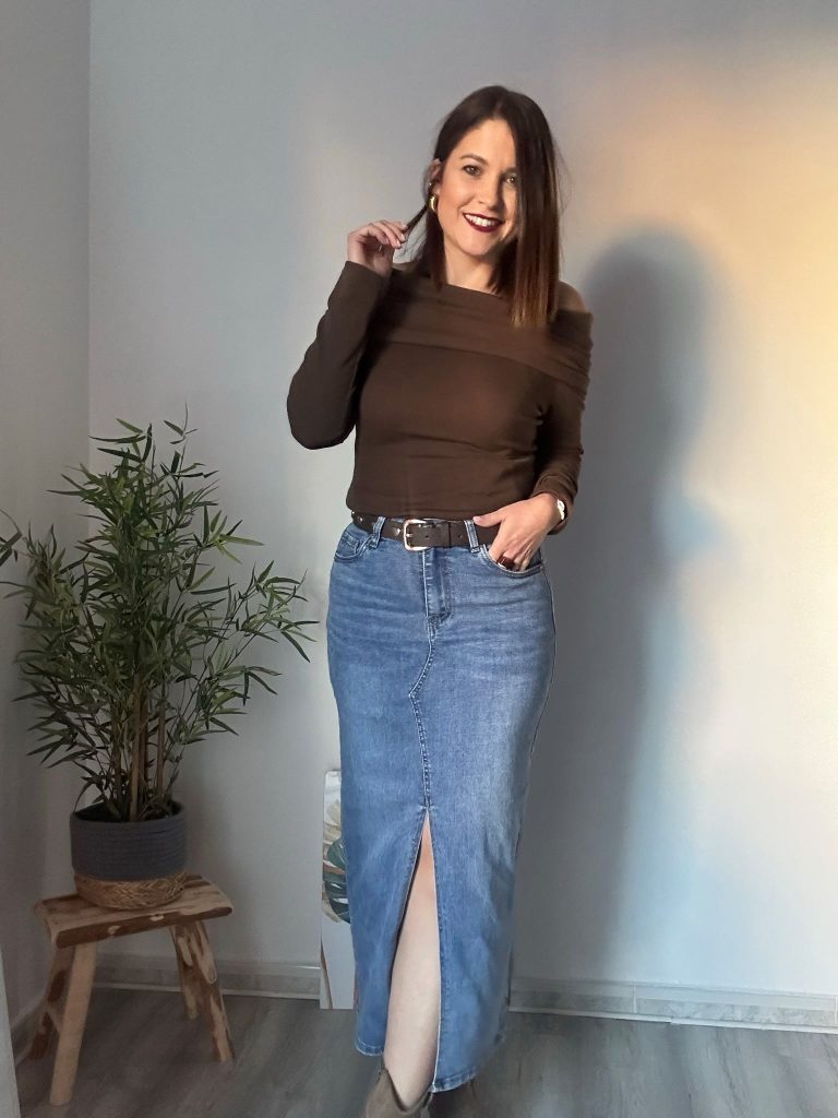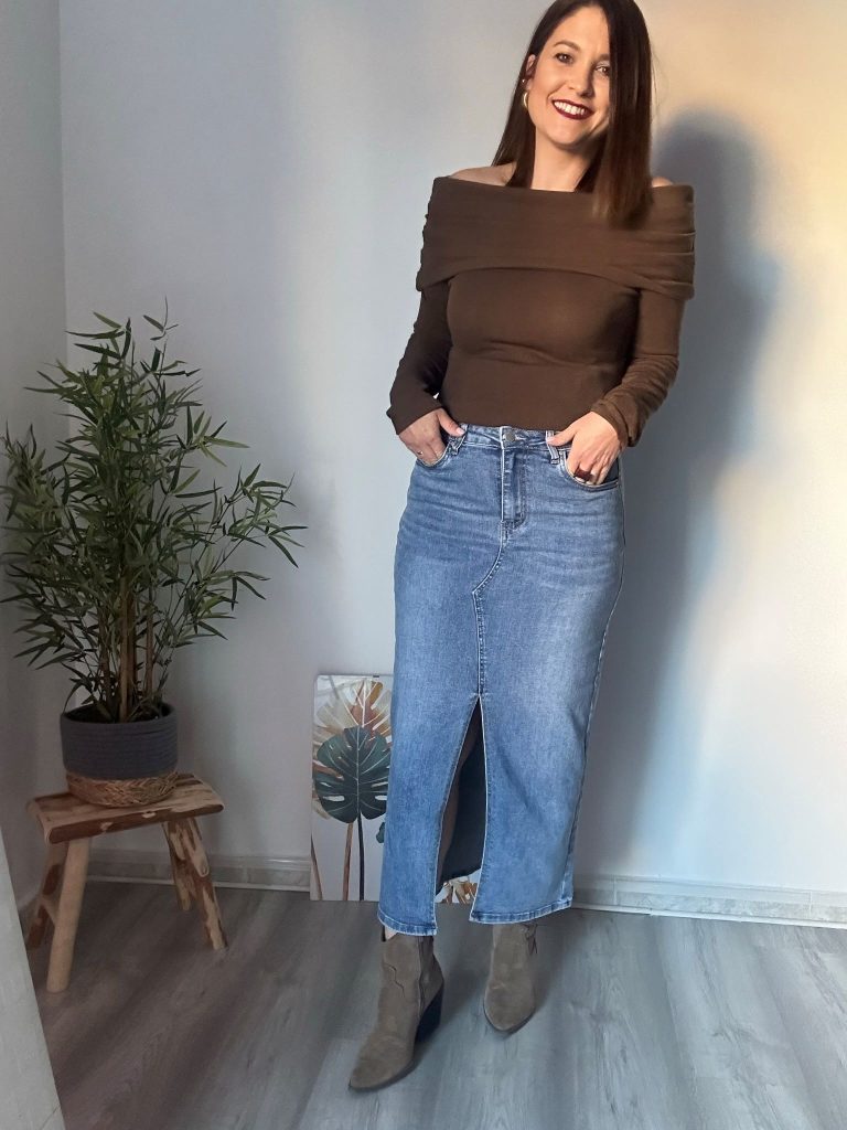 La falda larga vaquera en color claro con raja delantera de La Boutique de Virgo es una prenda versátil, femenina y actual que se ha convertido en un básico imprescindible para cualquier temporada. Su diseño de corte recto y su apertura delantera aportan comodidad y movimiento, al mismo tiempo que estilizan la figura con un aire moderno y favorecedor.