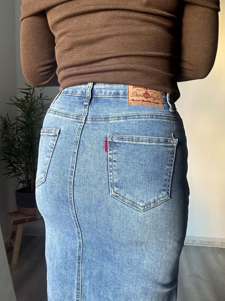 El denim claro es perfecto para combinar con una gran variedad de prendas, desde una camiseta básica y deportivas para un look casual, hasta una blusa elegante con sandalias o botines para un estilo más sofisticado. Gracias a su versatilidad, esta falda puede adaptarse tanto a planes de día como a ocasiones más especiales, convirtiéndose en una prenda imprescindible dentro del armario femenino.
