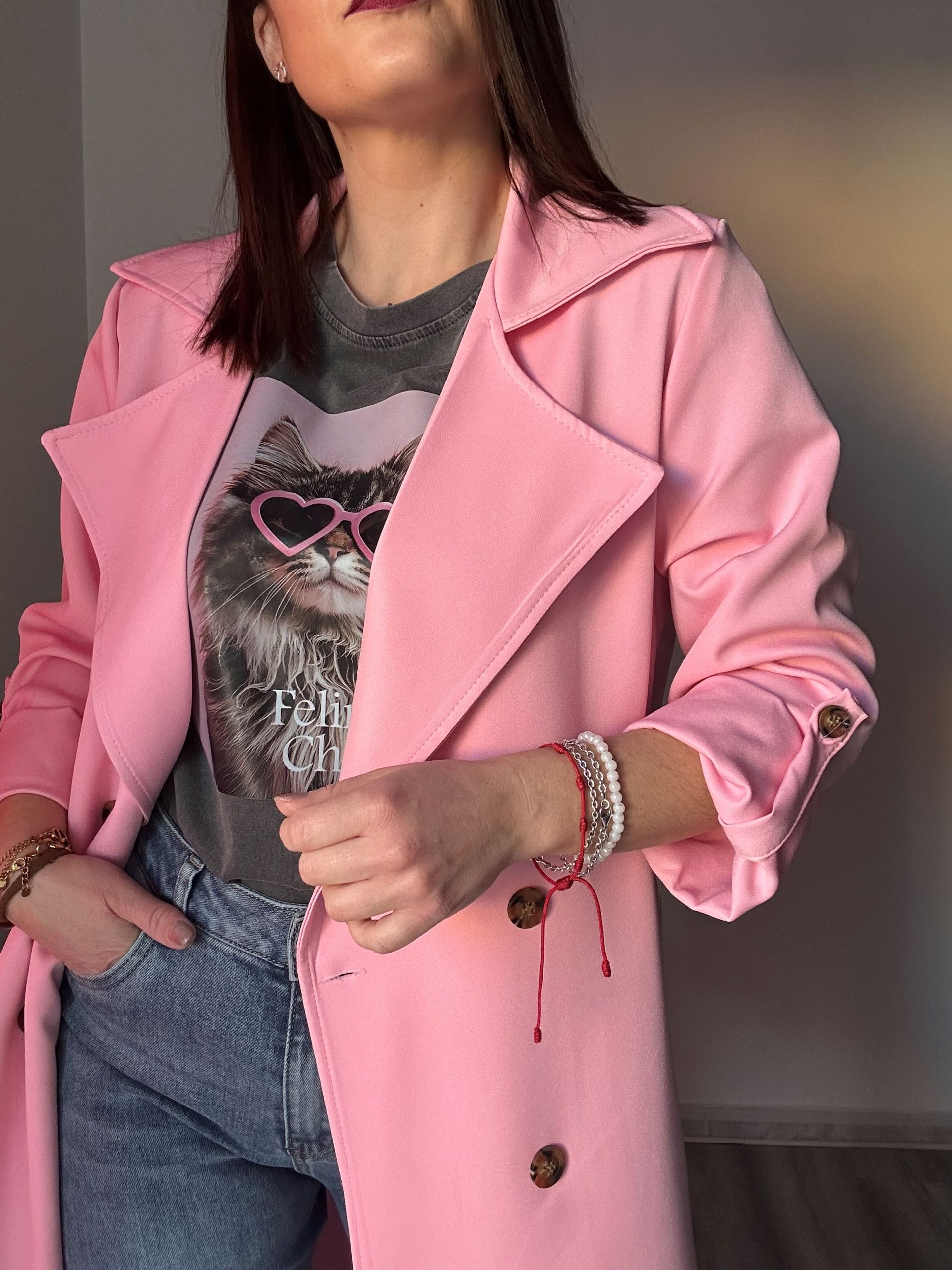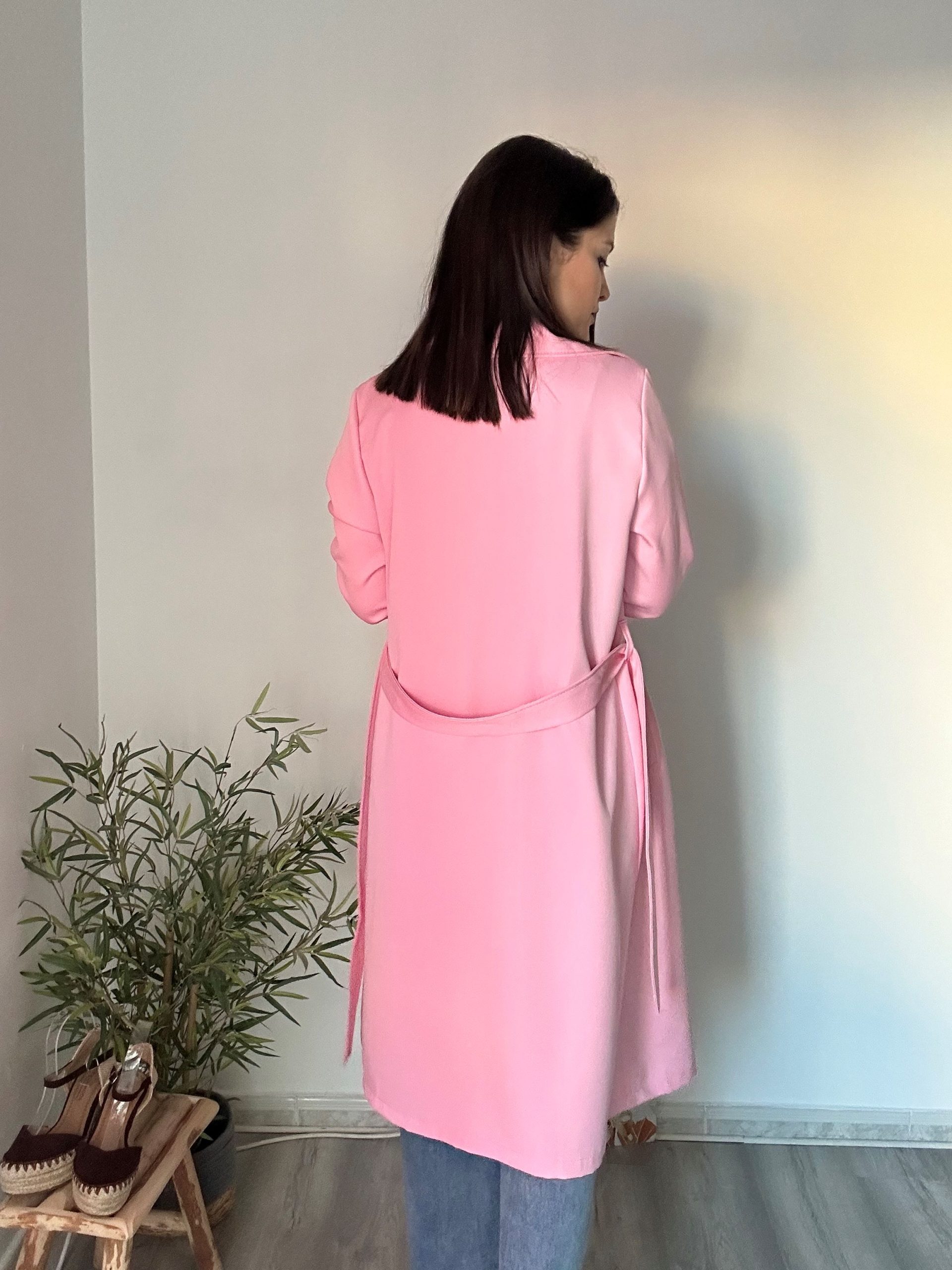 El diseño incorpora cuatro botones negros frontales que aportan contraste y un acabado moderno. Además, cuenta con dos bolsillos laterales funcionales, ideales para aportar practicidad al día a día. El cinturón del mismo tejido permite ajustar la prenda a la cintura, estilizando la figura y ofreciendo diferentes opciones de estilo: abierta para un look relajado o cerrada para una imagen más estructurada.