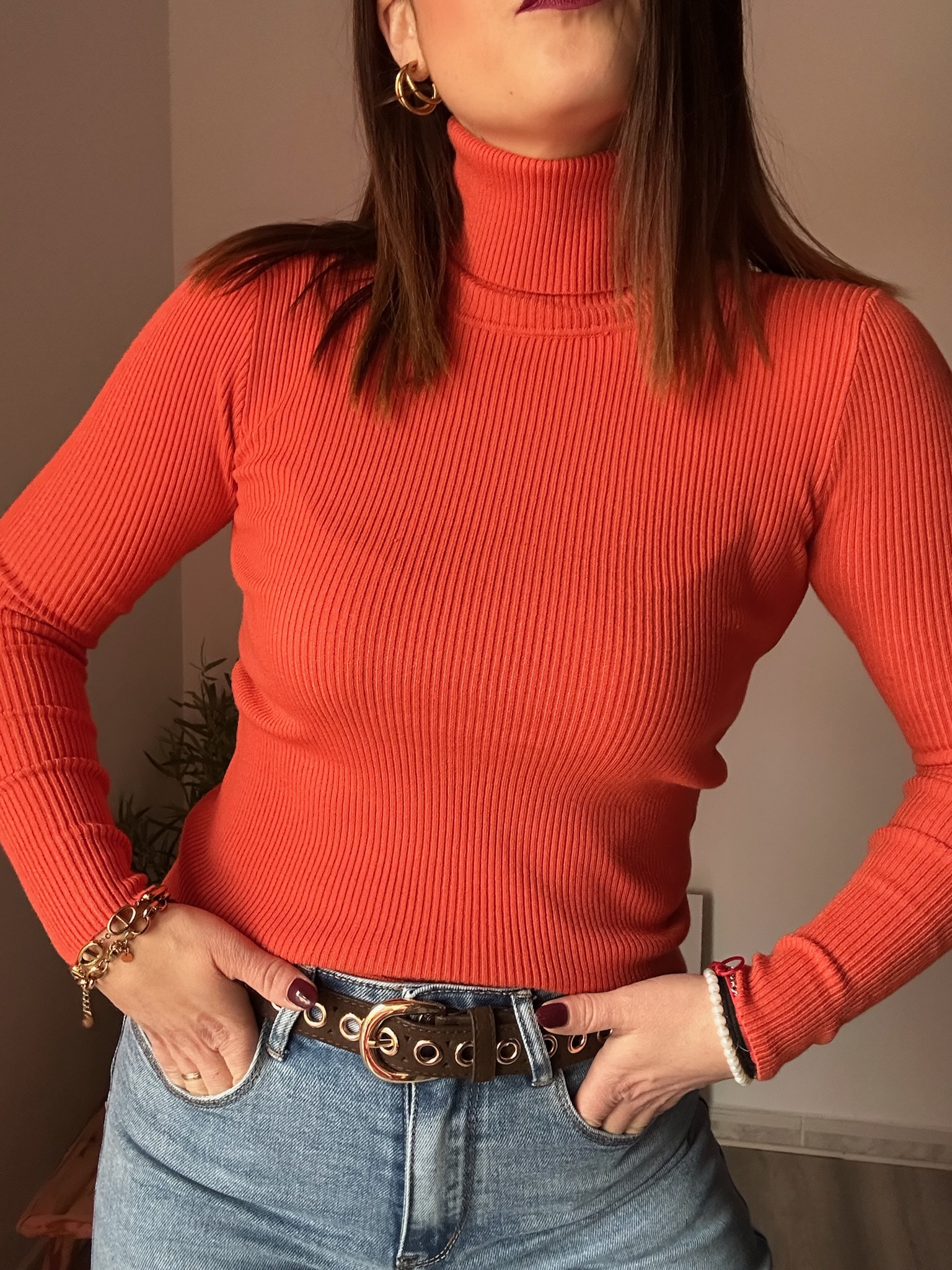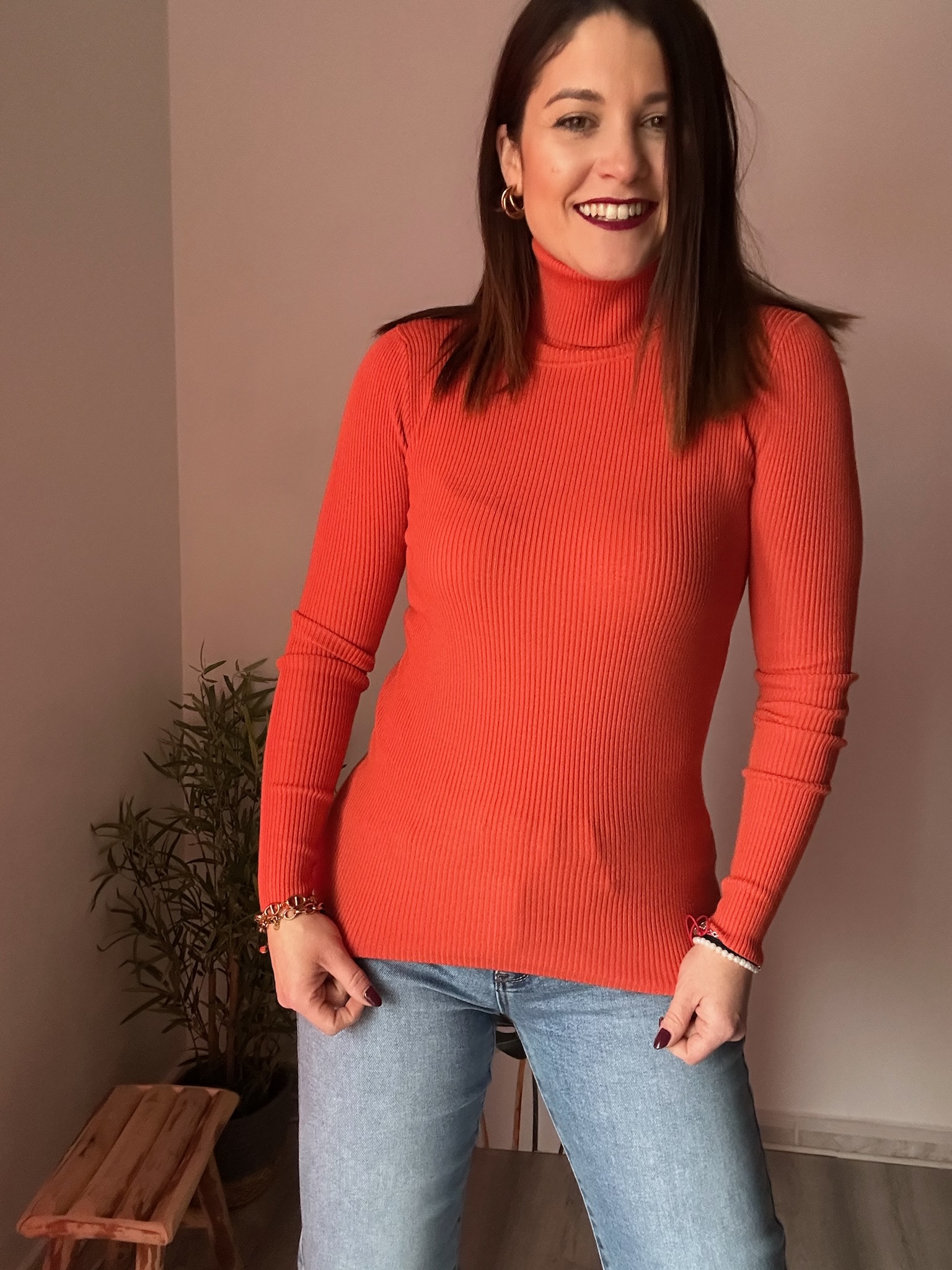 El jersey canalé naranja con cuello vuelto de La Boutique de Virgo es una prenda esencial para mujeres que buscan unir comodidad, estilo y un diseño actual en su día a día. Su corte favorecedor y su acabado cuidado lo convierten en un básico imprescindible del armario femenino.