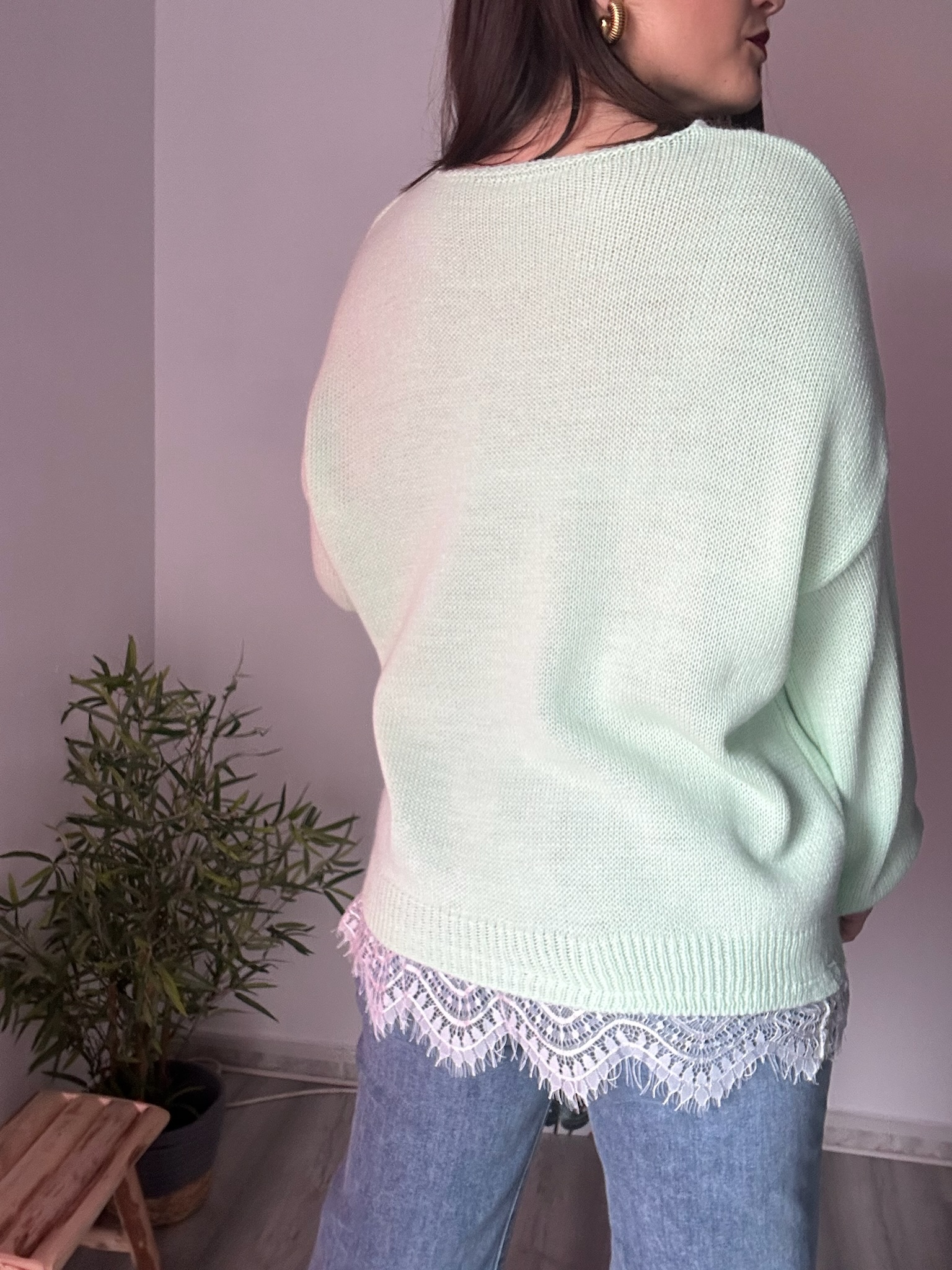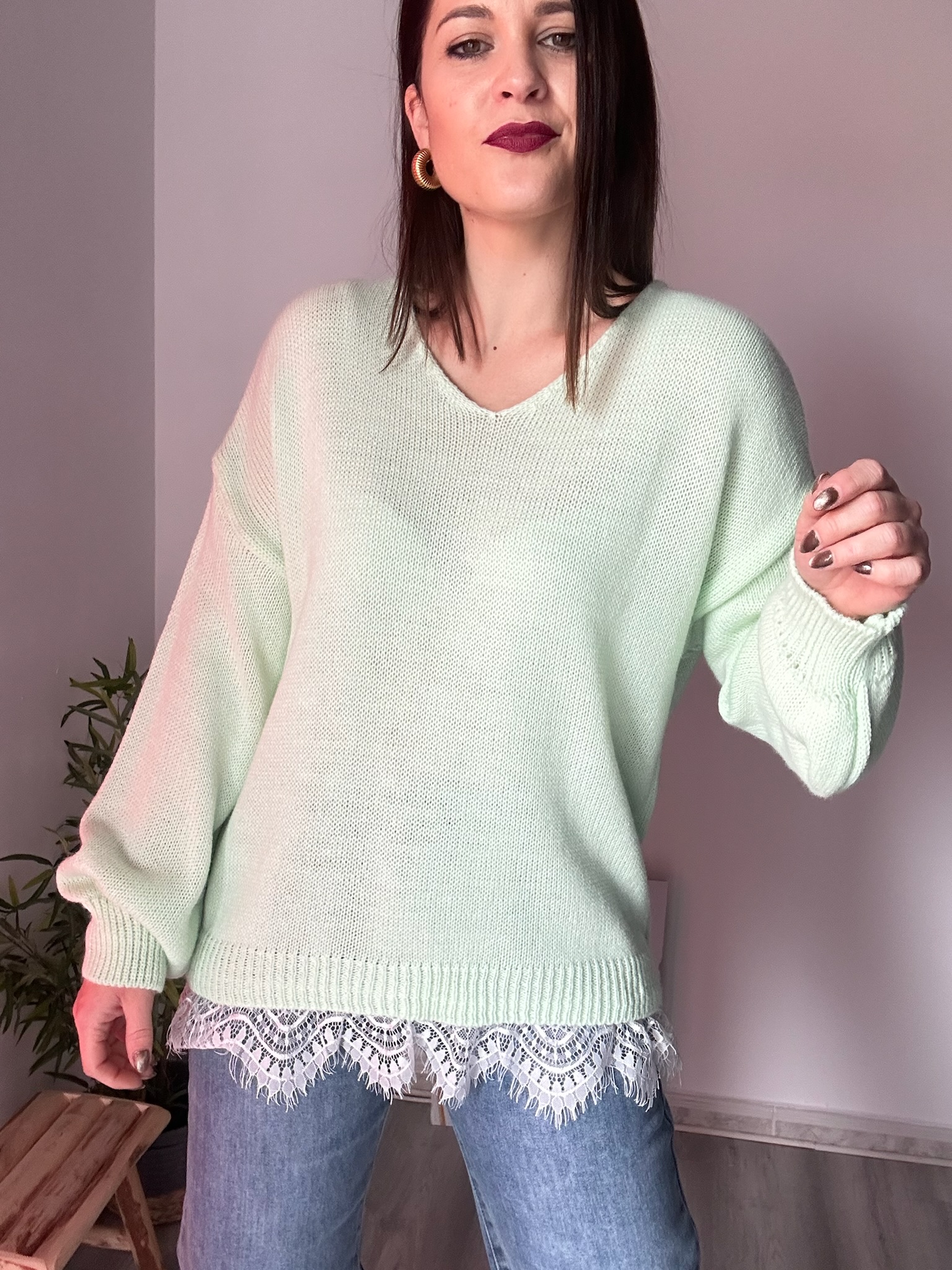 El escote suave en pico estiliza la zona del cuello y realza la silueta de forma discreta, mientras que el encaje blanco en el bajo añade un acabado romántico y sofisticado que marca la diferencia. Este detalle convierte el jersey en una pieza perfecta tanto para looks diarios como para conjuntos más cuidados.