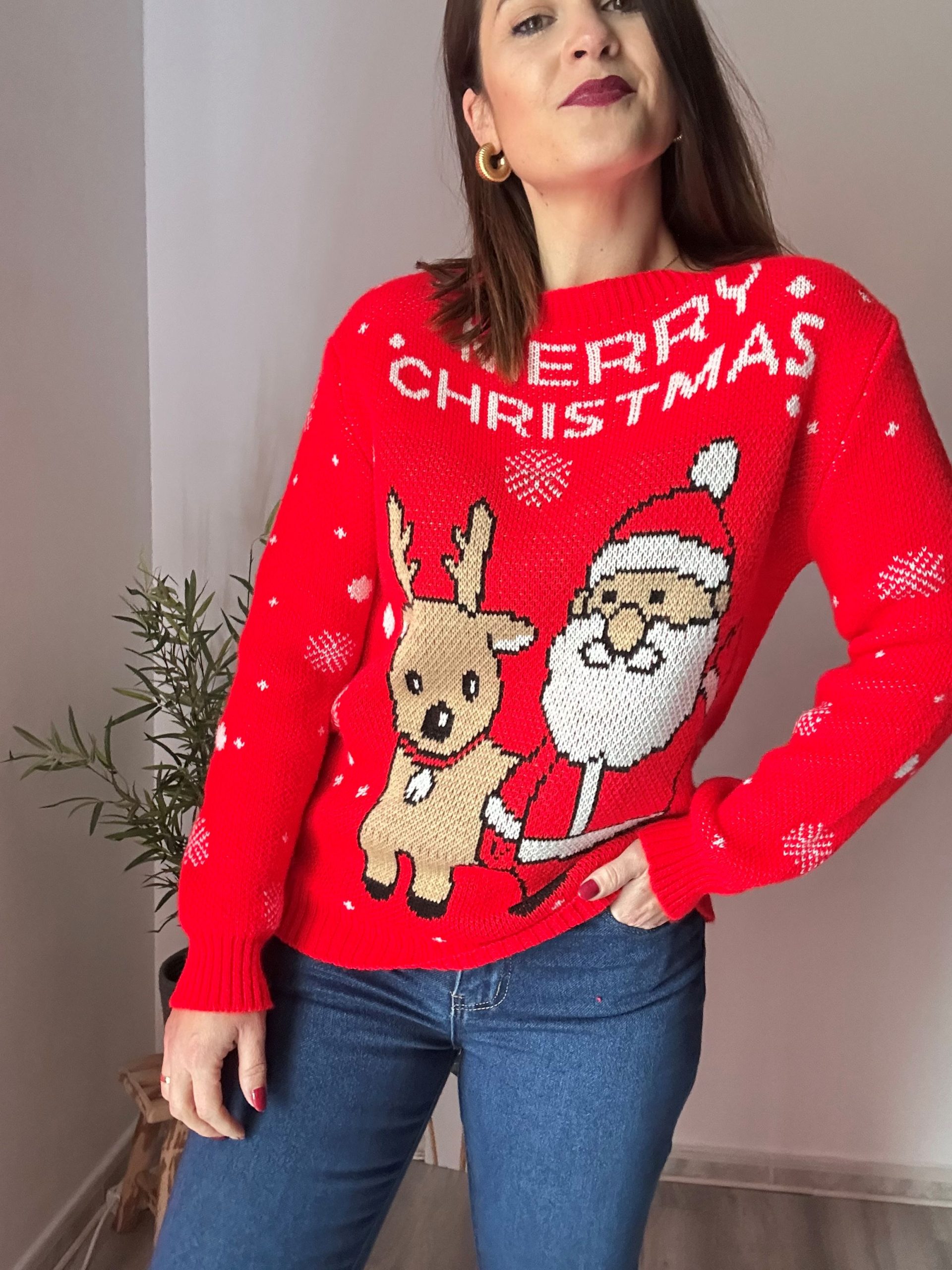 Los diferentes estampados festivos convierten estos jerséis en la opción perfecta para comidas de Navidad, reuniones familiares, eventos informales o simplemente para dar un toque especial a tu look diario durante las fiestas. Puedes combinarlos fácilmente con vaqueros, leggings, faldas o incluso llevarlos con pantalones de vestir para un estilo más sofisticado y divertido a la vez.