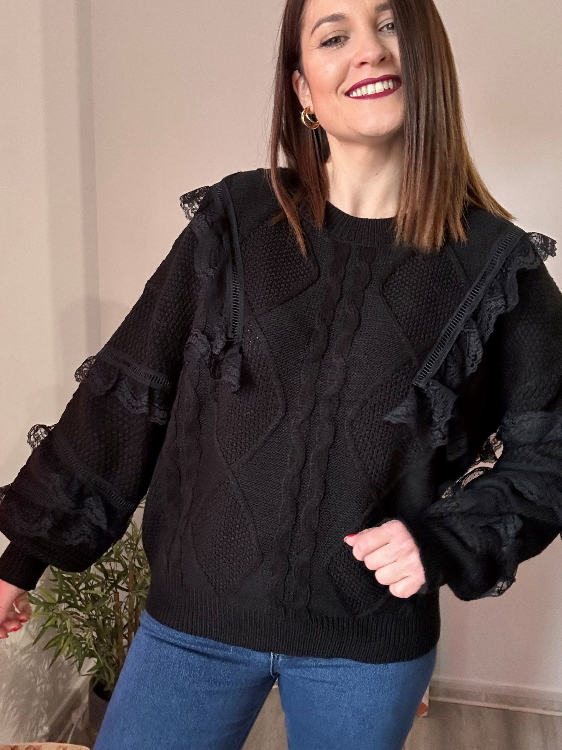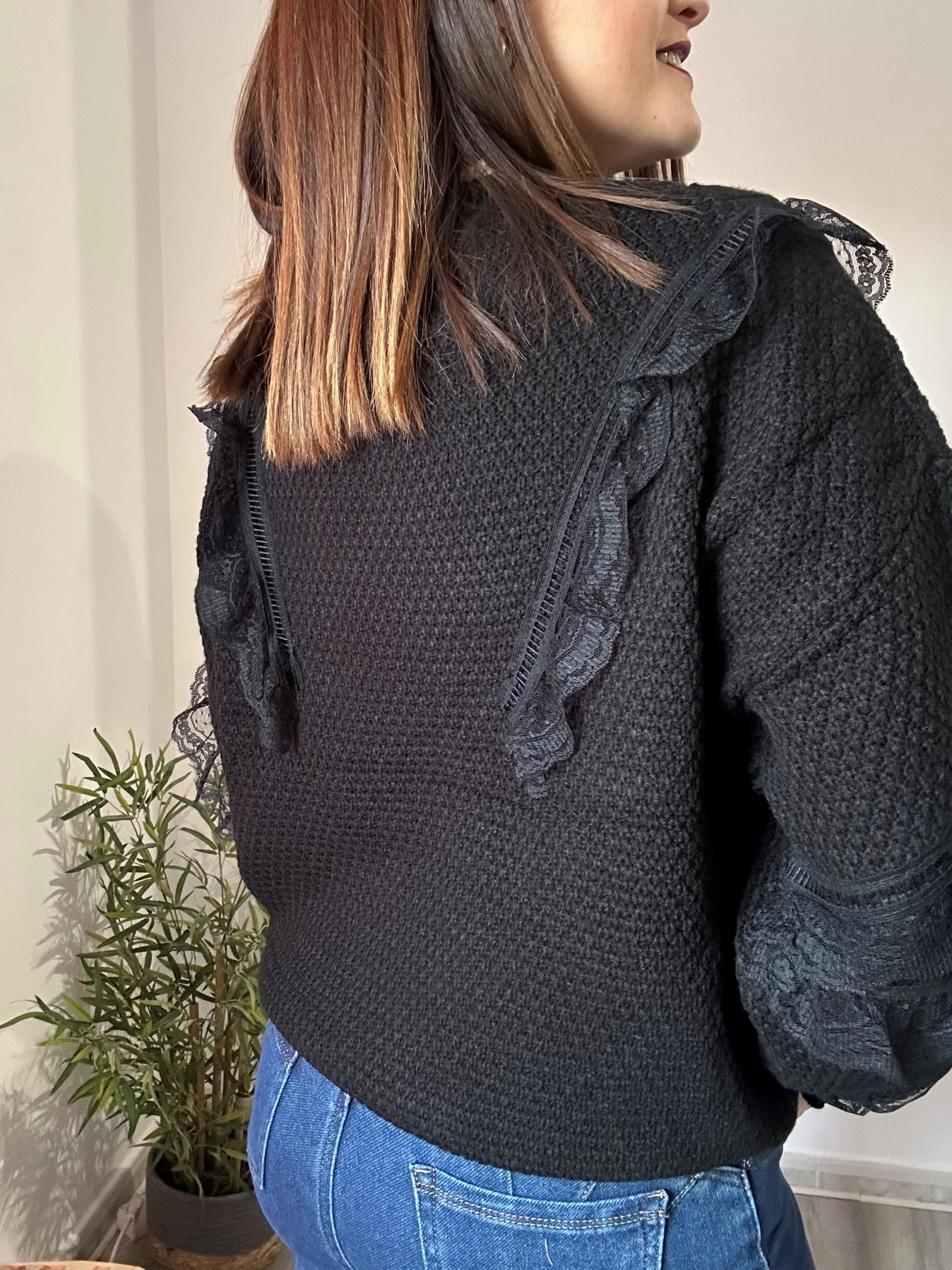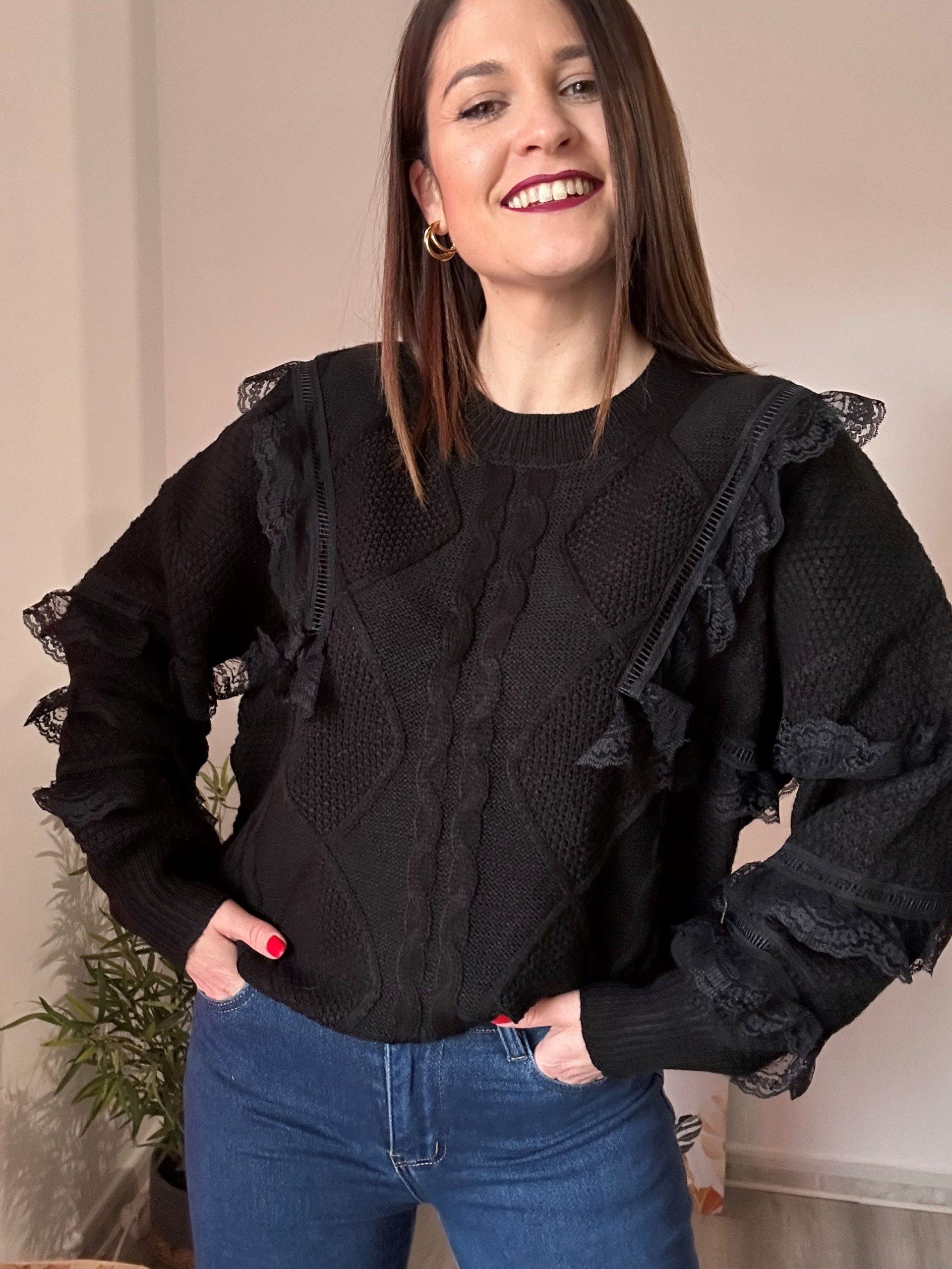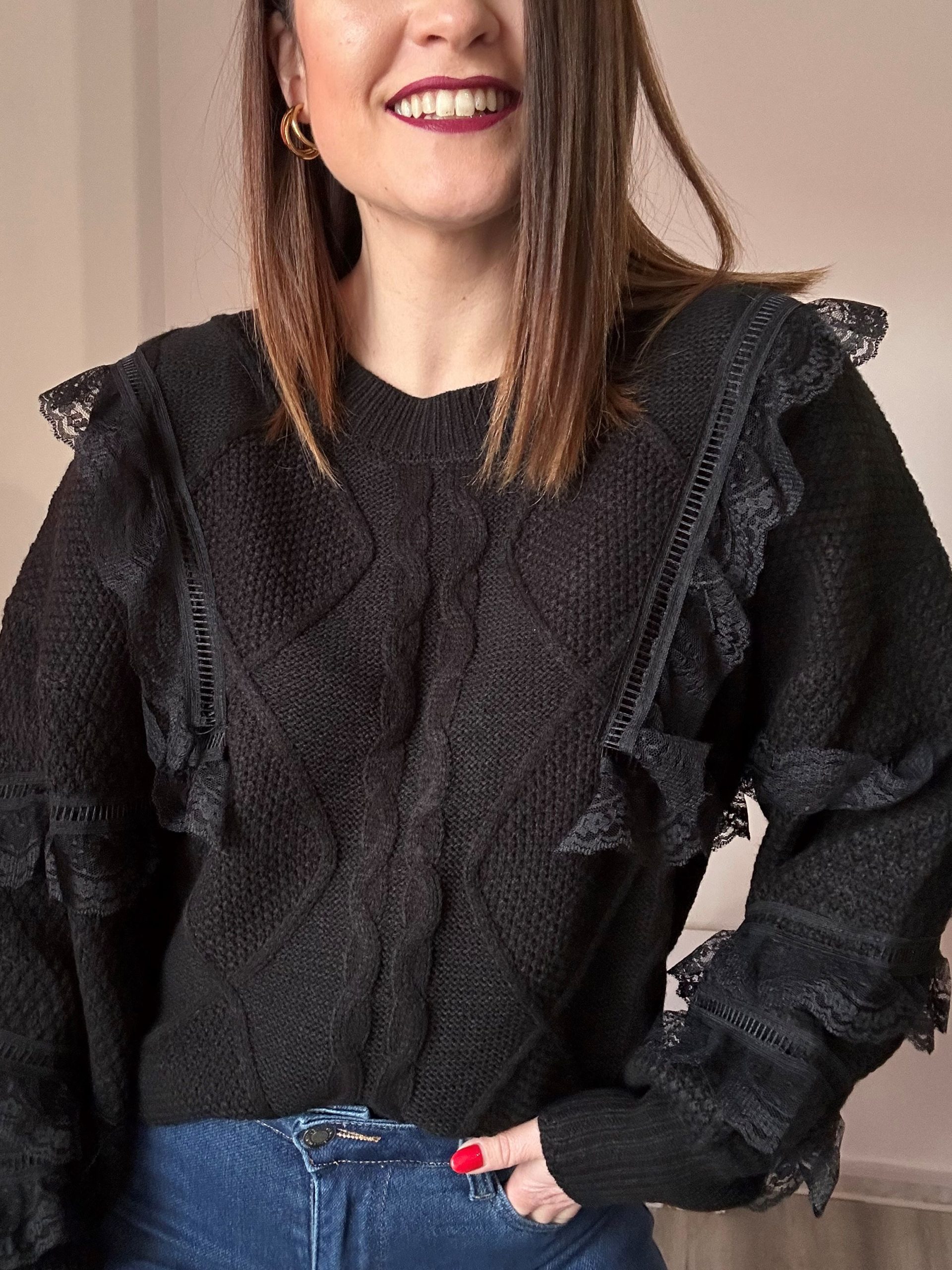 Disponible tanto en tienda física como en tienda online de La Boutique de Virgo, este jersey negro con encaje es una apuesta segura para quienes buscan una prenda cómoda, calentita y con un toque elegante que marque la diferencia.