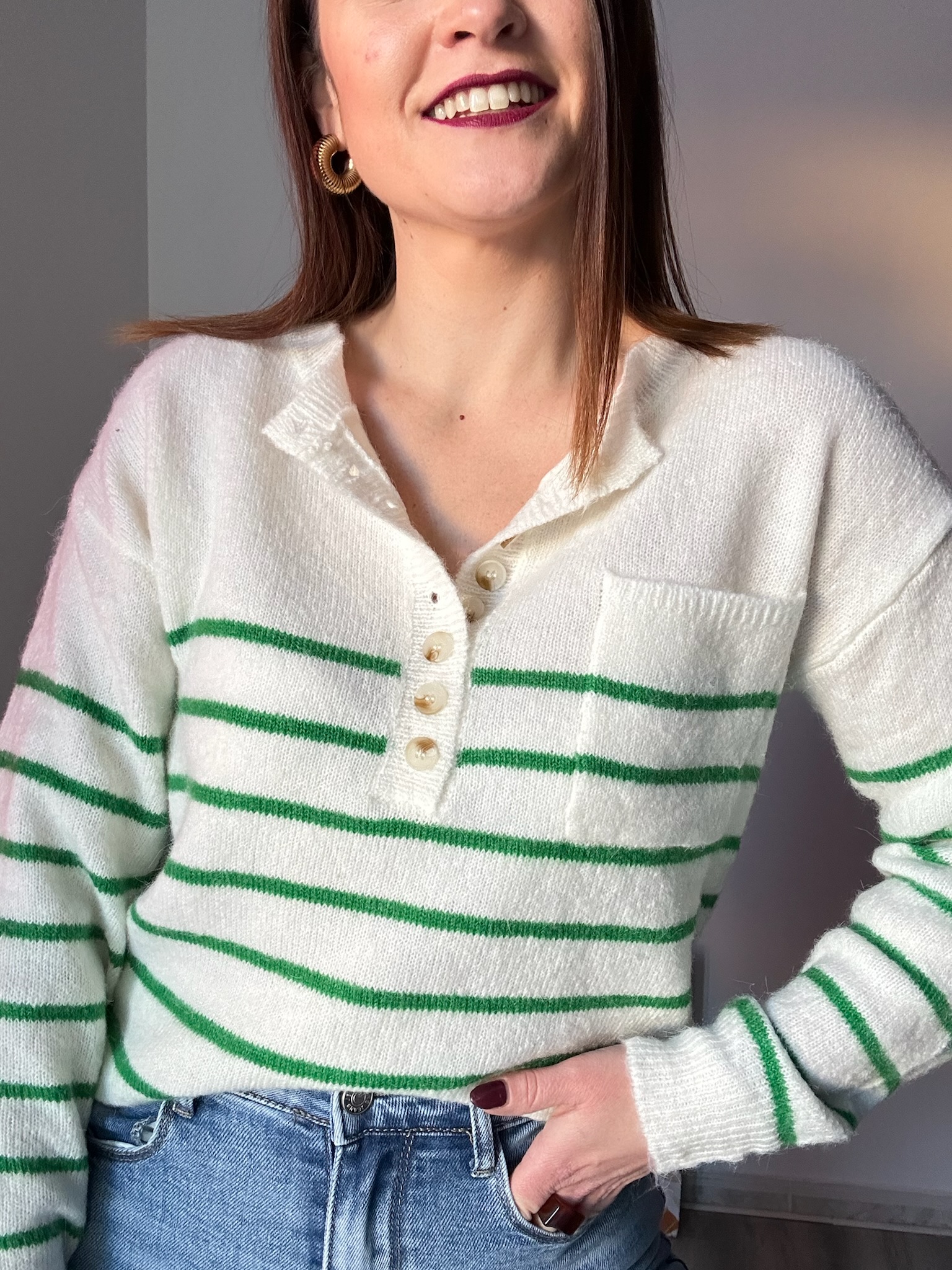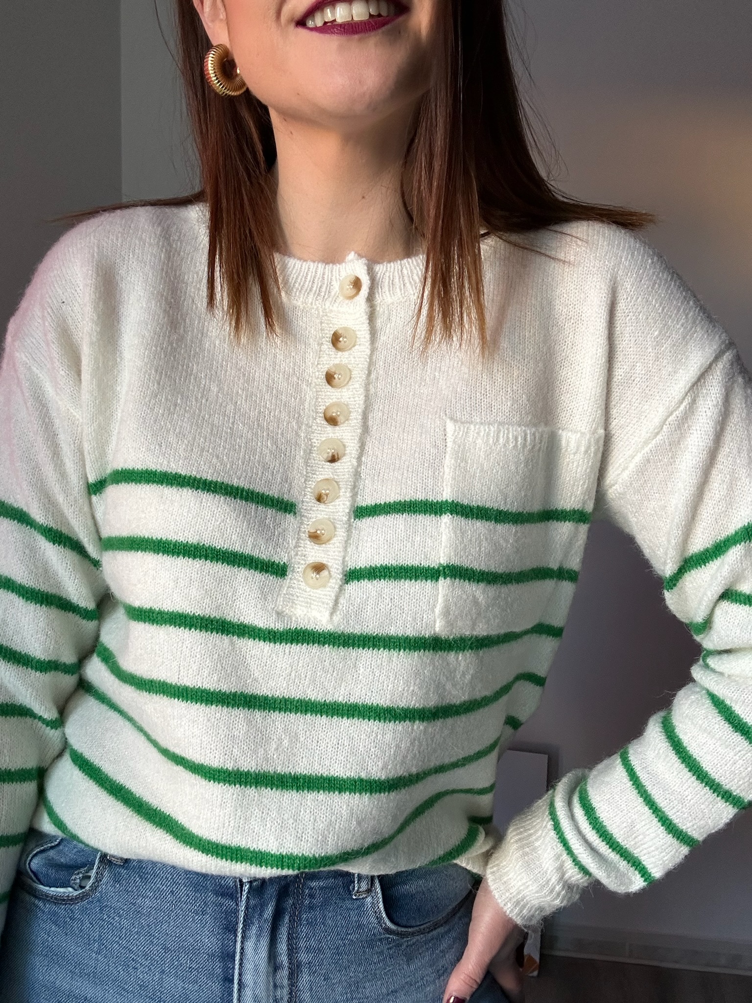 Este jersey destaca por su detalle de botones en color caramelo, totalmente funcionales y que se pueden desabrochar, lo que permite llevarlo cerrado para un estilo más clásico o ligeramente abierto para un aire más desenfadado. Es una prenda pensada para adaptarse a diferentes estilos y momentos del día.