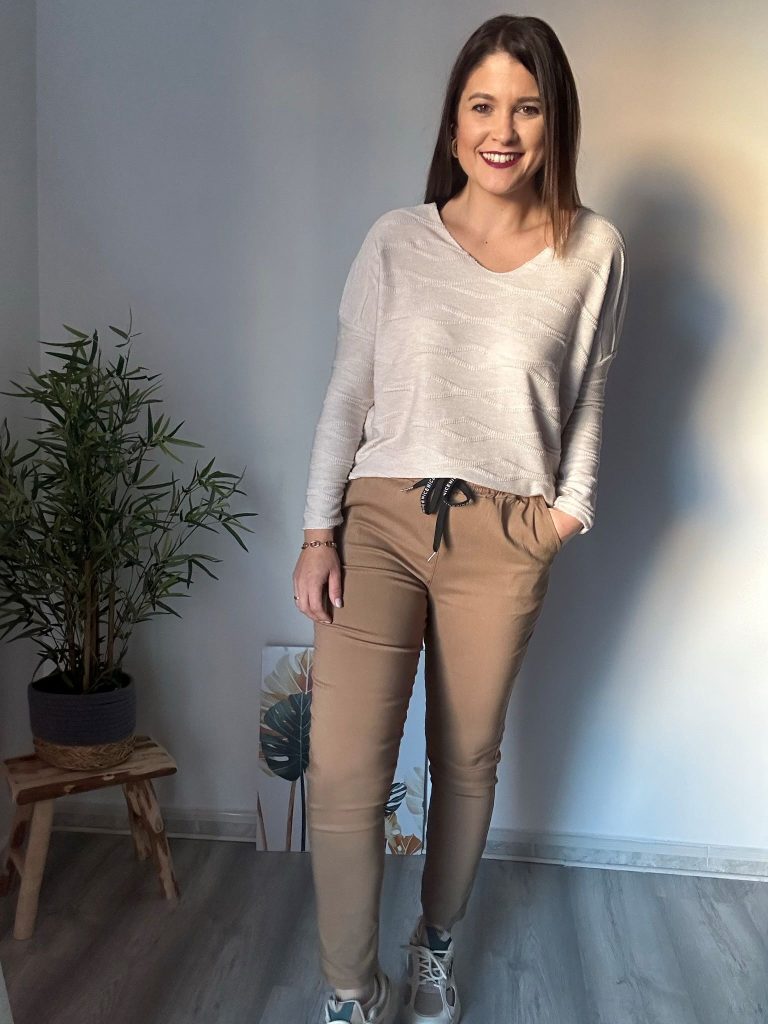 El jersey escote a pico en color arena de La Boutique de Virgo es una prenda imprescindible para quienes buscan un estilo femenino, elegante y atemporal. Confeccionado en un tejido suave y de gran calidad, destaca por su ligero relieve en el tejido, lo que le aporta un toque moderno y diferente que lo convierte en un básico renovado para el armario.