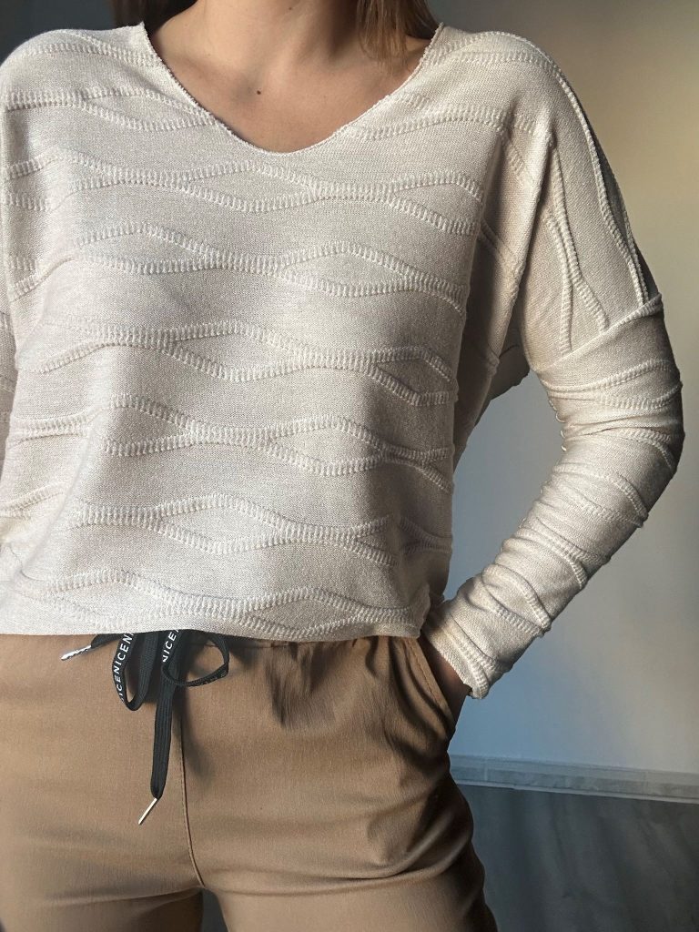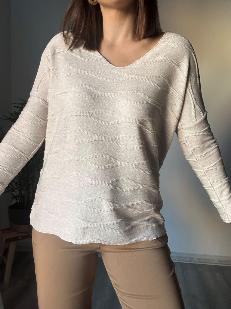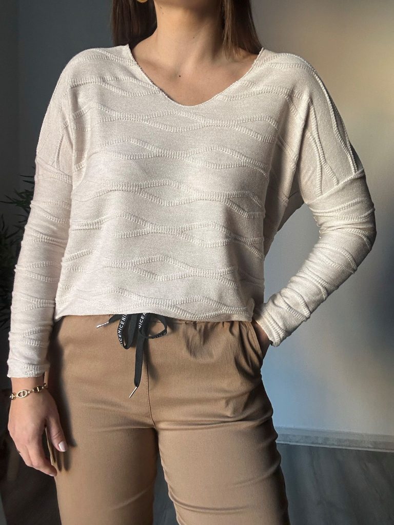 El jersey escote a pico en color arena es una prenda versátil y elegante, con relieve en el tejido y un diseño favorecedor. De talla única (36-44), se adapta cómodamente a diferentes siluetas. Ideal para looks casuales o más sofisticados, combina comodidad, estilo y modernidad en un mismo diseño.