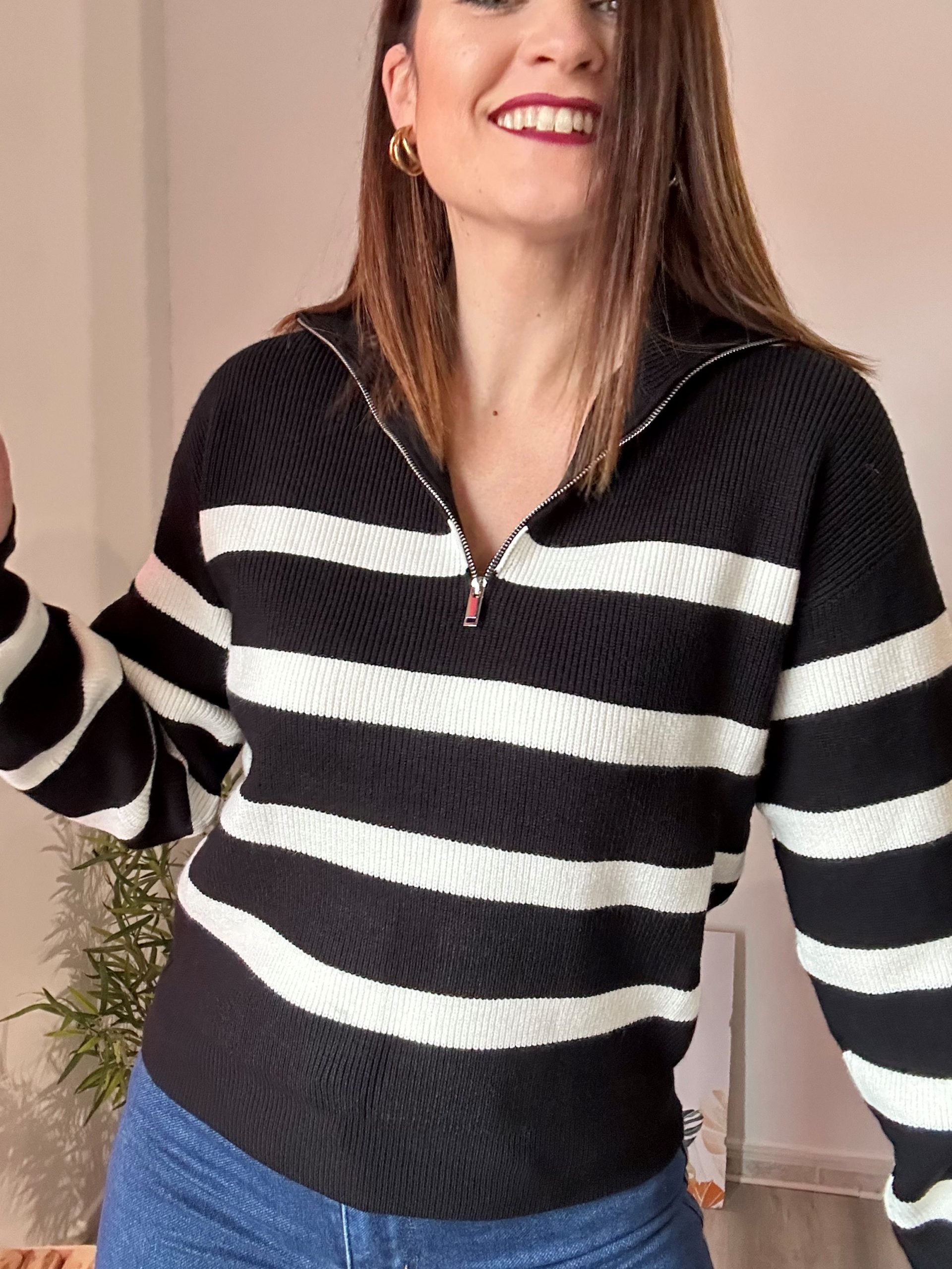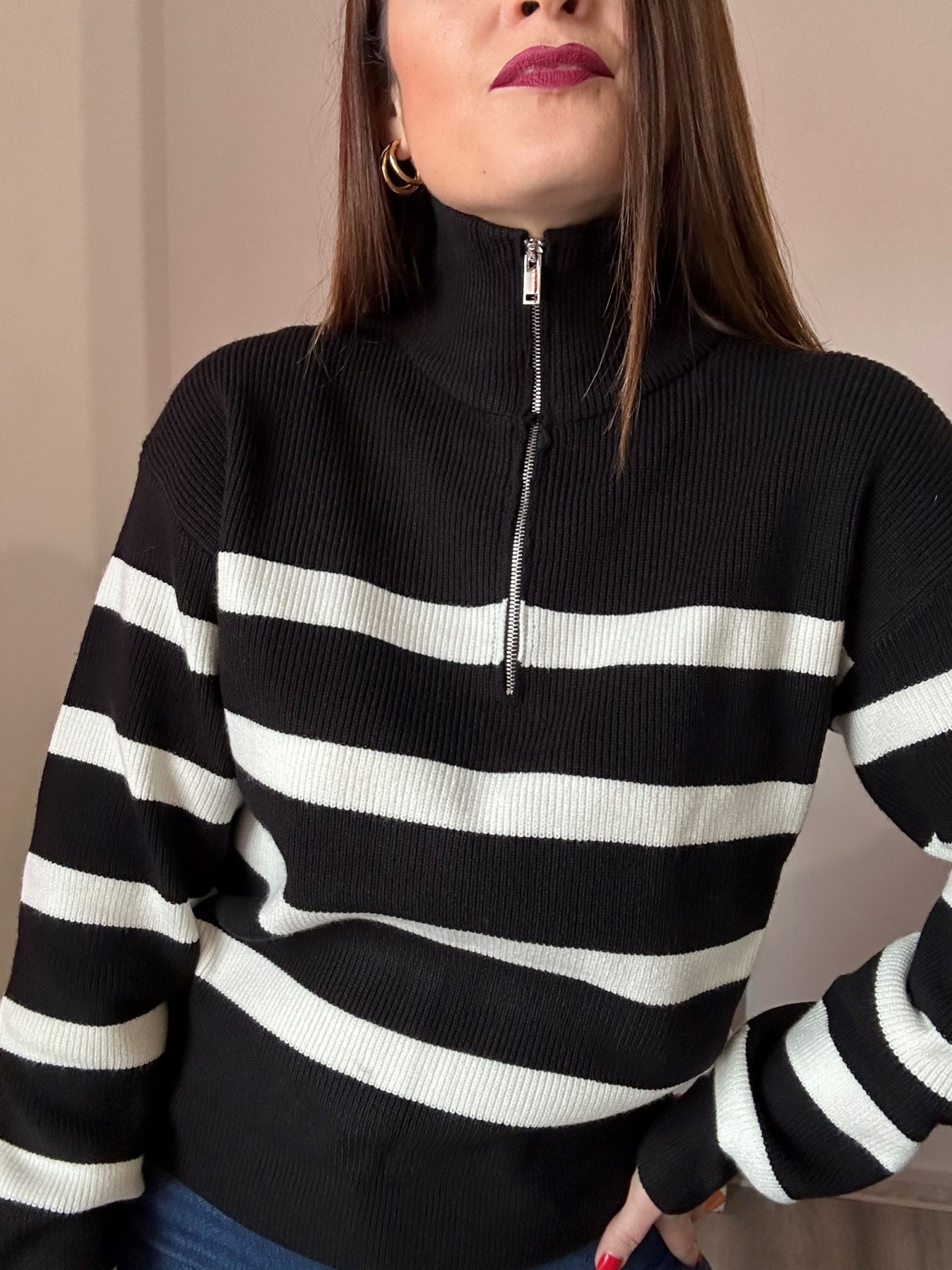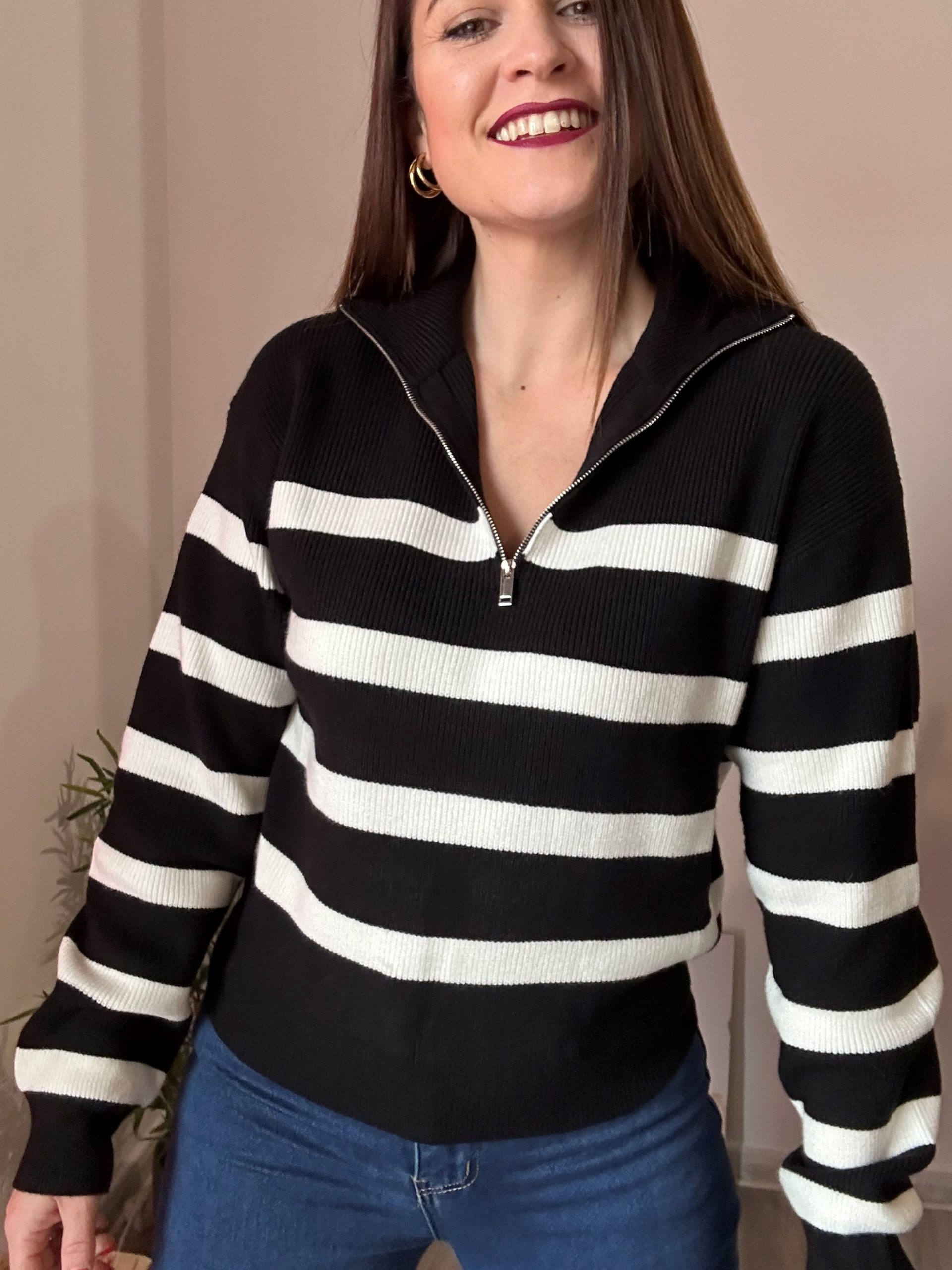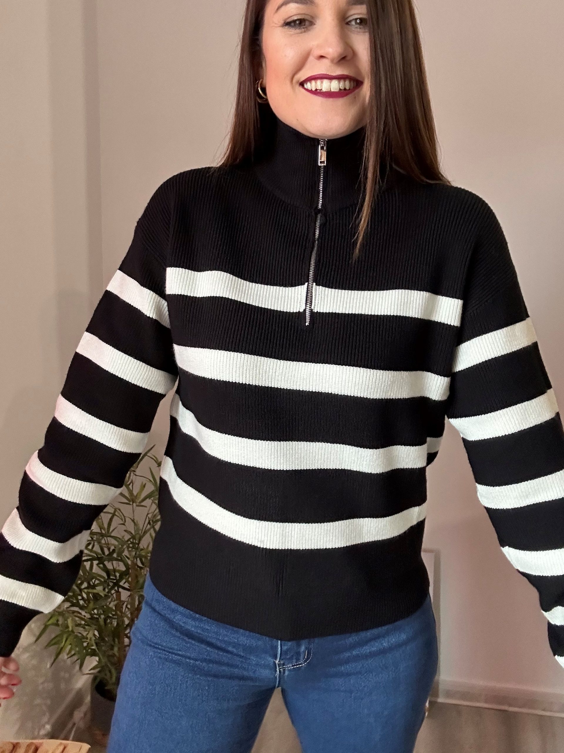 Disponible en tienda física y tienda online de La Boutique de Virgo, este jersey negro a rayas con cremallera es una opción perfecta para quienes buscan una prenda calentita, versátil y con un diseño original.